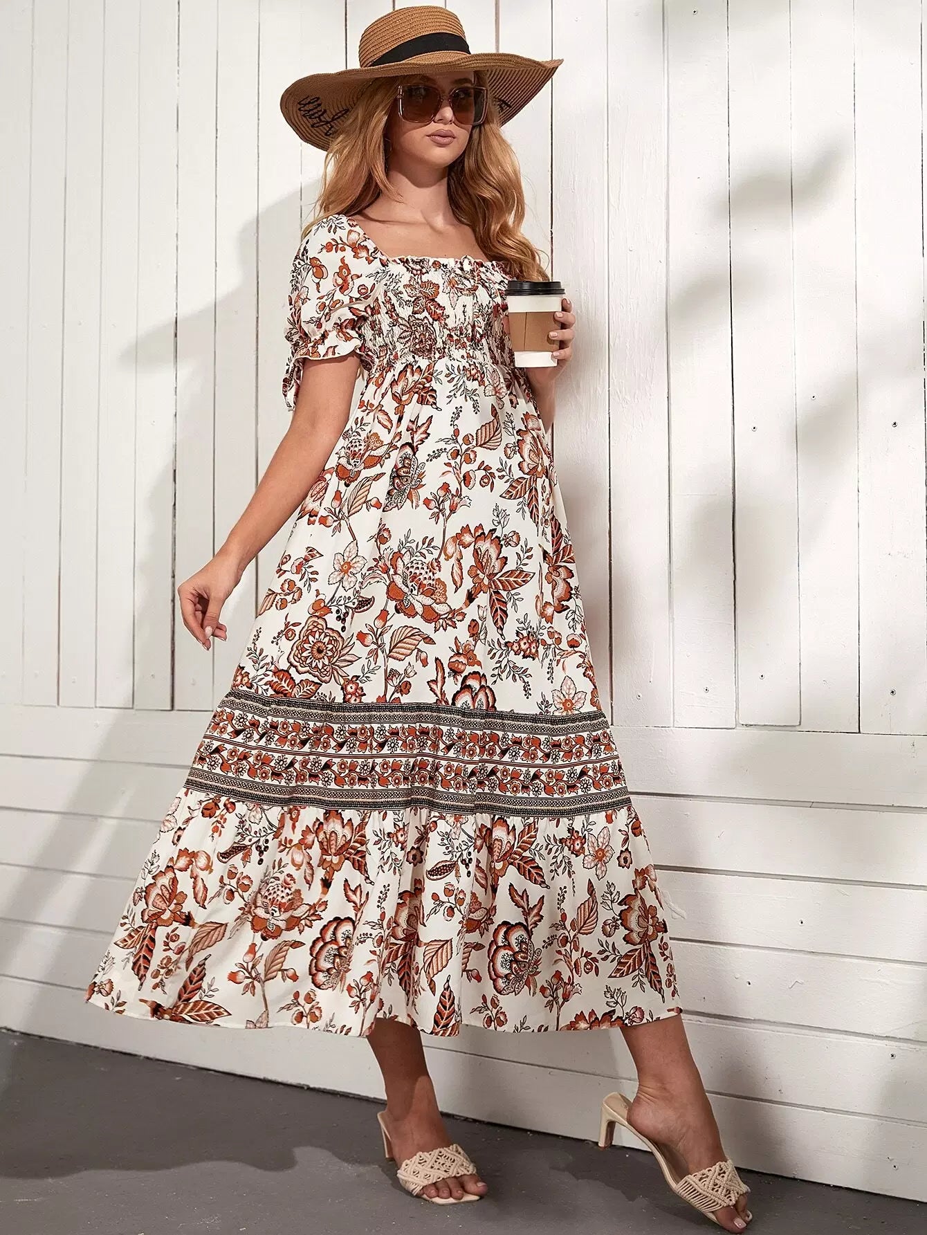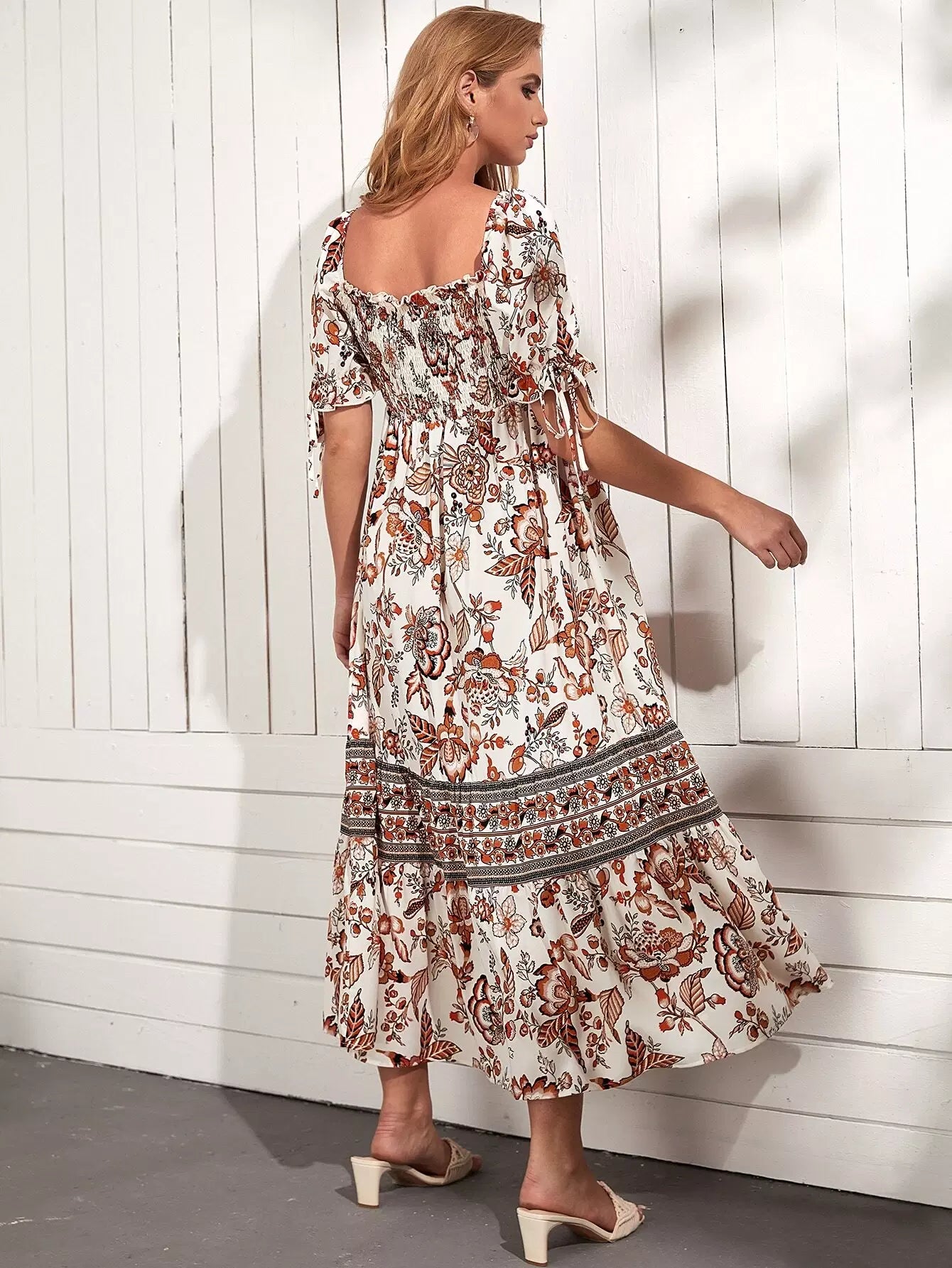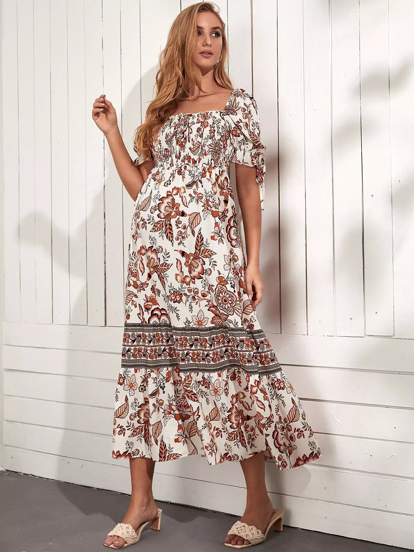 فستان بأكمام منفوشة بأكمام منفوشة بطبعة زهور للحمل بأكمام منفوشة وكشكشة على شكل عقدة