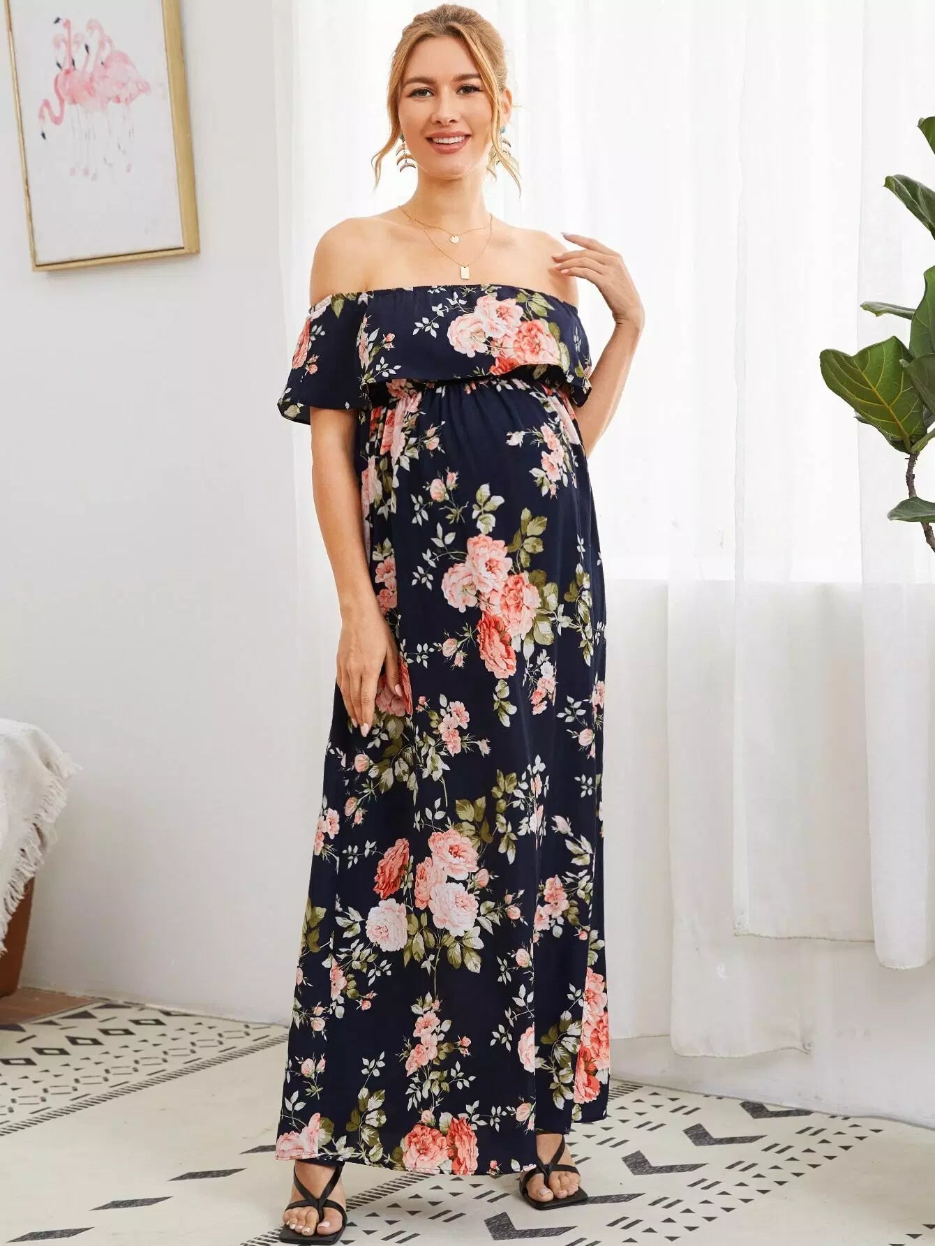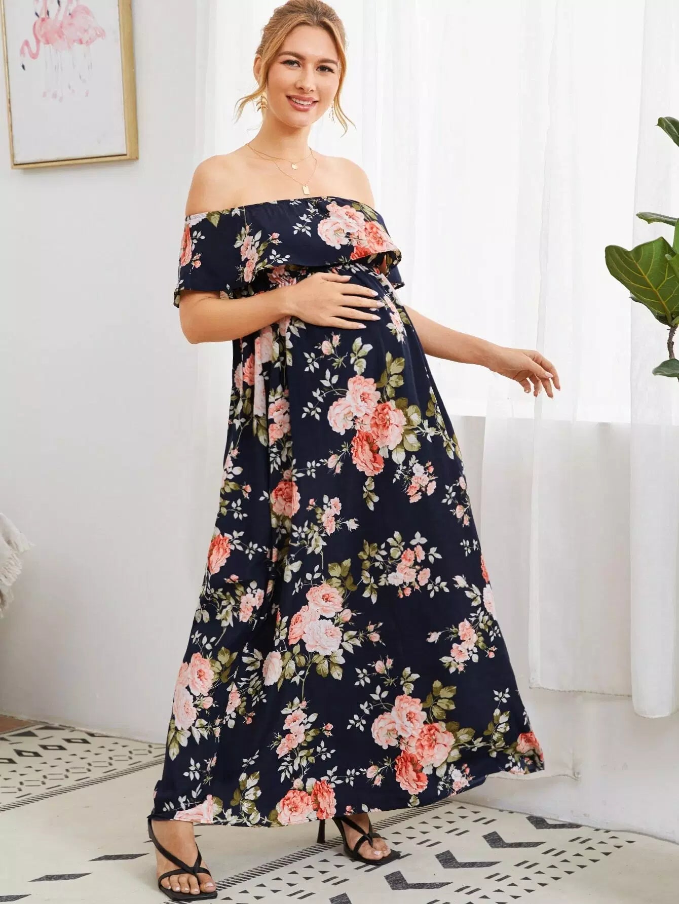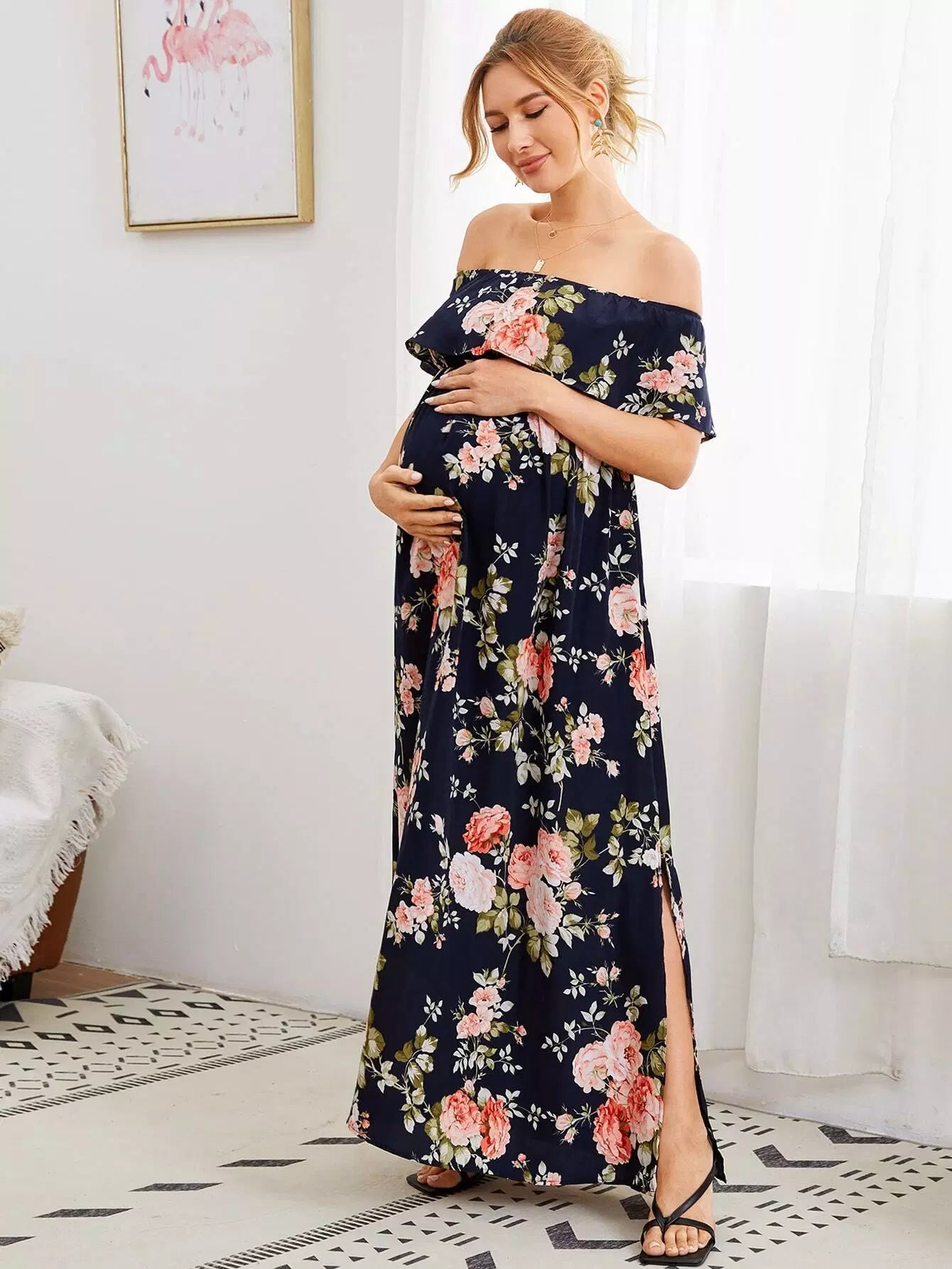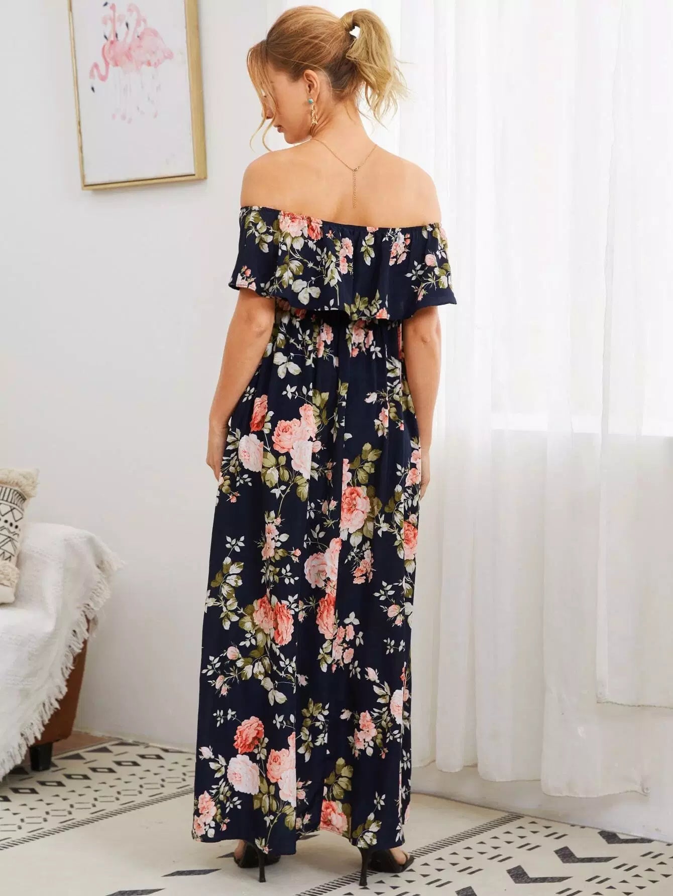 فستان أزهار منسدل على الأكتاف منسدل على الأكتاف منقوش بحافة منقسمة