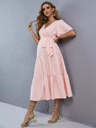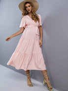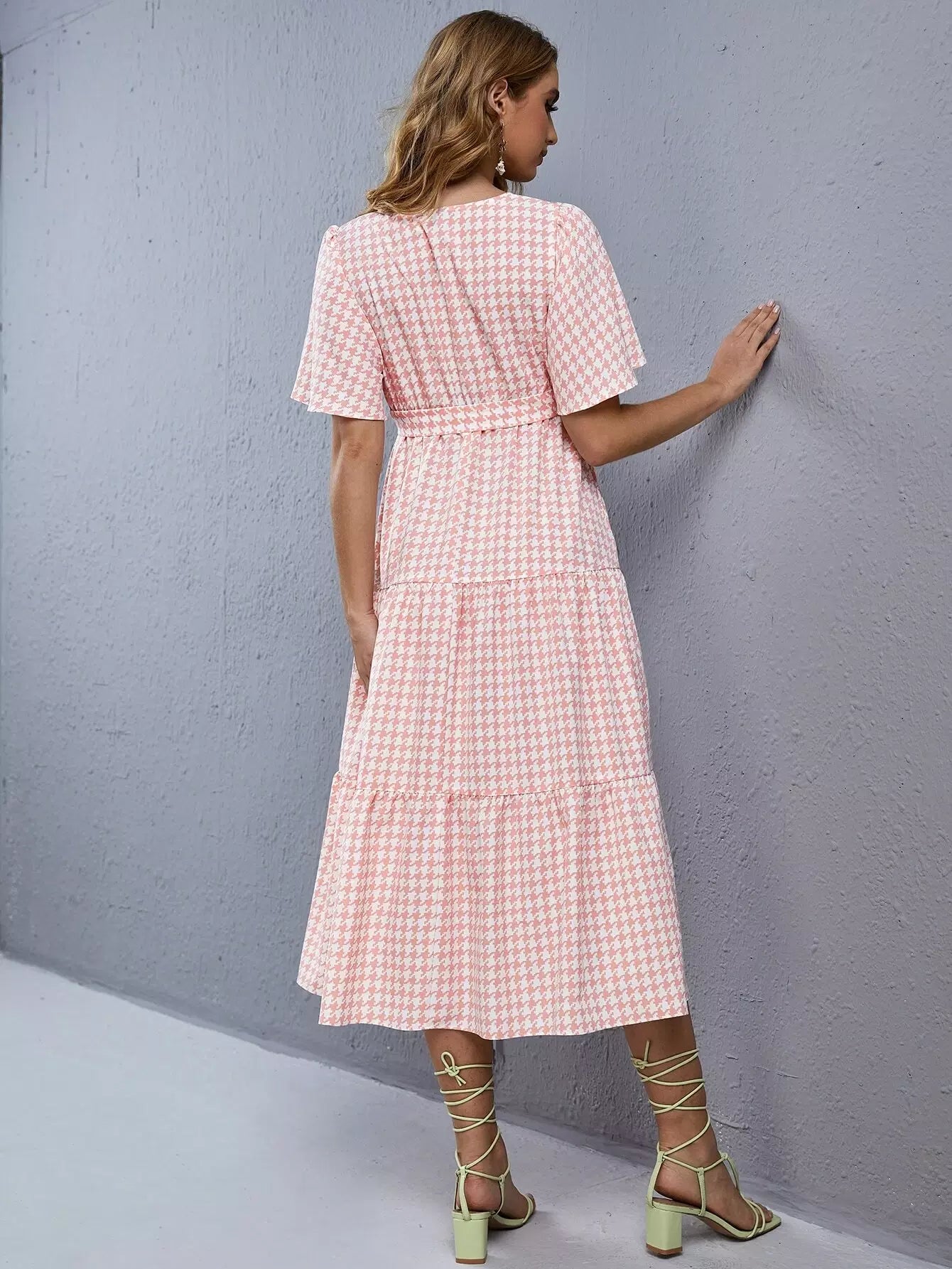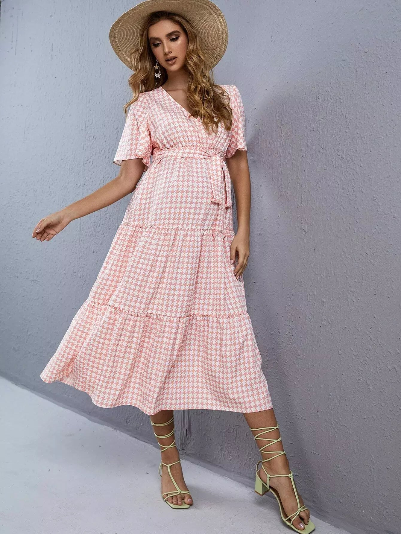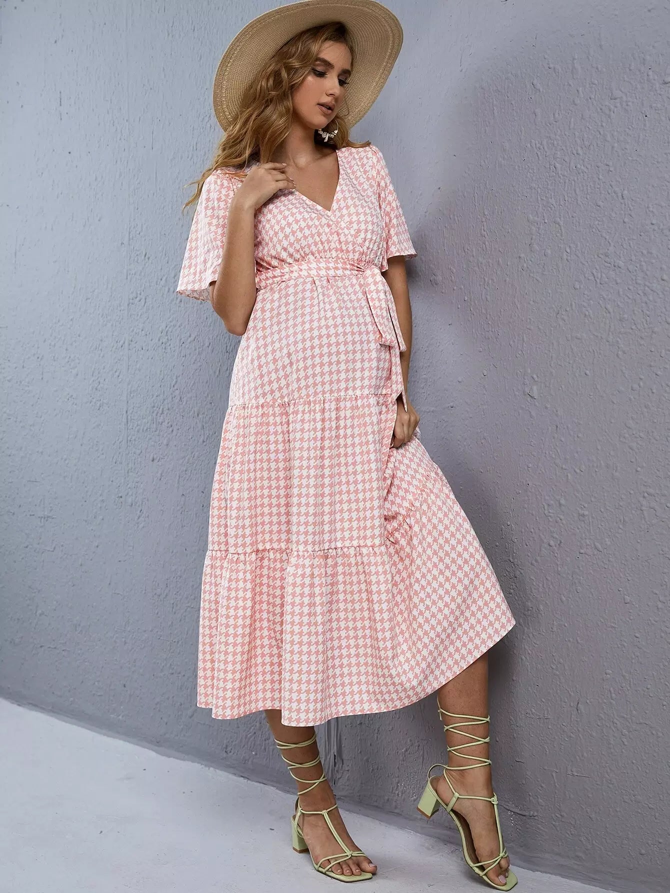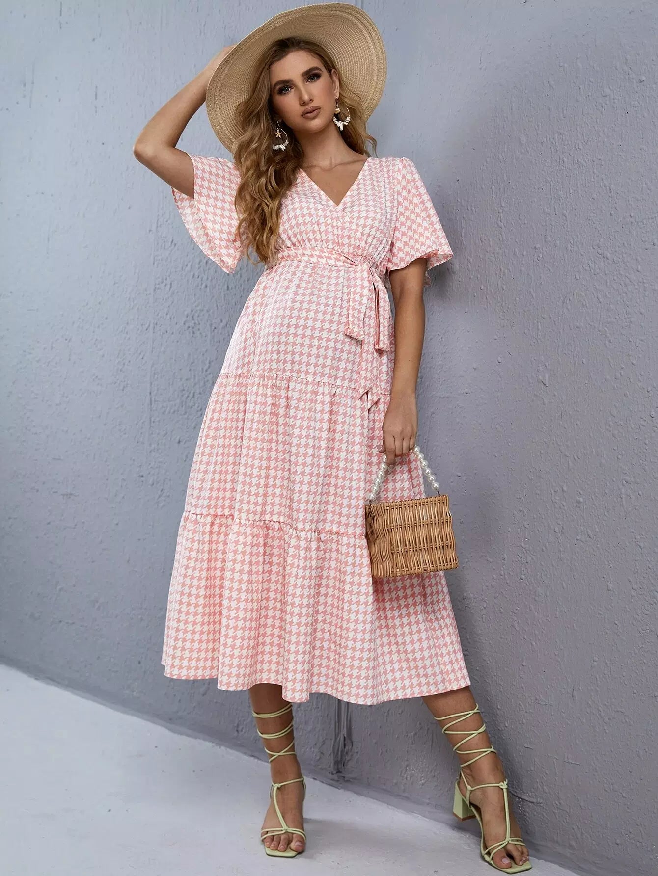 الأمومة طباعة Houndstooth الأكمام رفرفة اللباس ألف خط بدون حزام