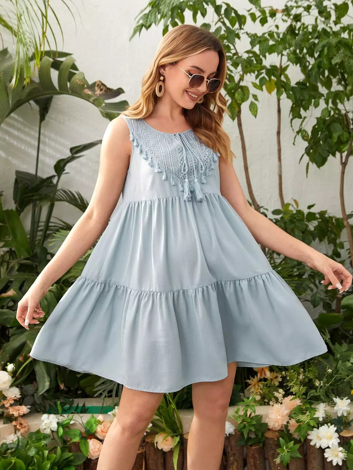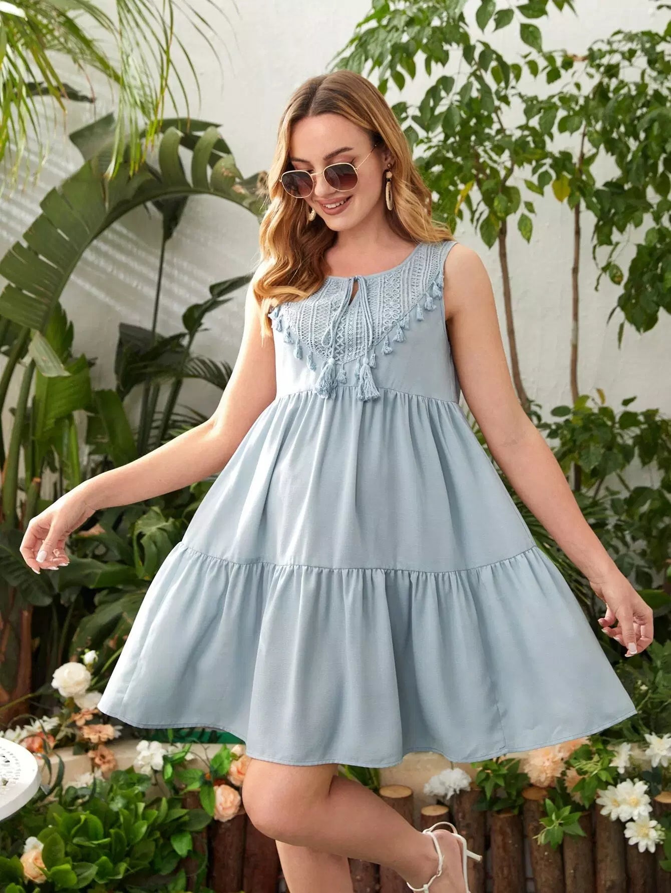 فستان سهرة للحوامل من الدانتيل مع رباط على الرقبة وحاشية مكشكشة