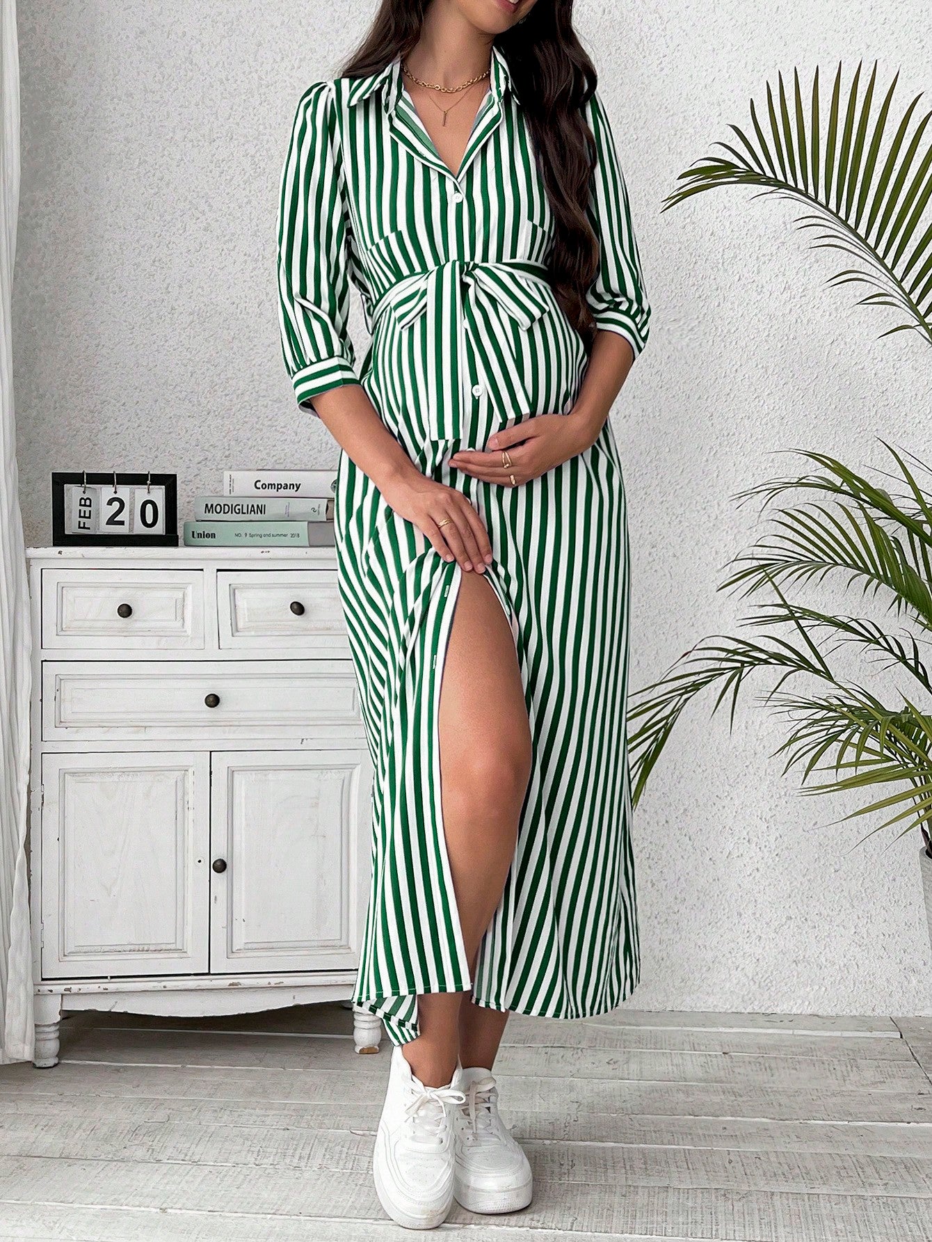 Striped Print Long Sleeve Shirt Dress Maternity Dress, Fashionable For Summer