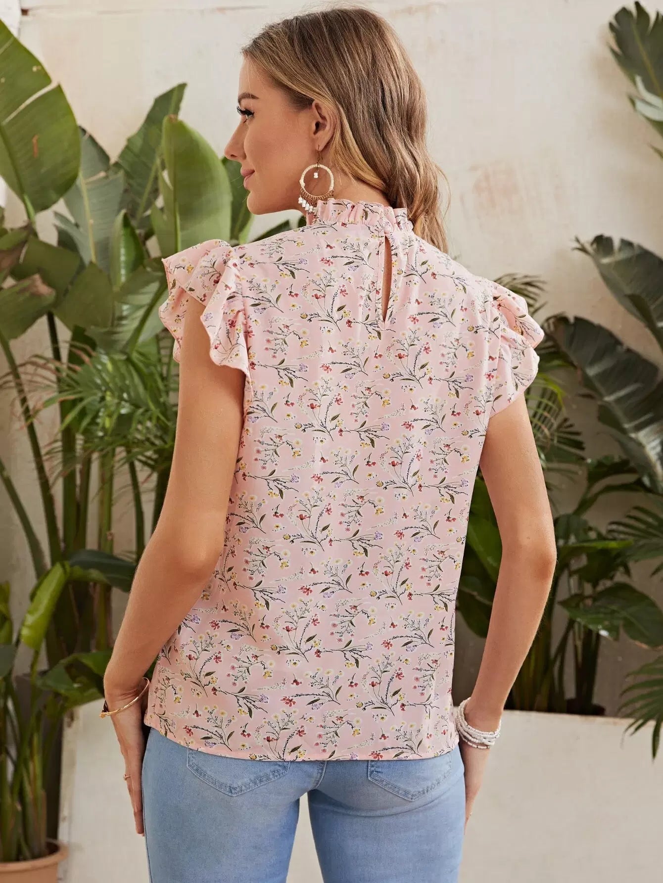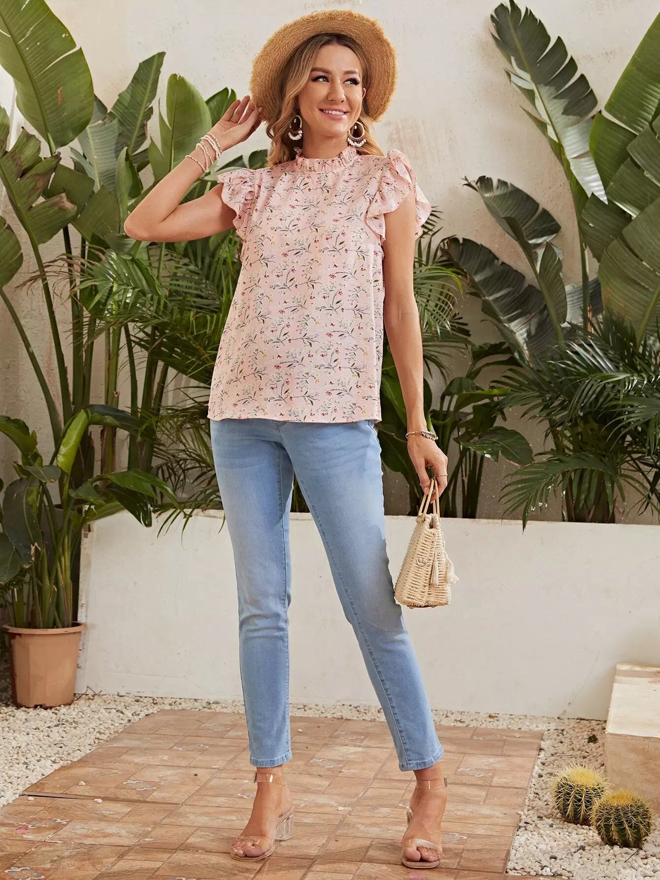 بلوزة للحوامل بطبعة زهور كاملة مع كشكشة وفتحة أكمام ورقبة وهمية