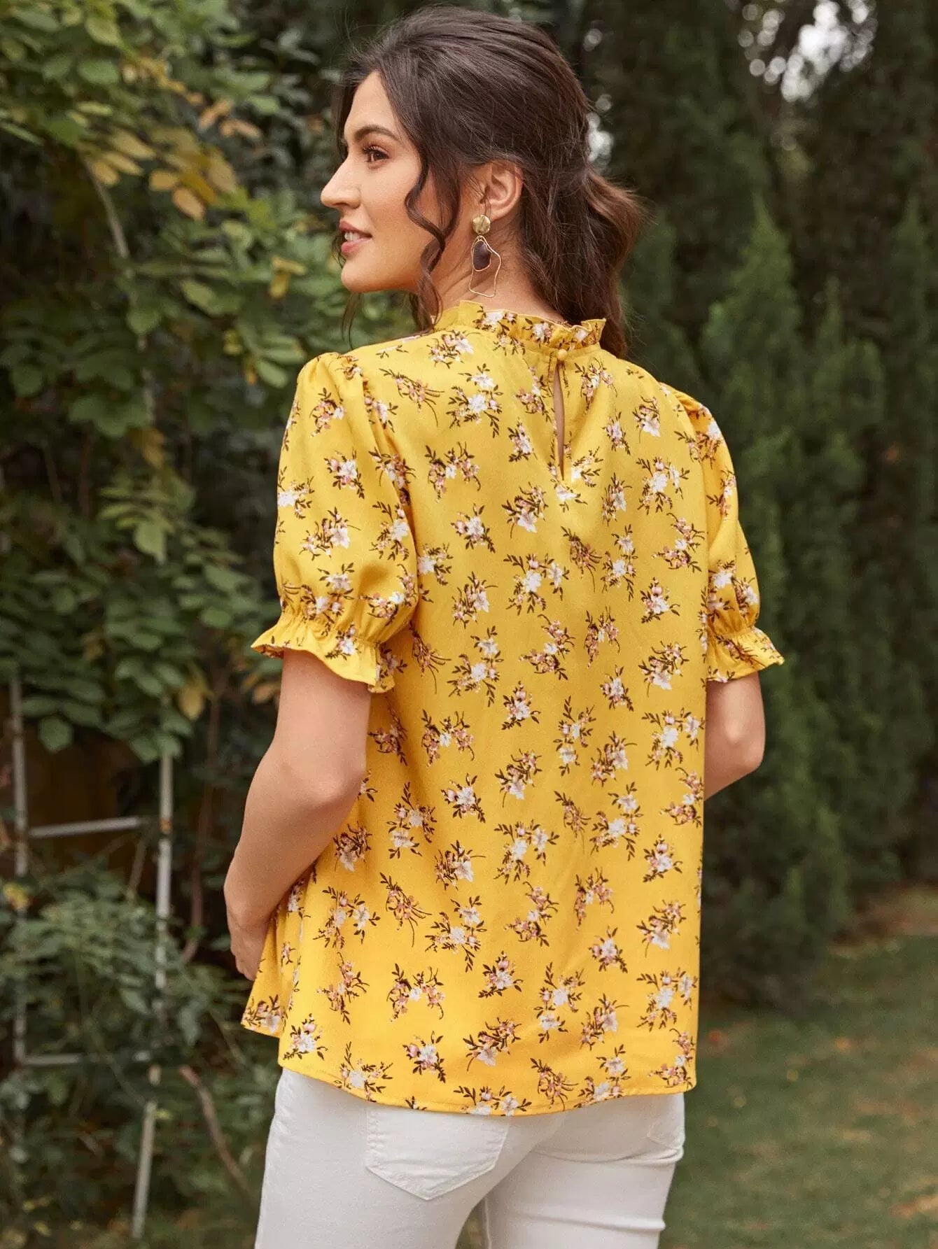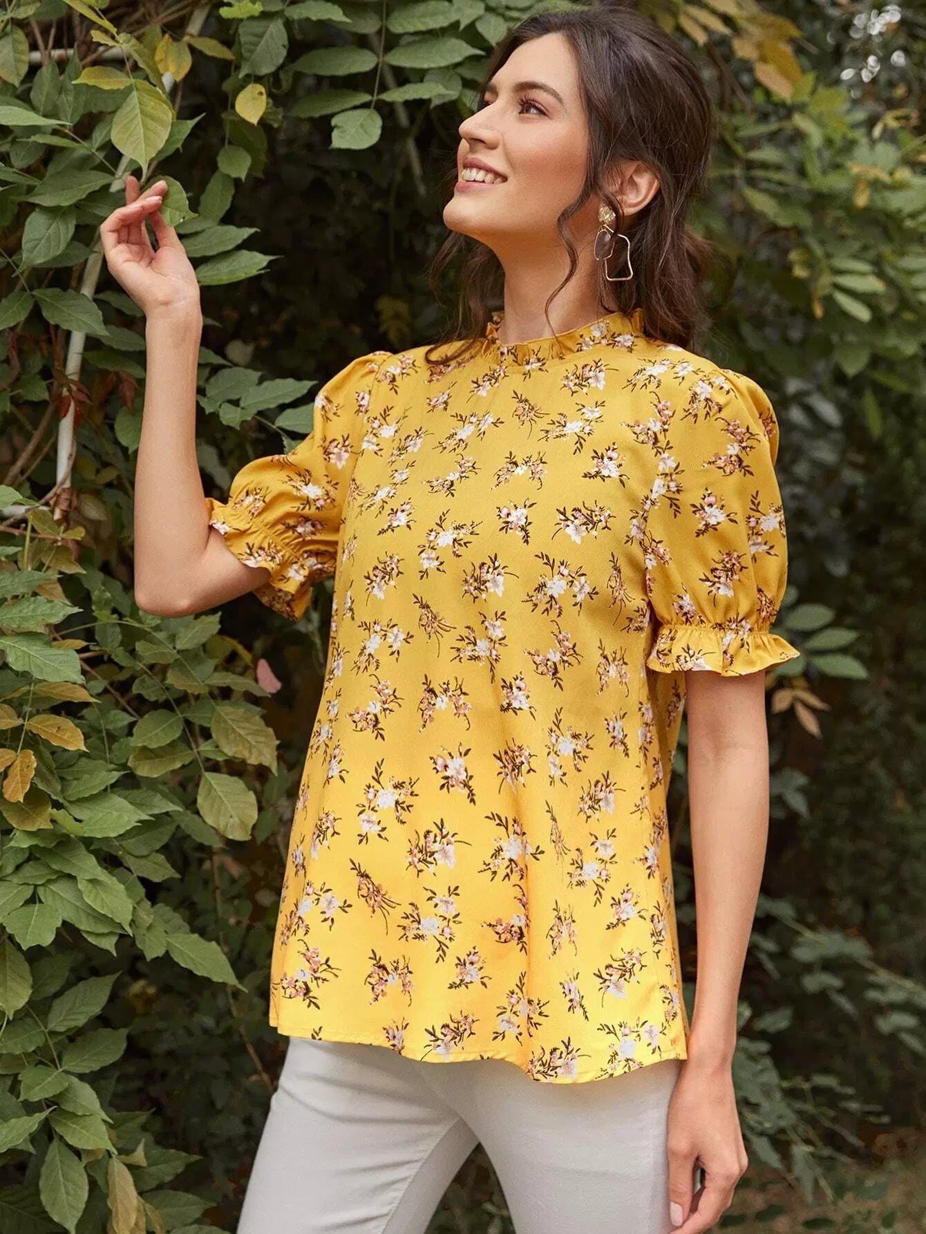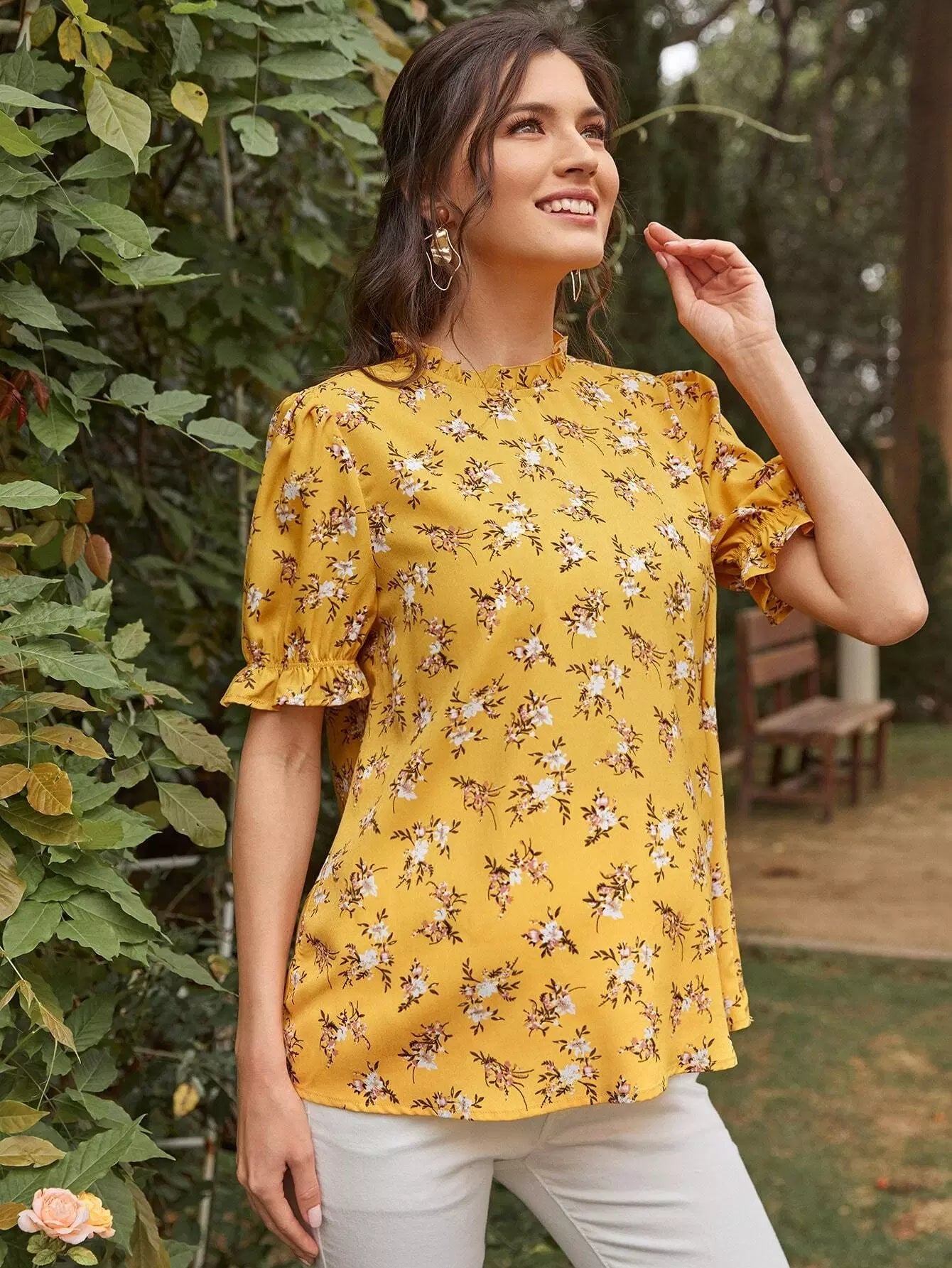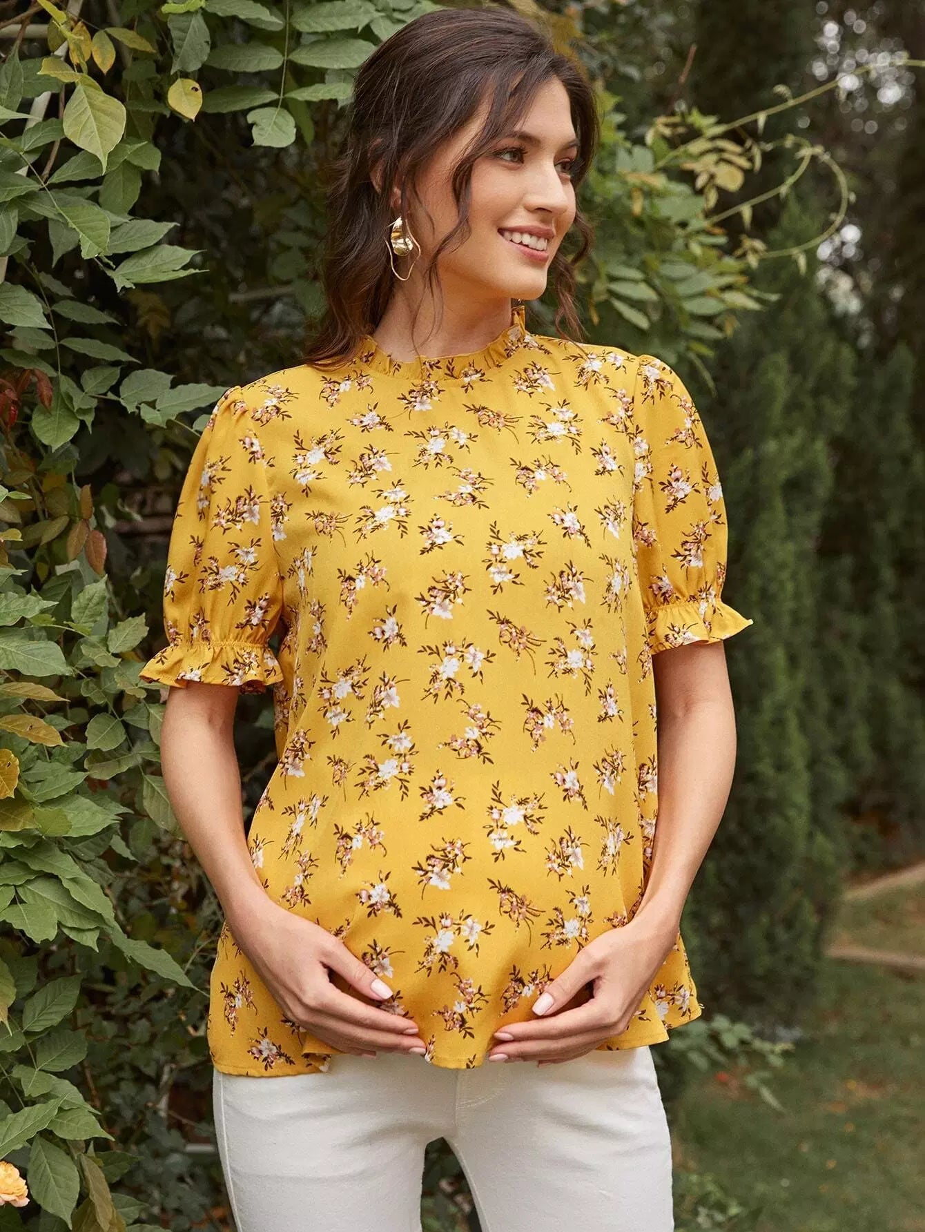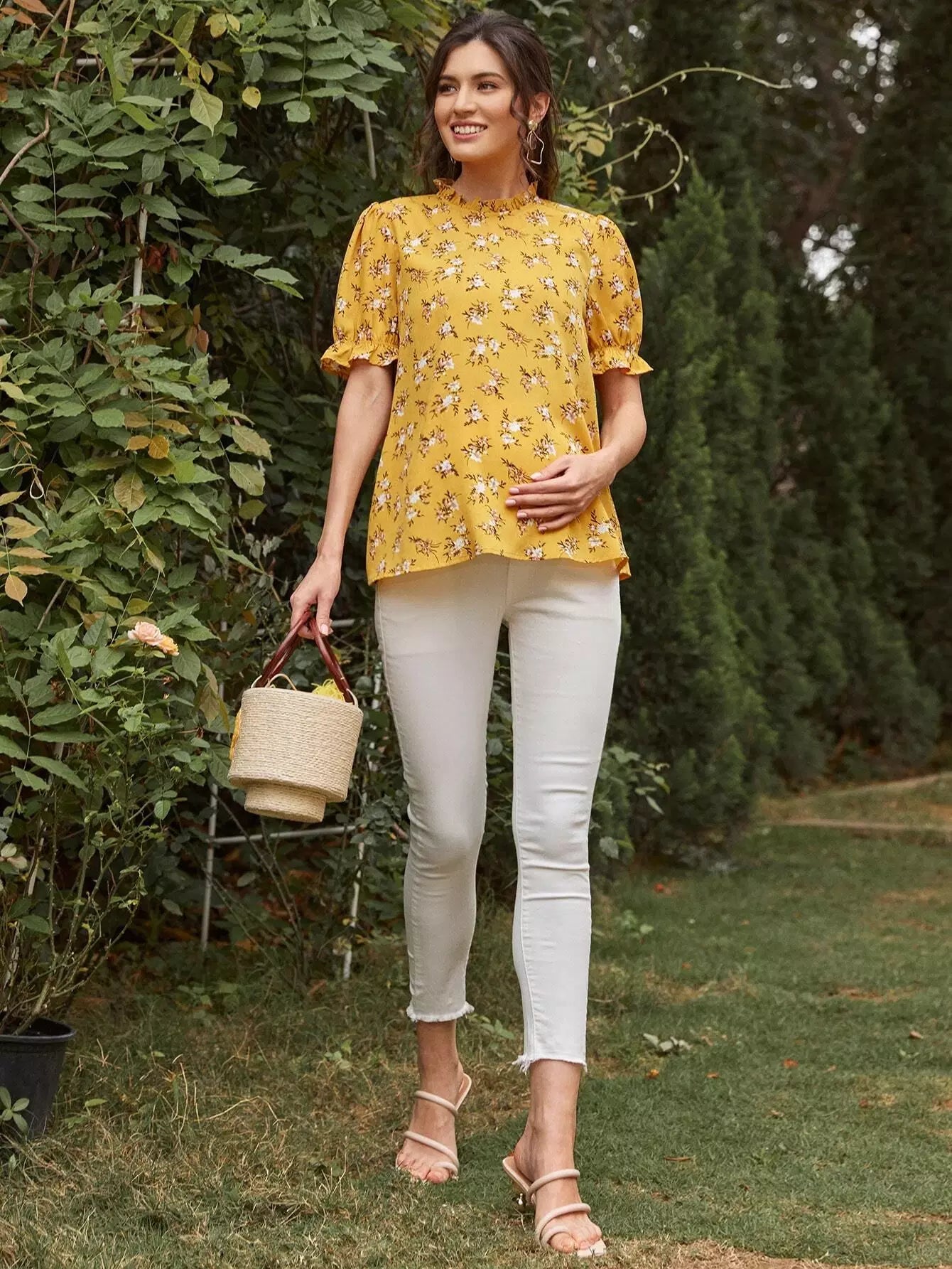 بلوزة بأكمام كشكش بأكمام منفوشة بأزهار منفوشة للحوامل