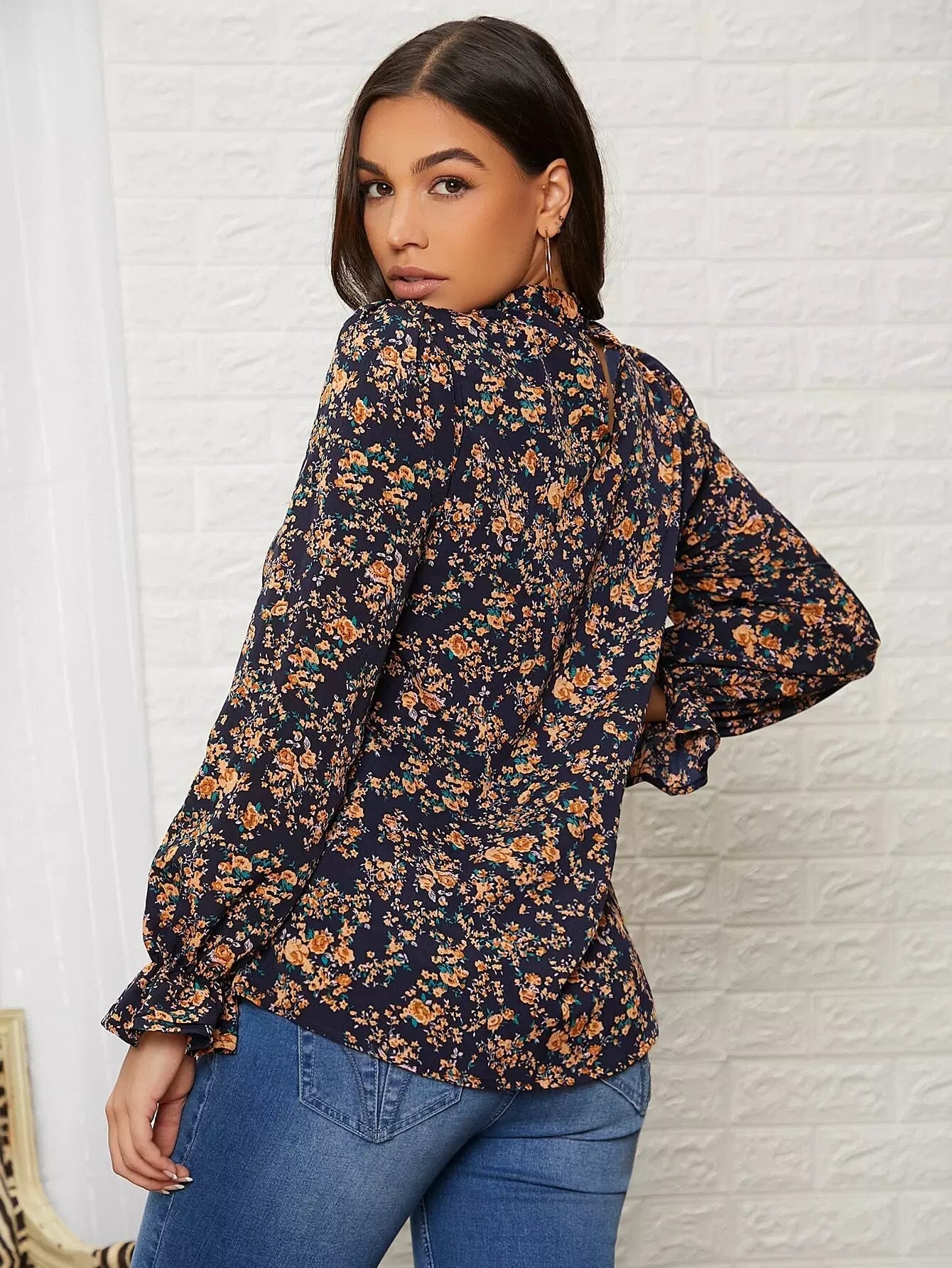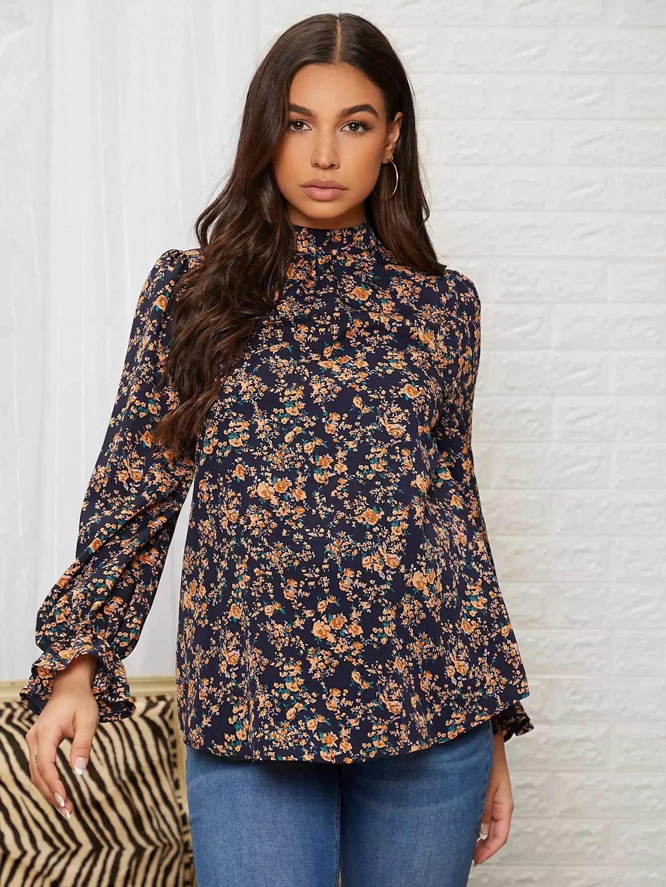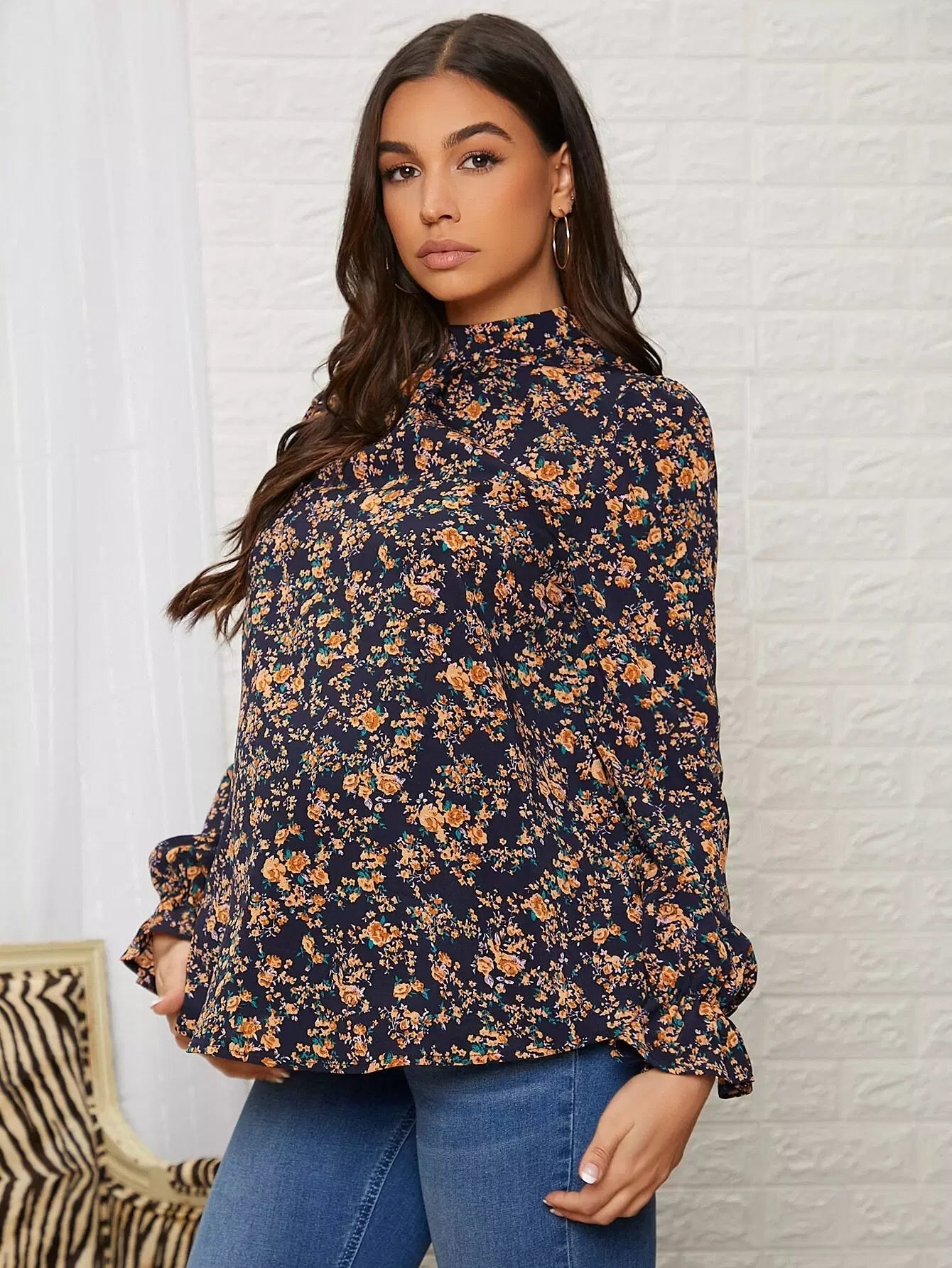 بلوزة بأكمام كشكش مطبوع عليها كشكش بالكامل بطبعة زهور