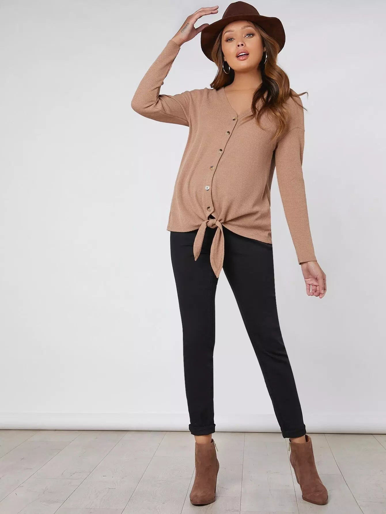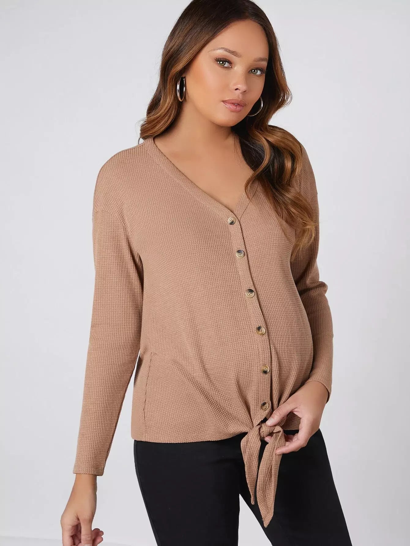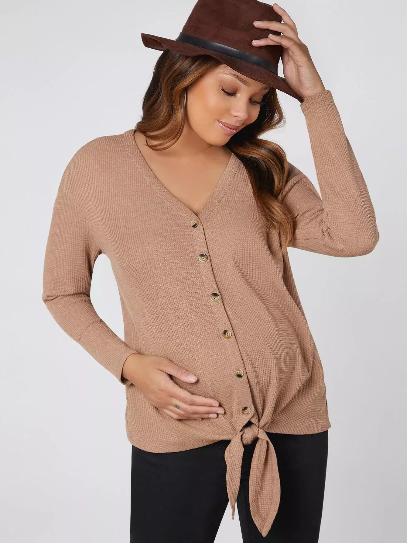 الأطفال - بلوزة للحوامل برقبة على شكل حرف V وأزرار لأعلى وحاشية