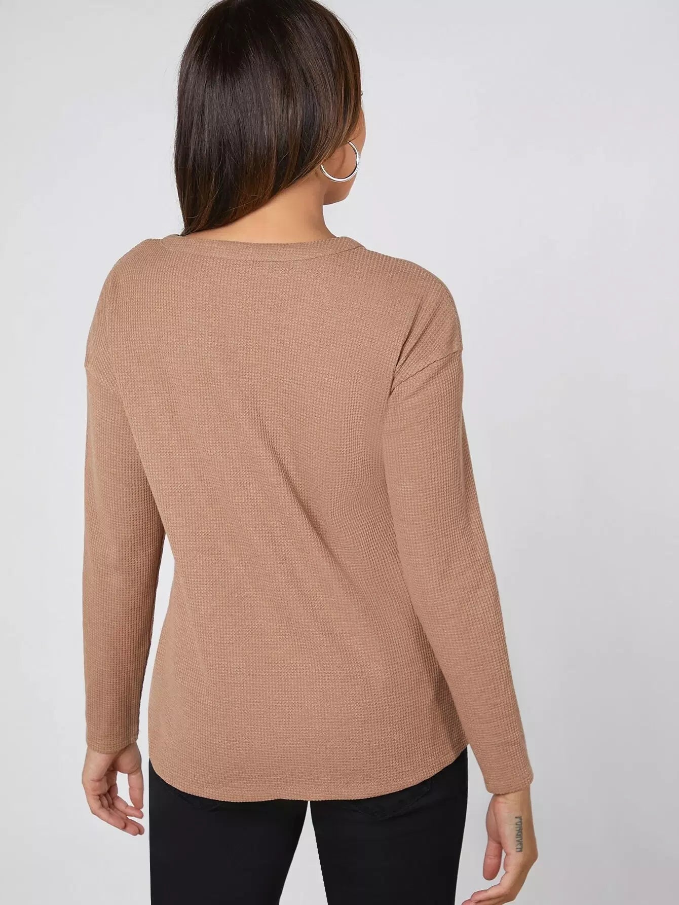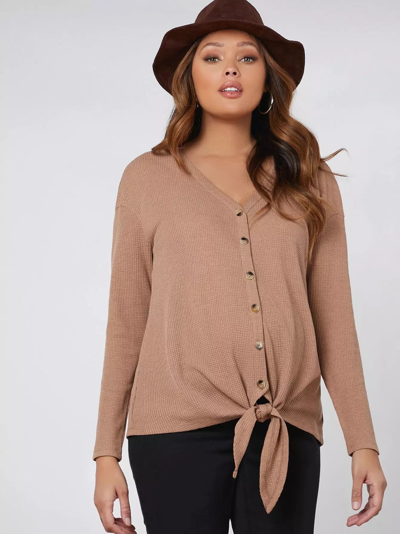بلوزة بياقة على شكل حرف V بياقة على شكل حرف V وأزرار بحاشية ربطة عنق على شكل حرف V