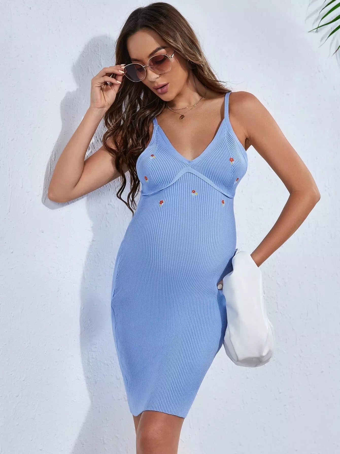 فستان كنزة بتطريزات زهور الأمومة بتطريزات ضلع محبوكة