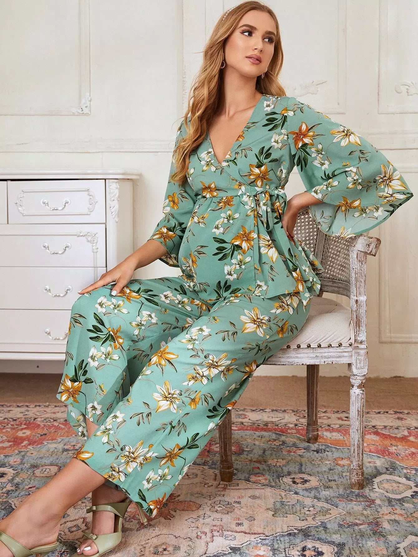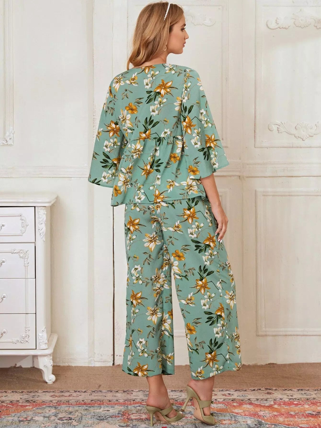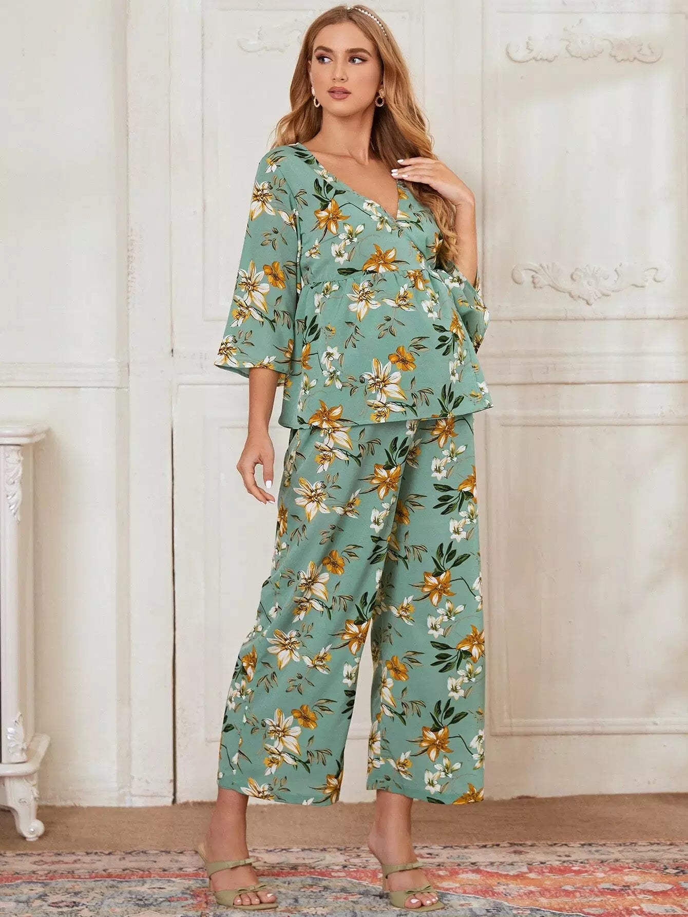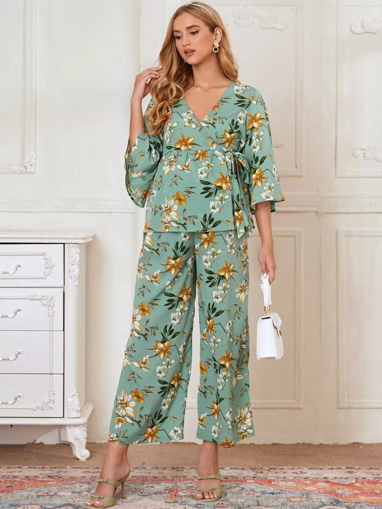 طقم بلوزة وبنطلون بأكمام جرس للحوامل بعقدة جانبية مع بنطلون