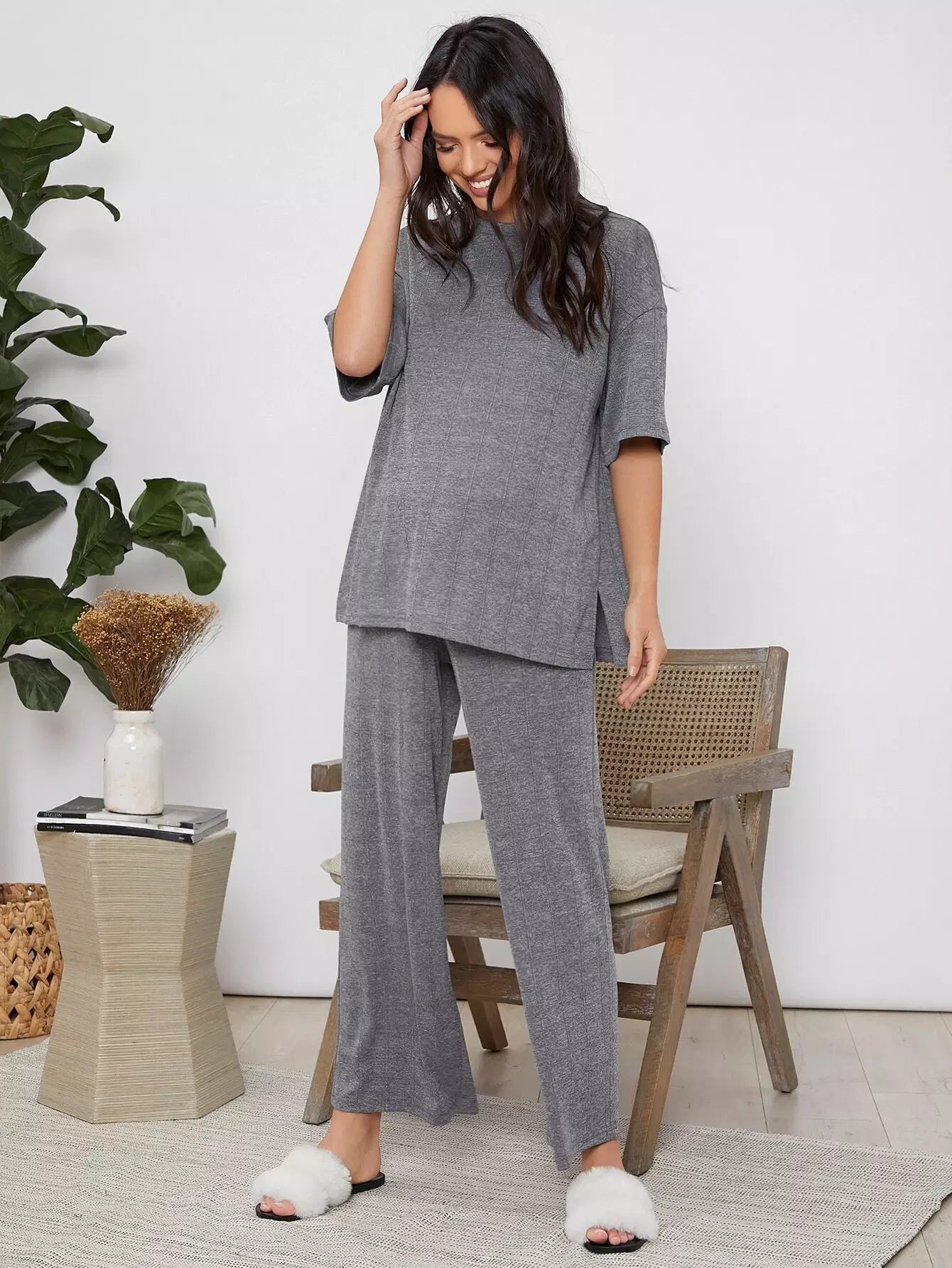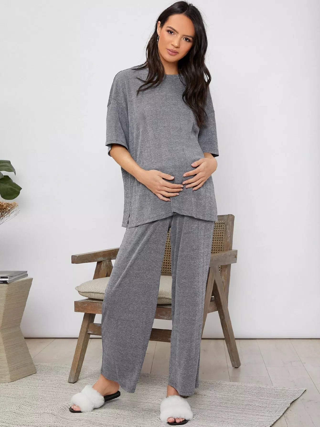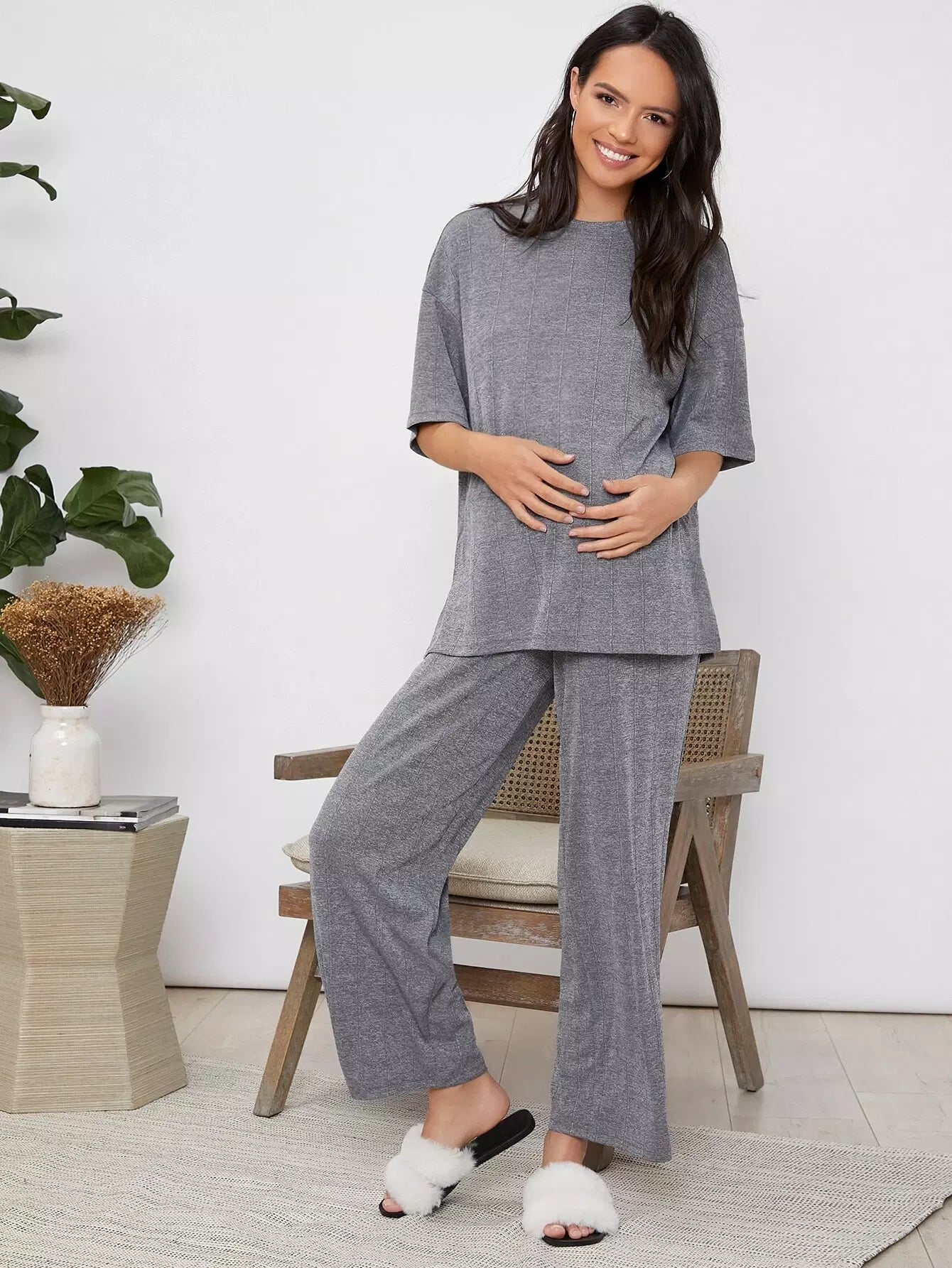 الأطفال - طقم من بلوزة وسروال سادة بأكتاف منسدلة للحوامل