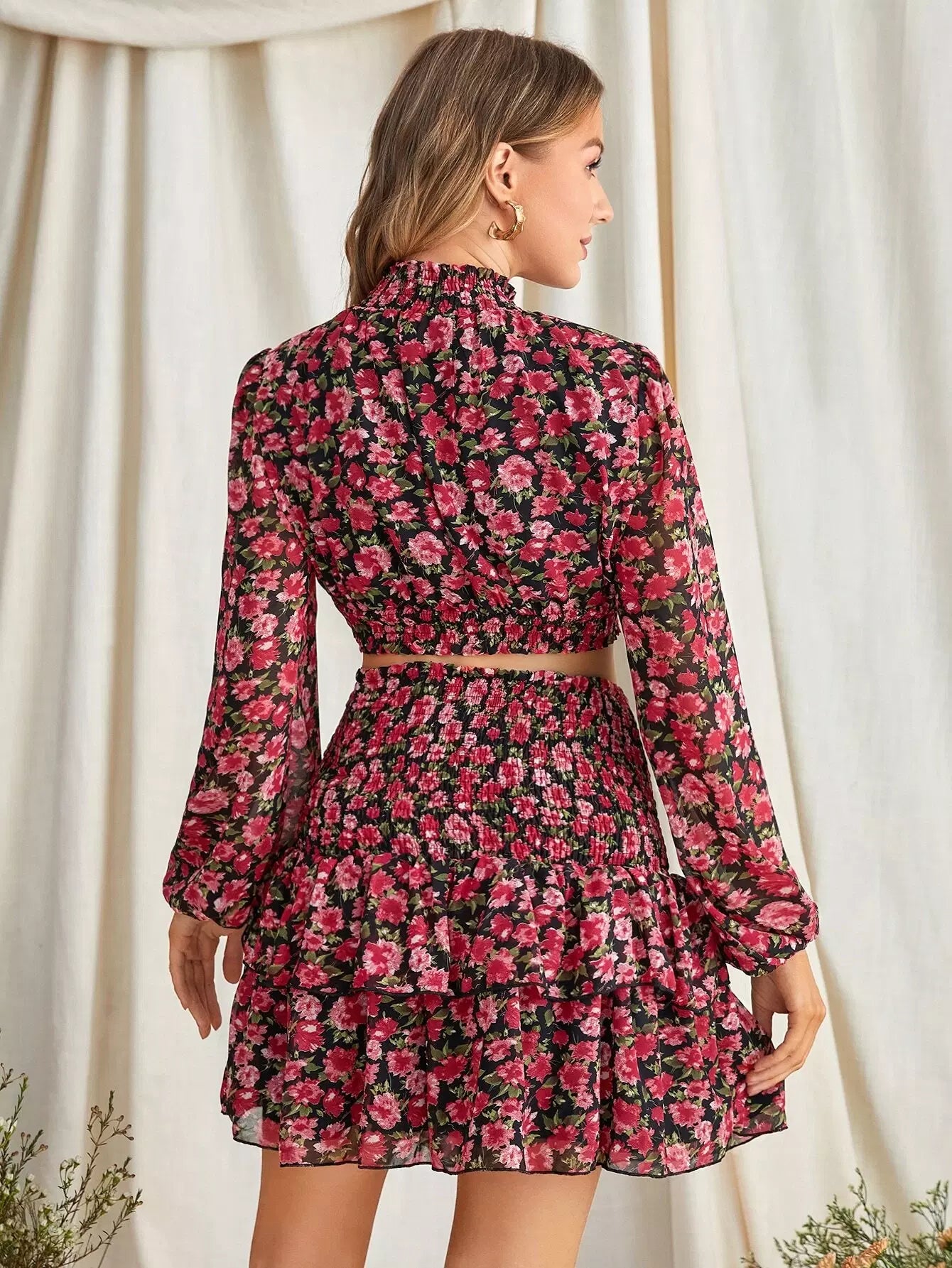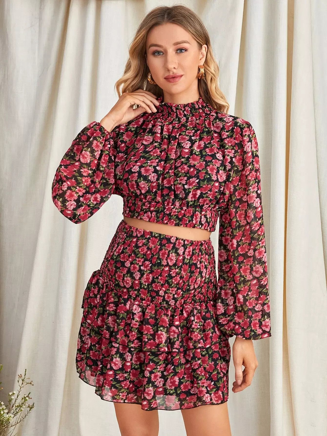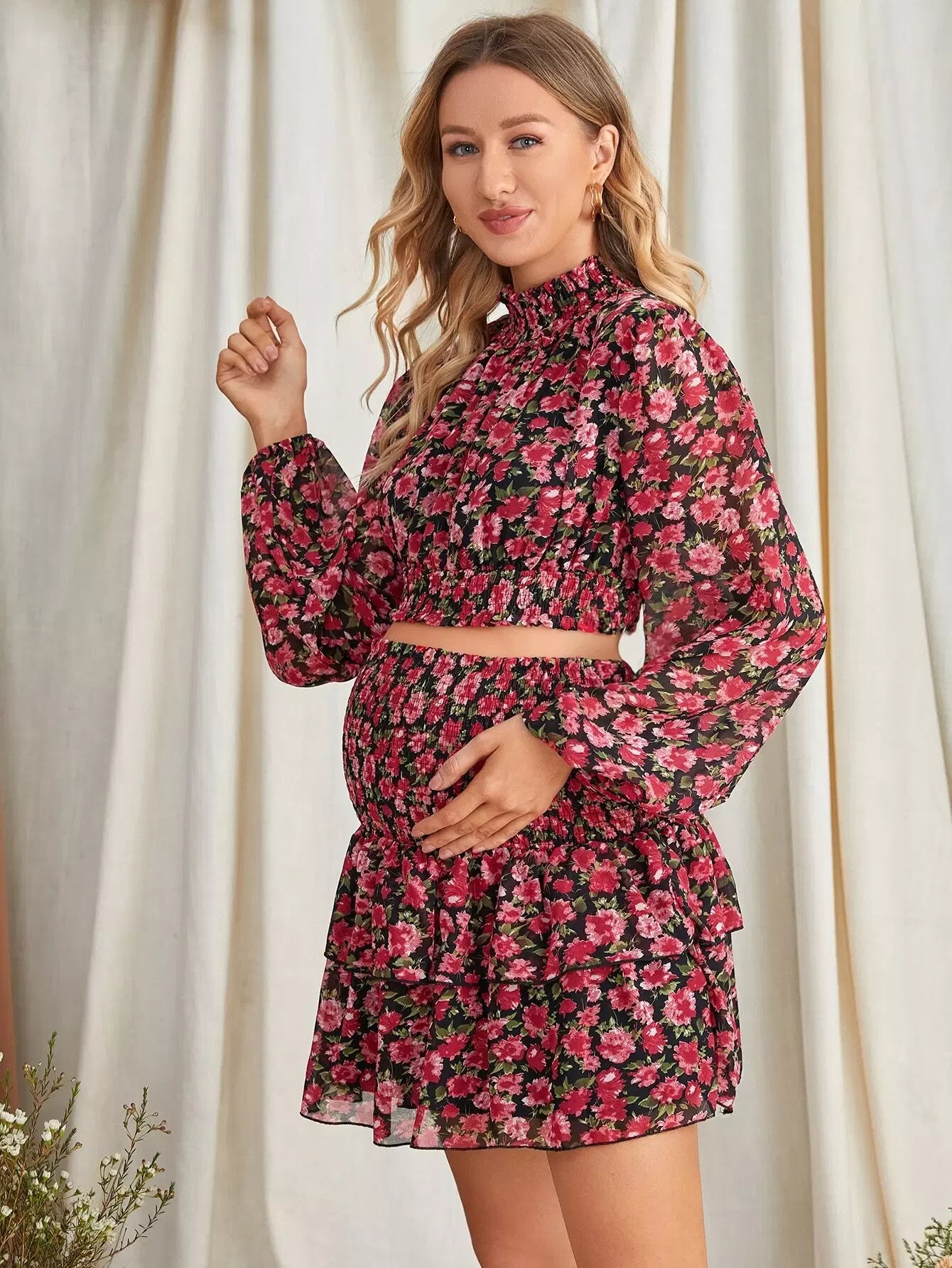 الأطفال - طقم تنورة علوية مكشكشة بنقشة الزهور للحوامل وتنورة بحاشية مكشكشة