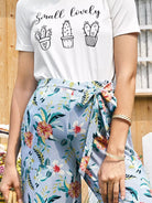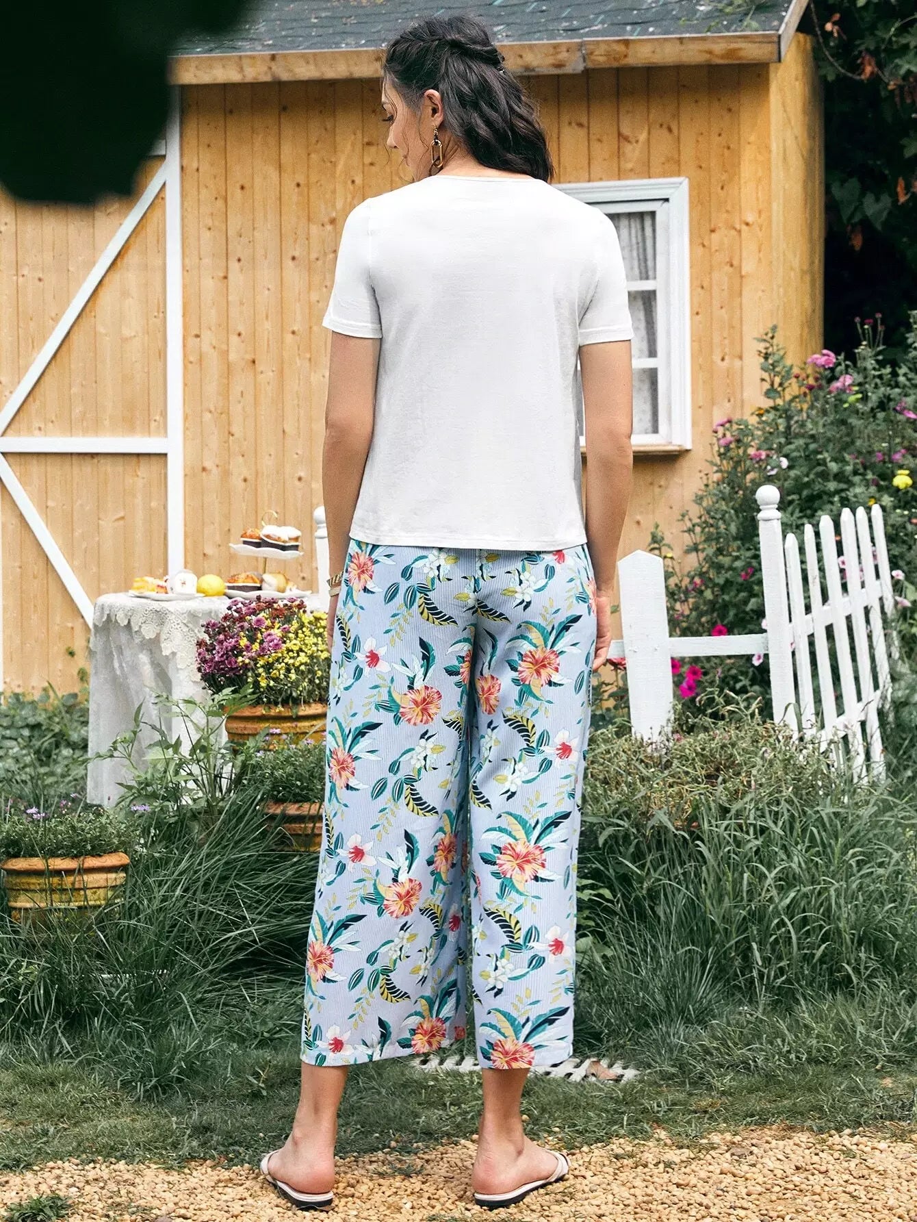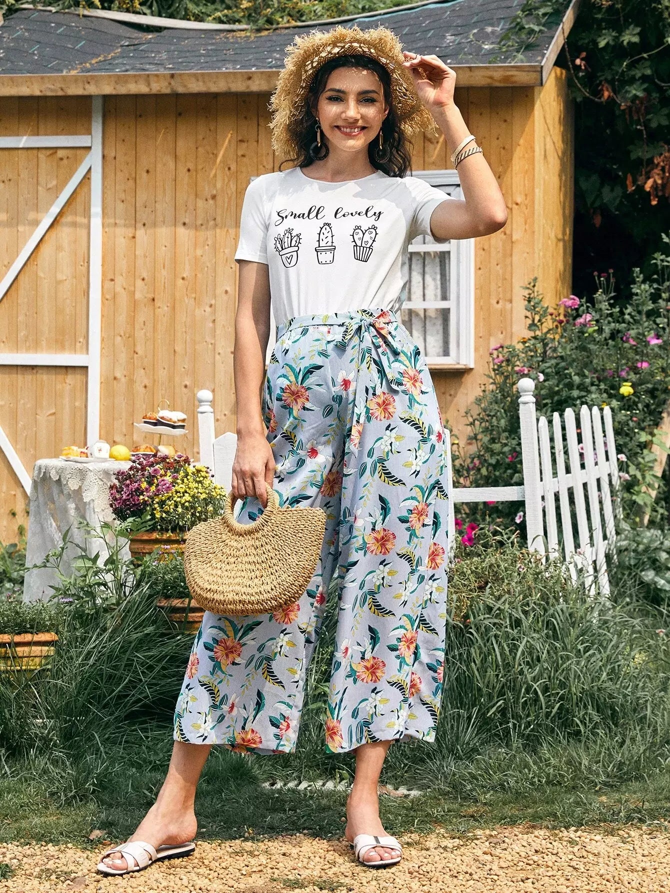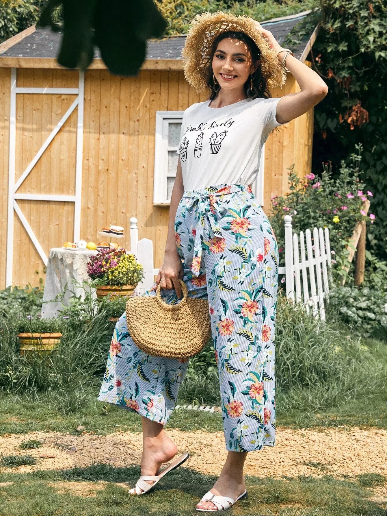 طقم علوي مطبوع عليه نباتات الأمومة وسروال بالازو استوائي بدون حزام