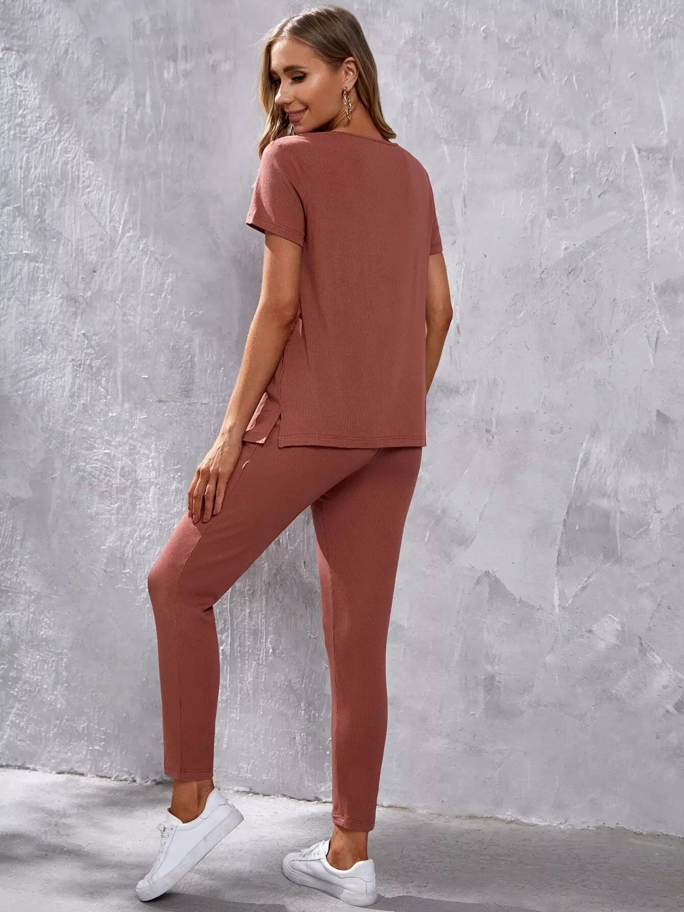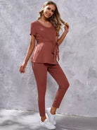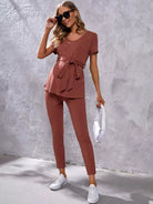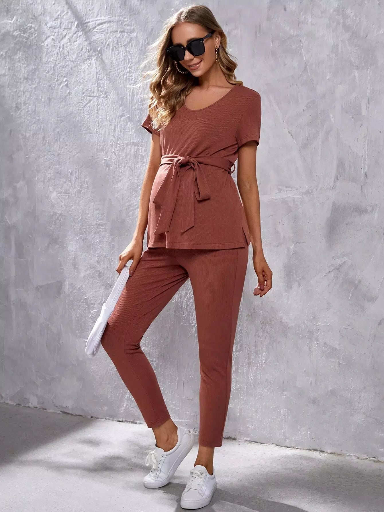 بلوزة بحاشية بفتحة للحوامل وبنطال ضيق بخصر قابل للتعديل بدون حزام
