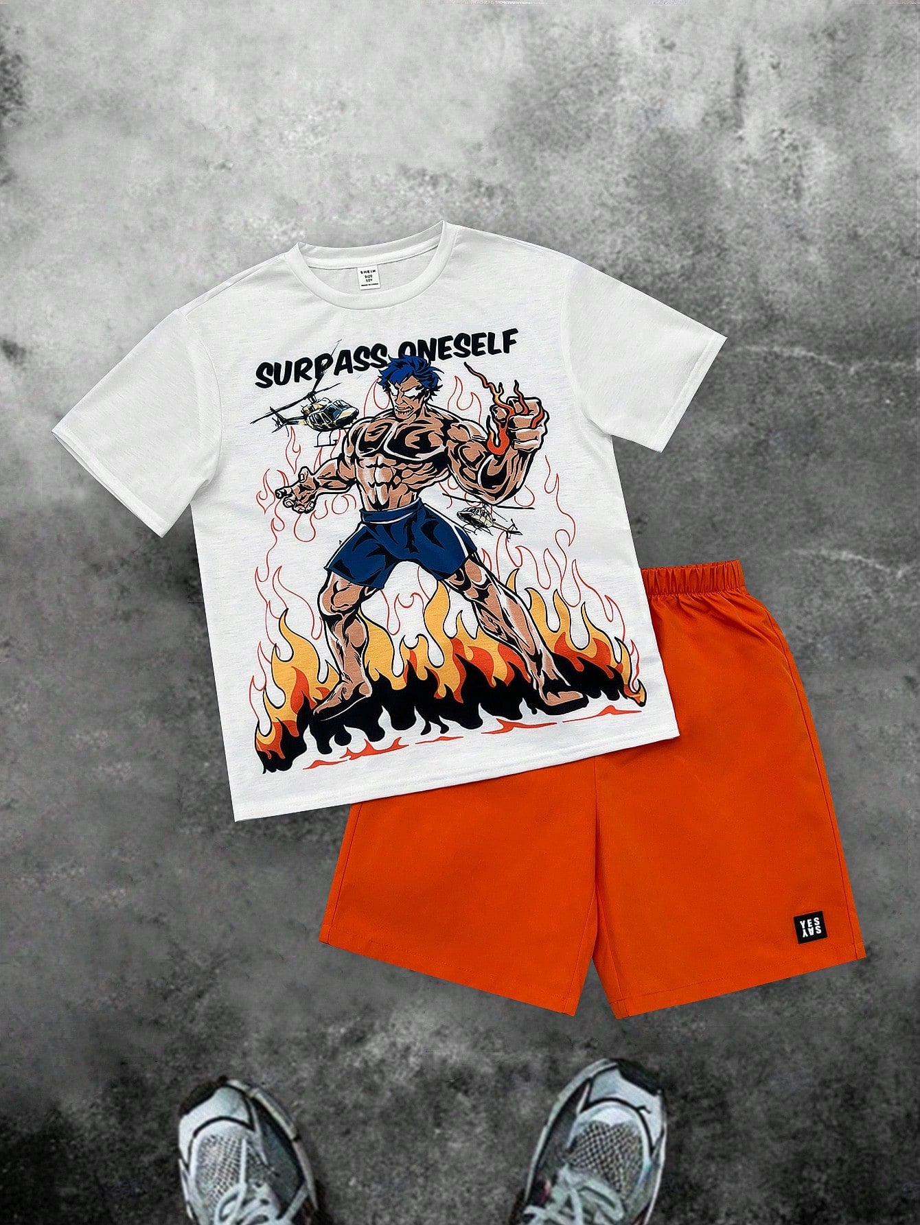 2pcs/Set Kids Tween Boys Casual Versatile Comfortable Street Fashion Printed Pattern Loose Fit Round