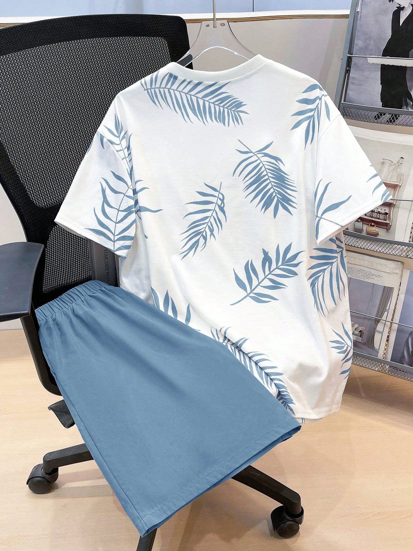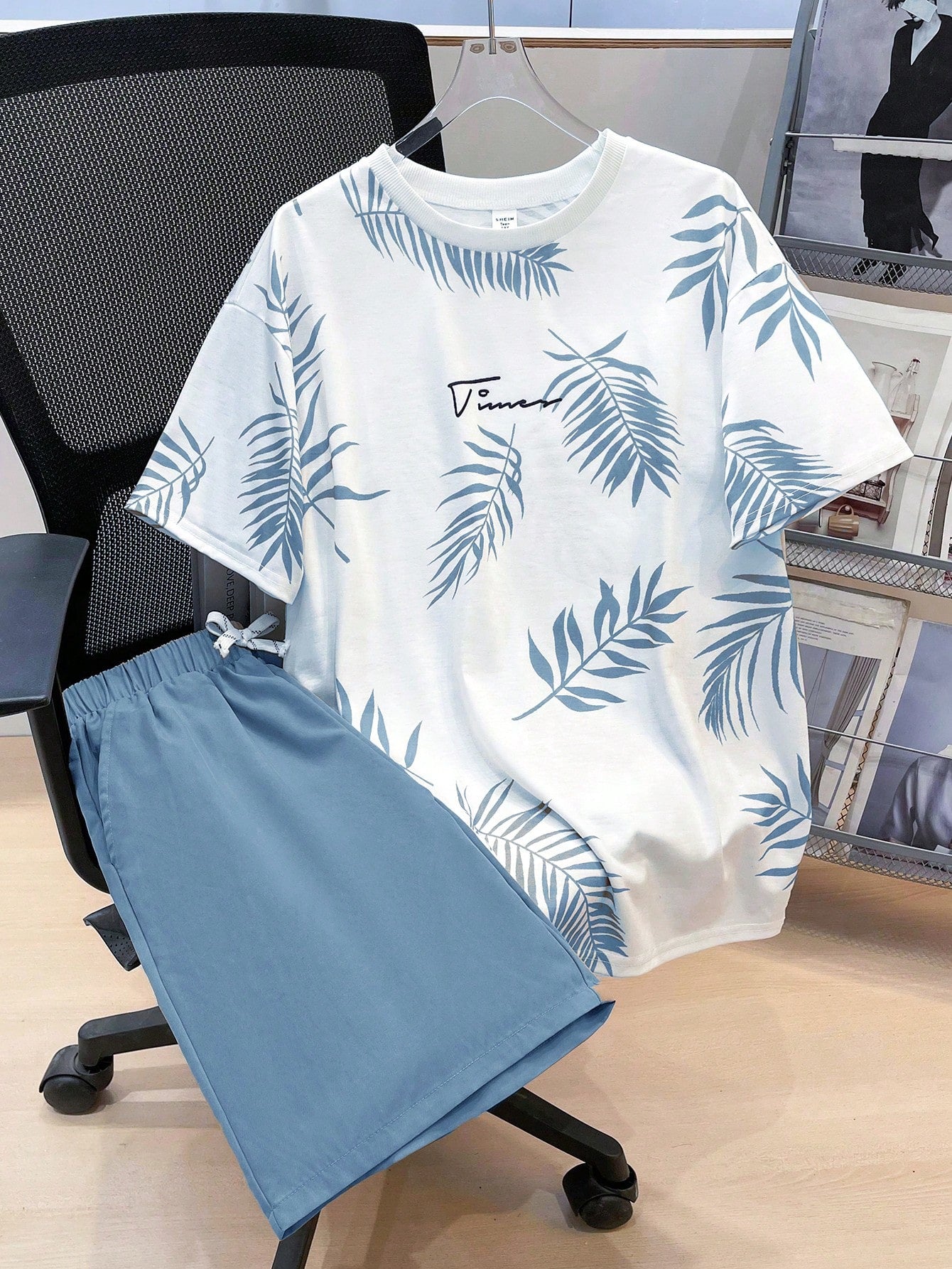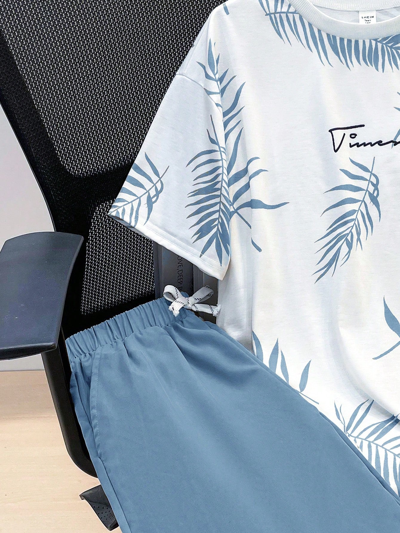 طقم مكون من قطعتين من تي شيرت مطبوع عليه نقشة استوائية وشورت برباط خصر للأولاد المراهقين؛ ملابس ربيعية؛ ملابس للأولاد المراهقين؛ ملابس للأطفال