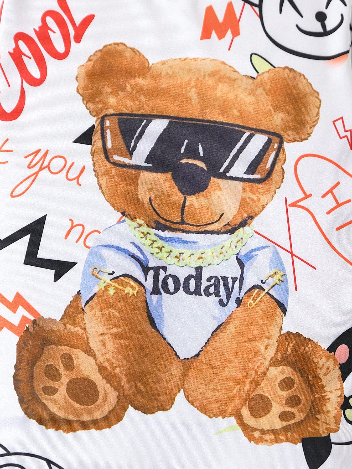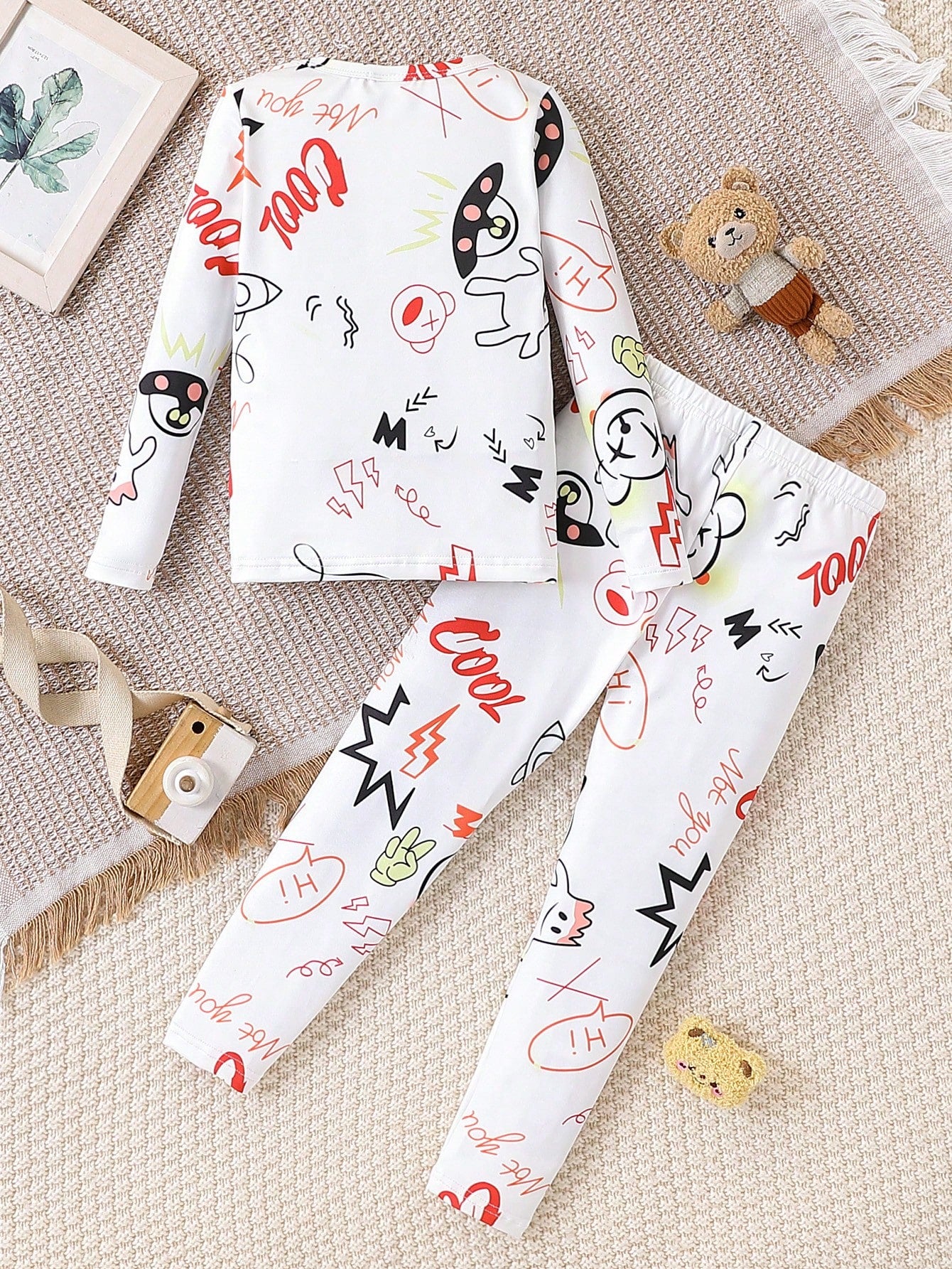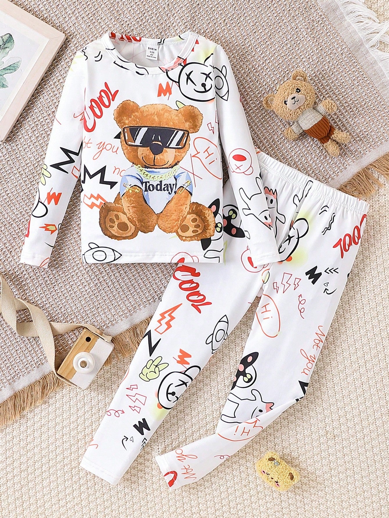 2pcs Young Boy Comfortable Snug Fit White Bear Print Long Sleeve Tee And Long Pants Loungewear Set