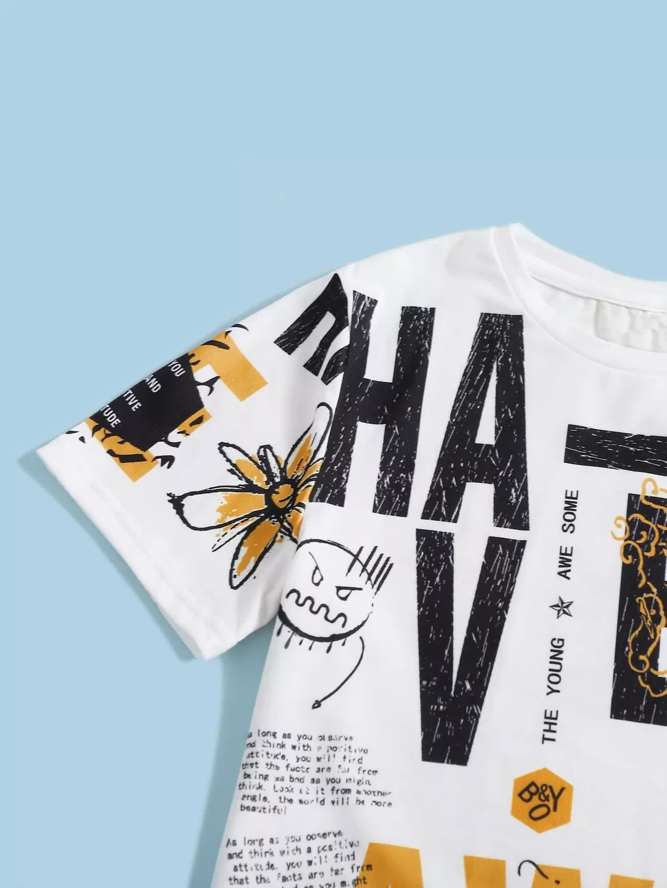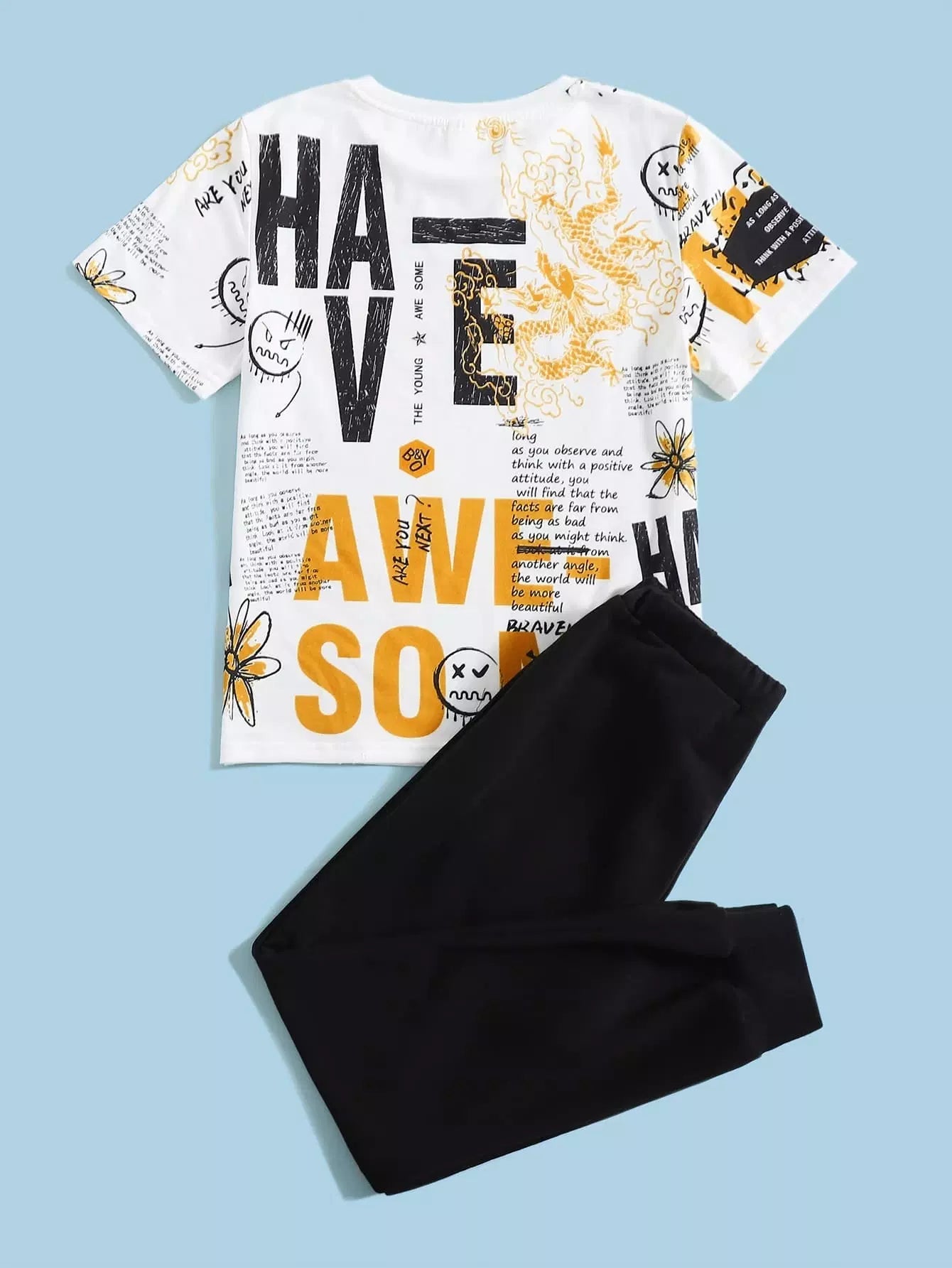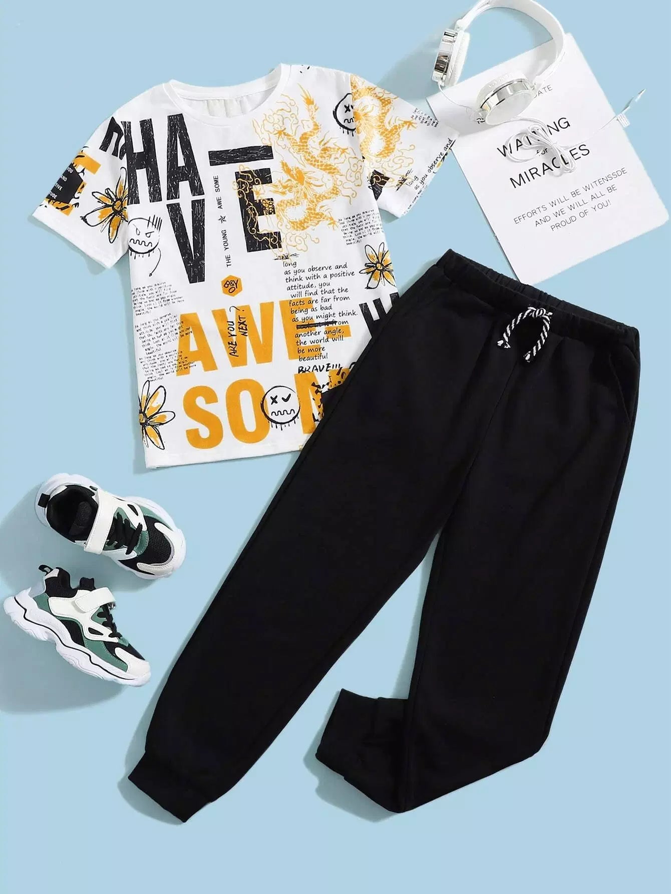 تي شيرت وبنطلون رياضي برباط مع رسومات تنين صيني وشعار للأولاد