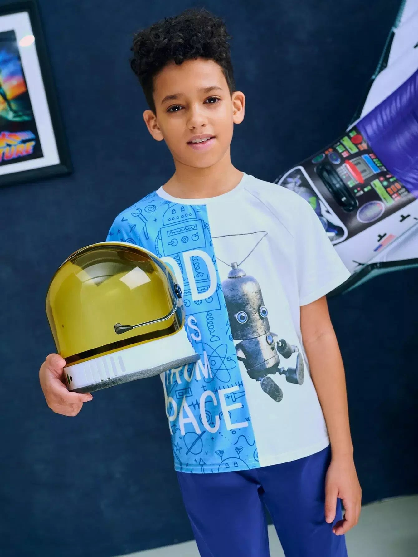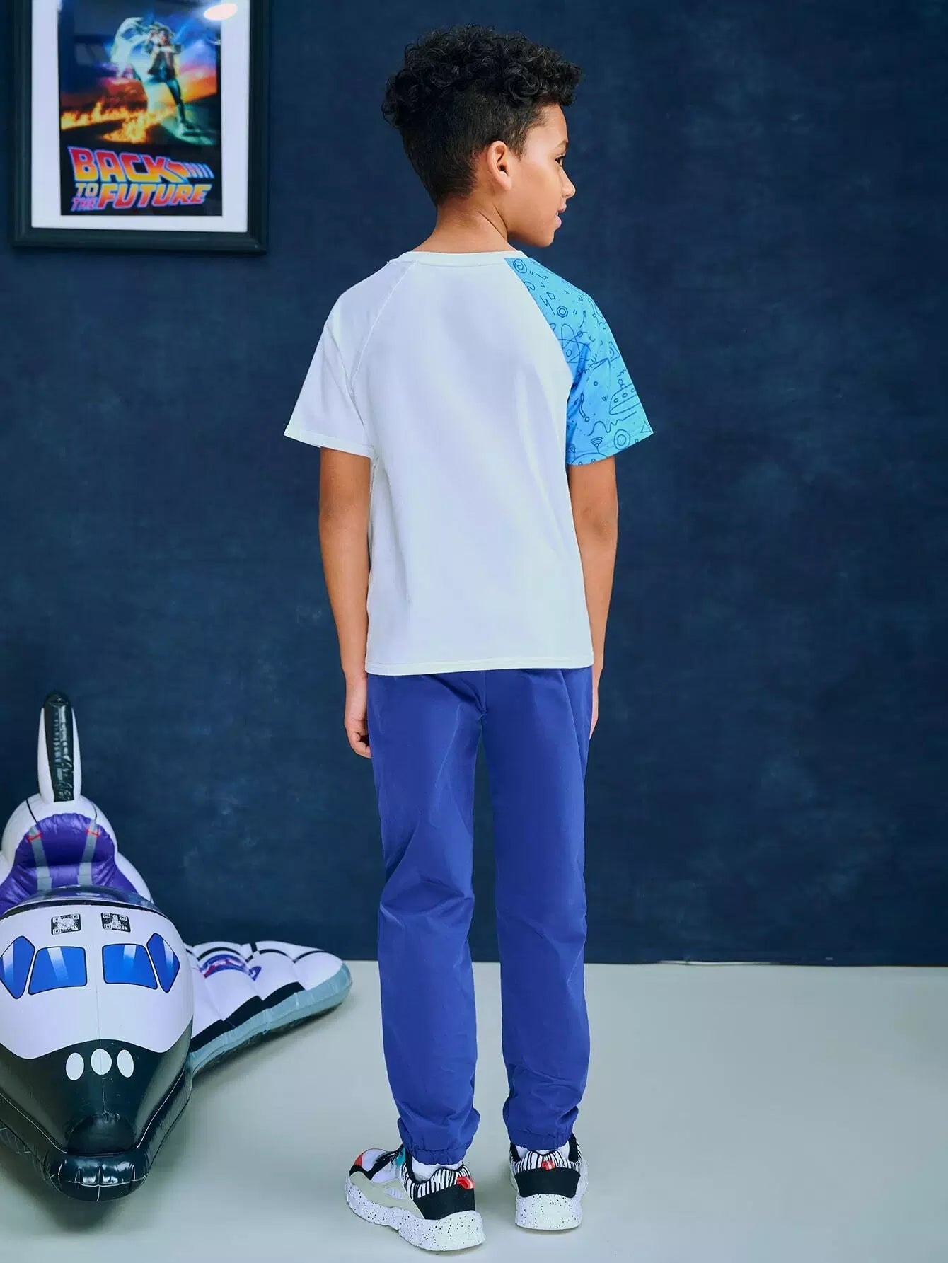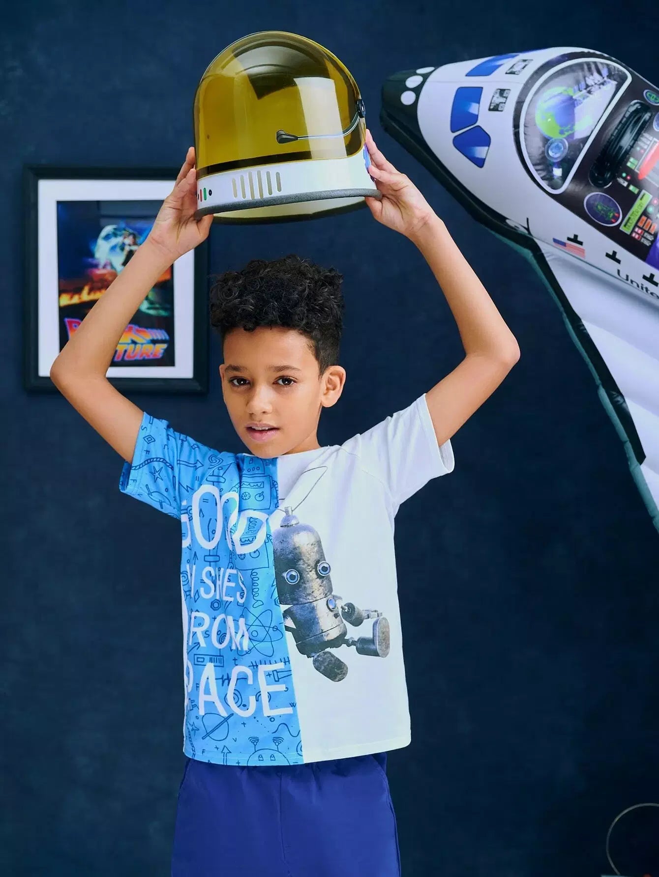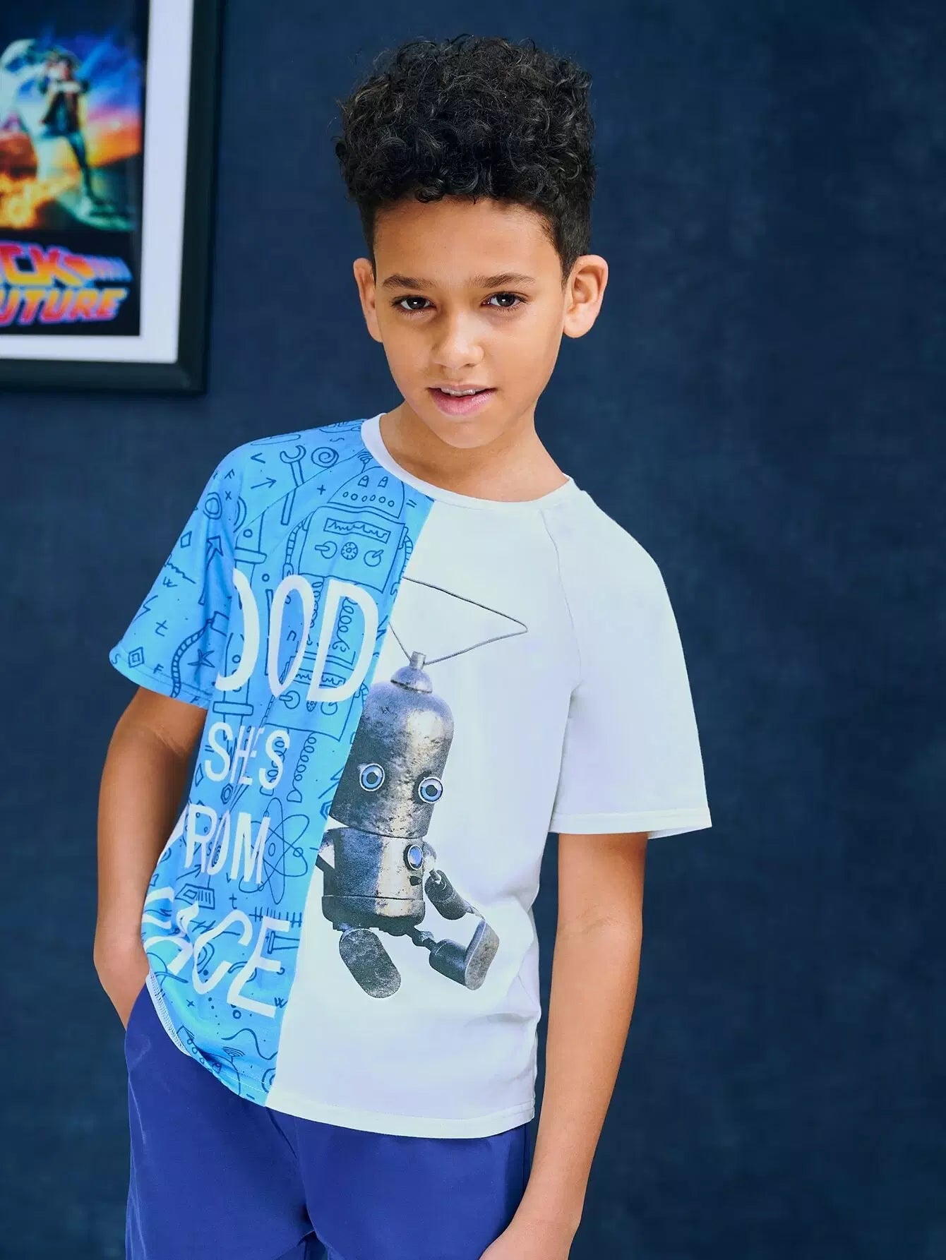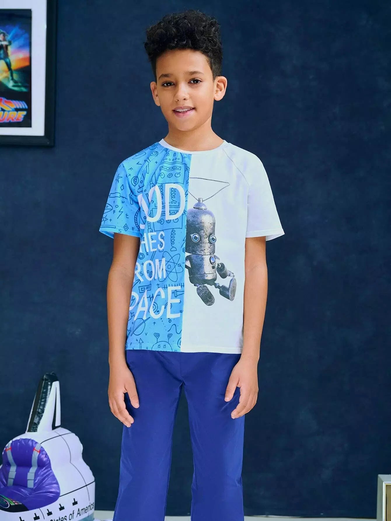 طقم بنطلون وقميص بلونين مزين بحروف ورسومات كرتونية للأولاد