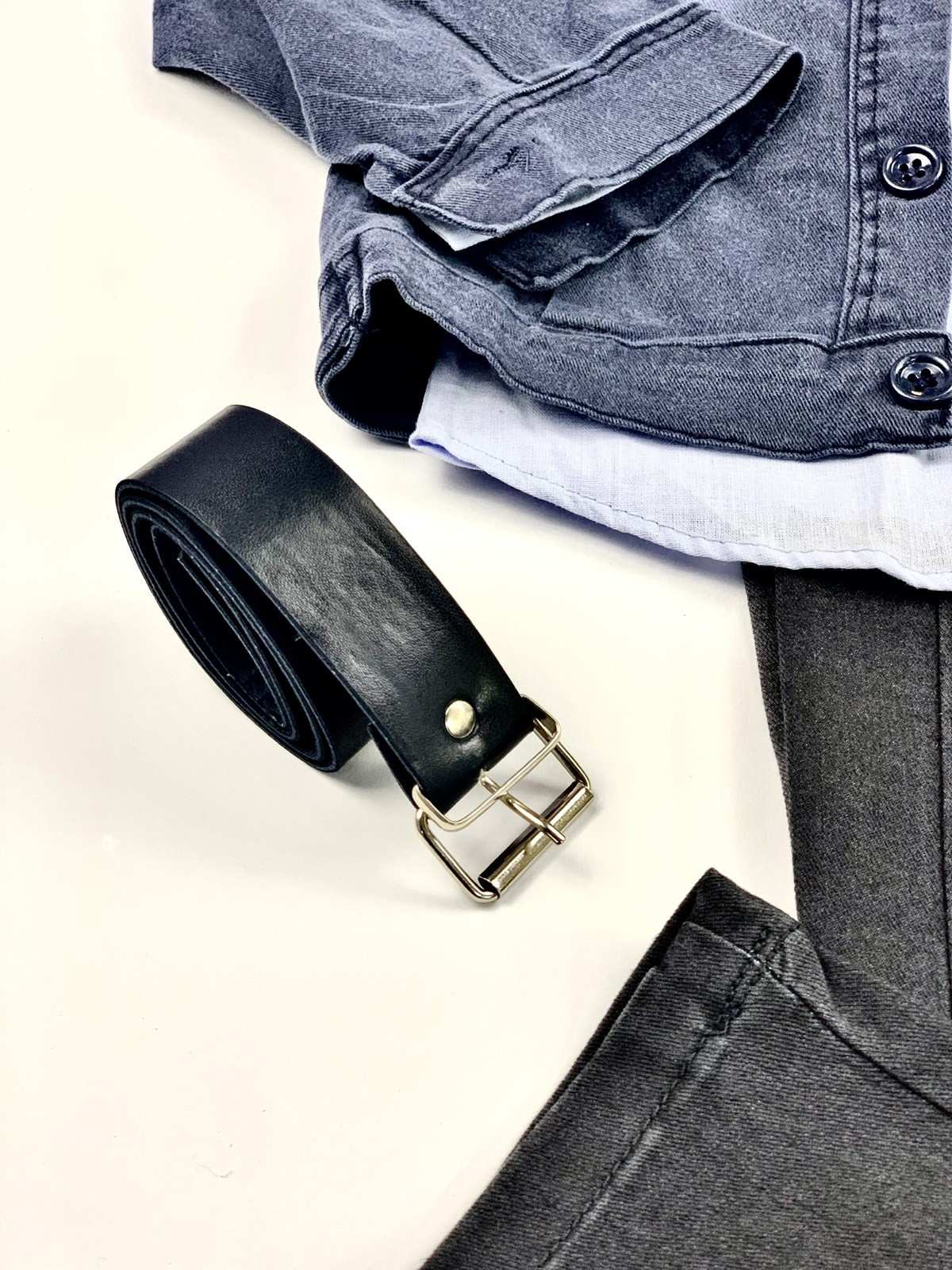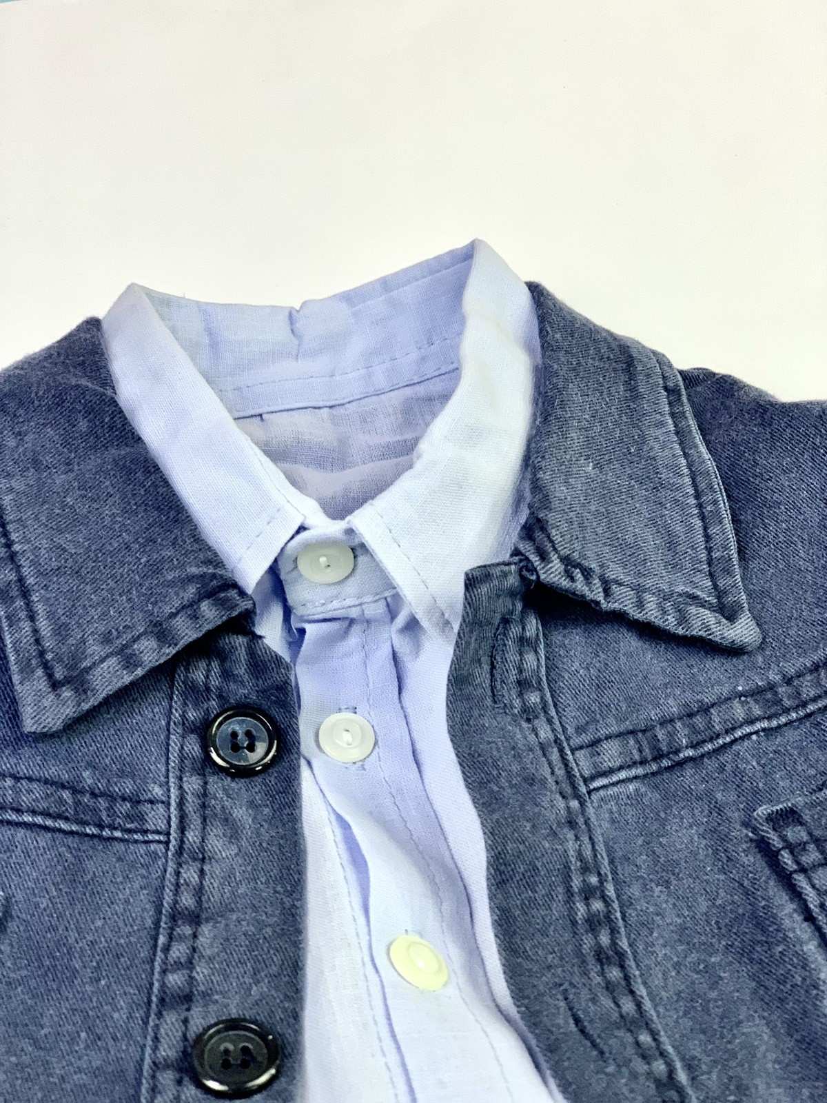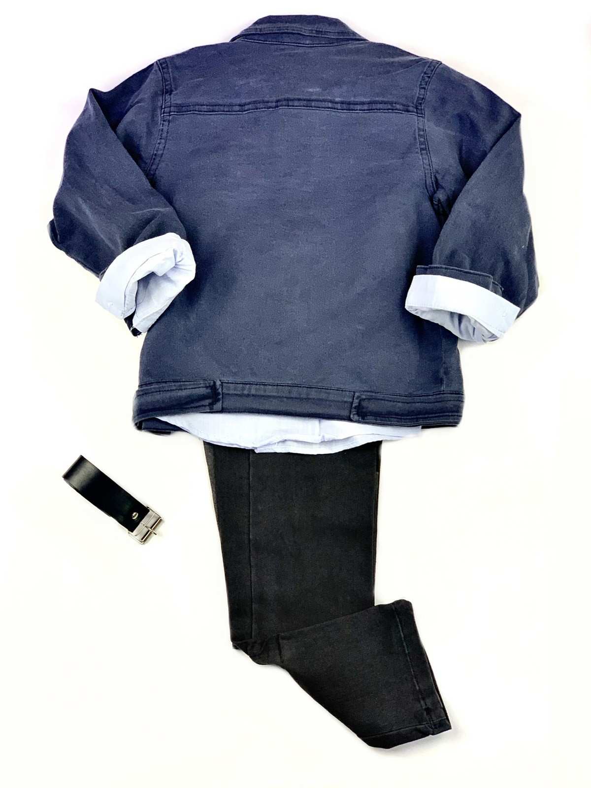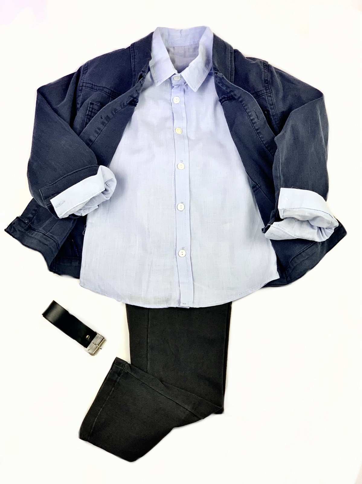 طقم جينز للأولاد باللون الأزرق الداكن مع قميص سماوي وسترة وبدون حزام