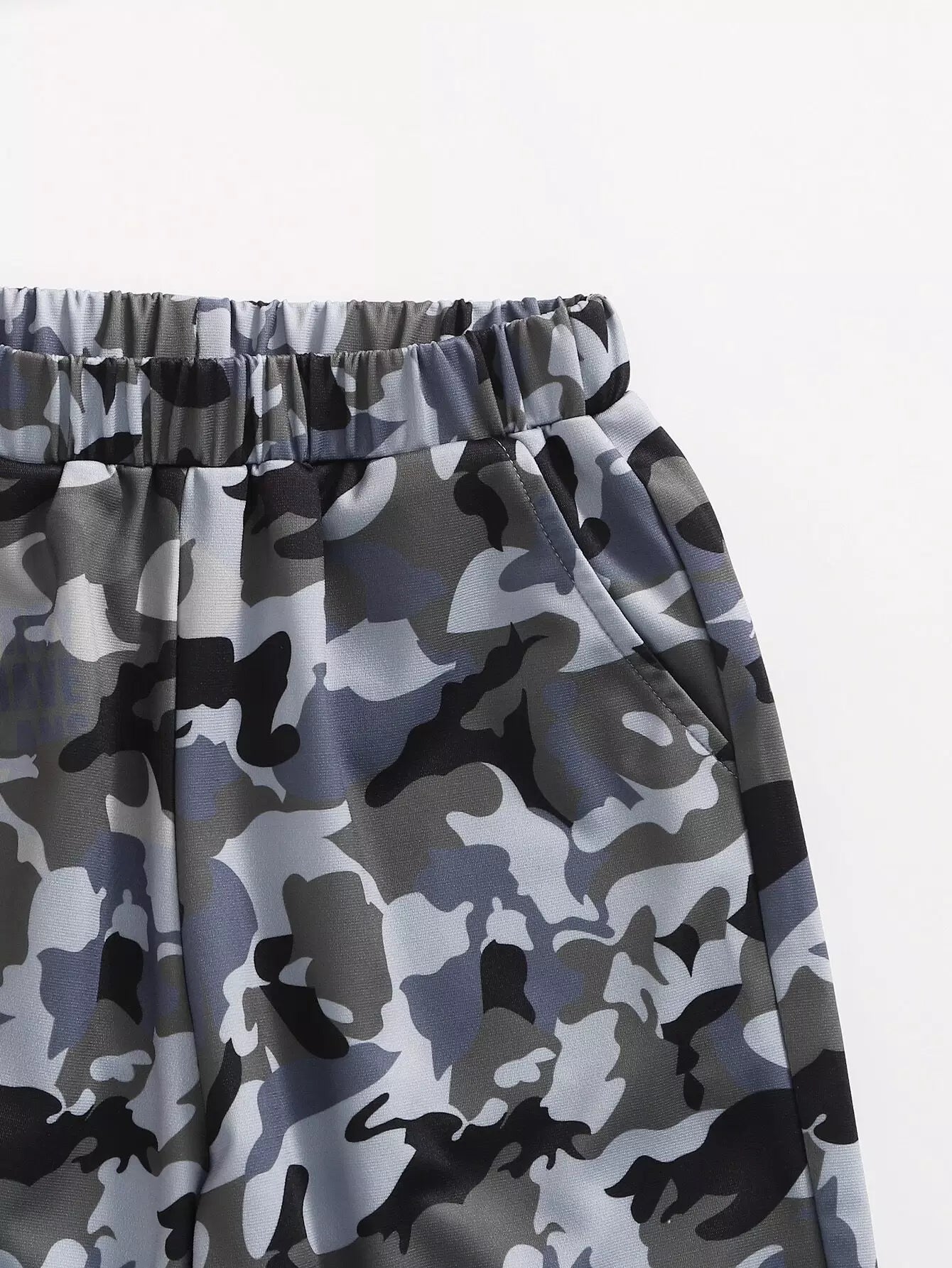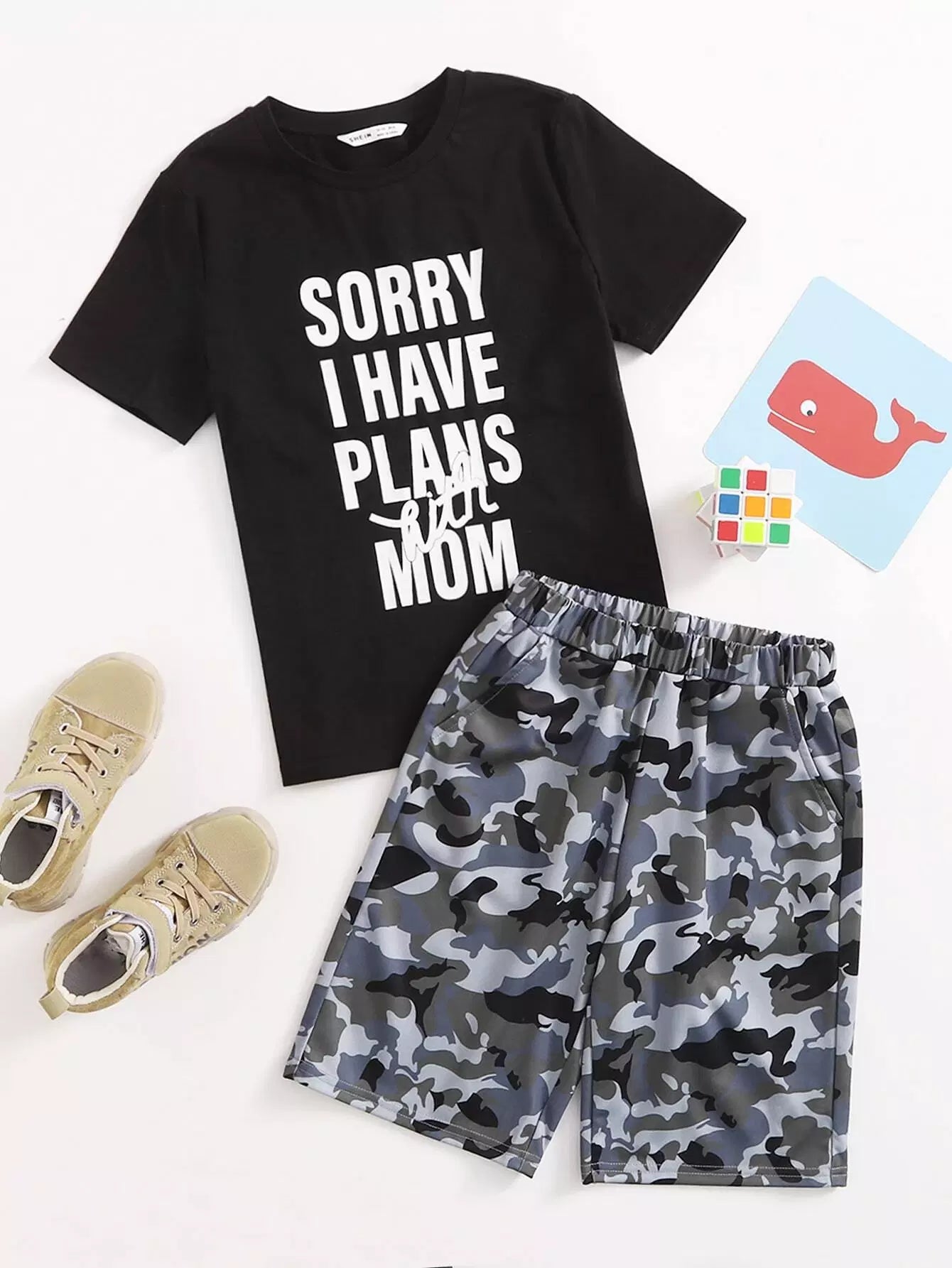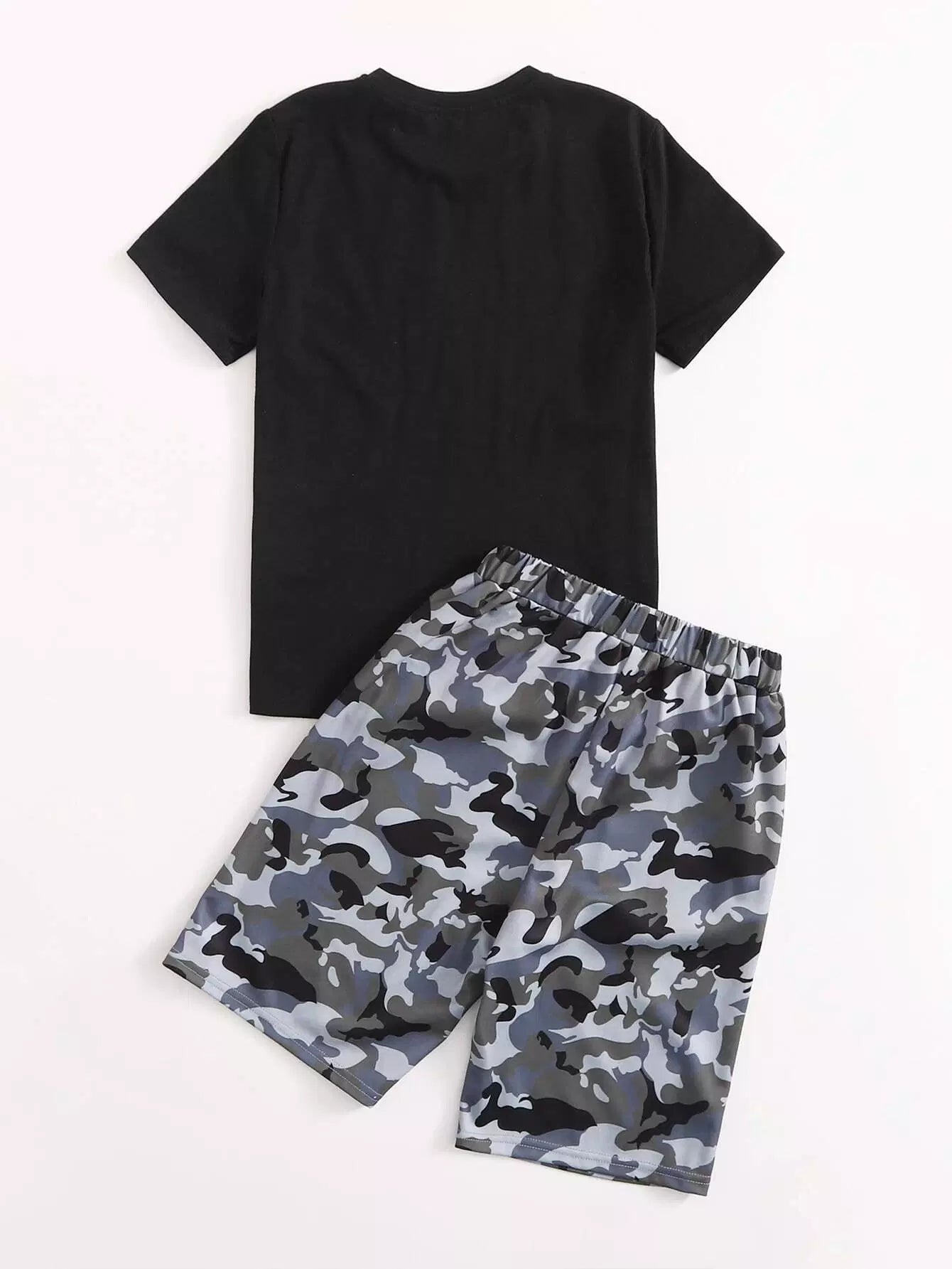 طقم تي شيرت برسومات شعارات وشورت مموه للأولاد