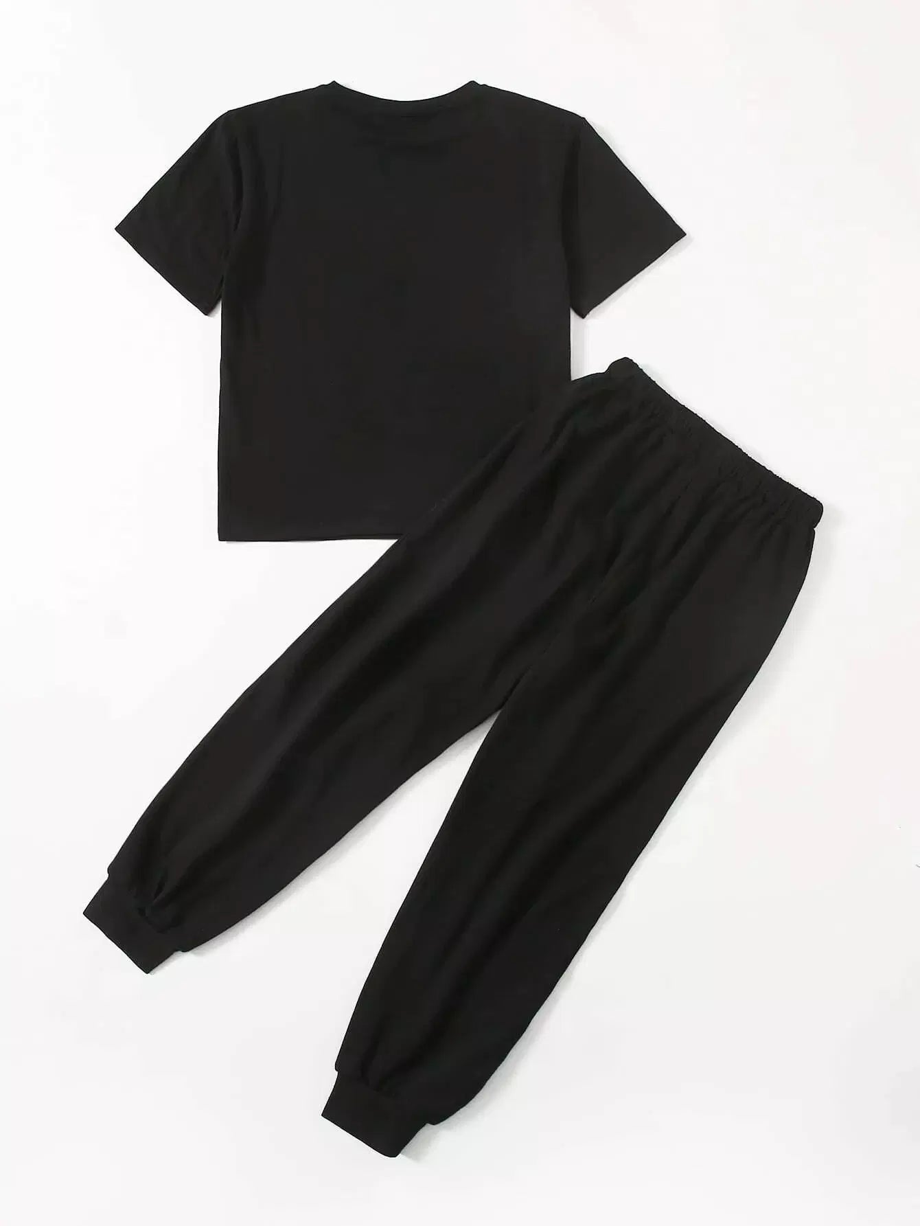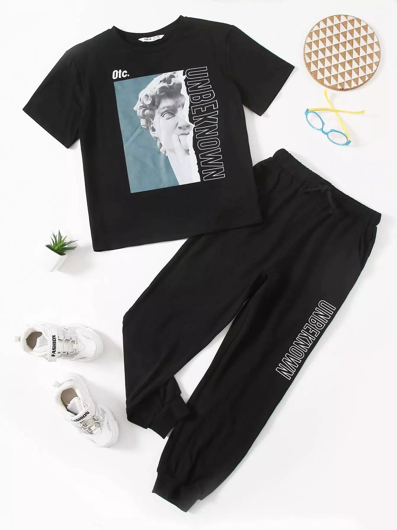 طقم تي شيرت وبنطال رياضي مطبوع عليه تمثال وحروف للأولاد