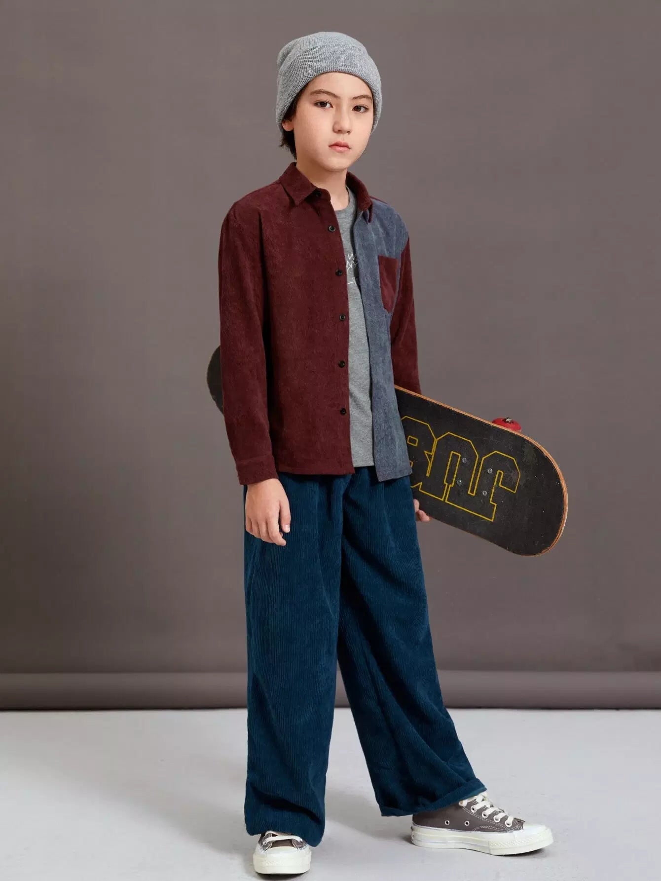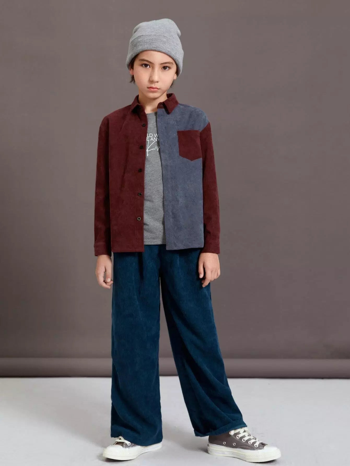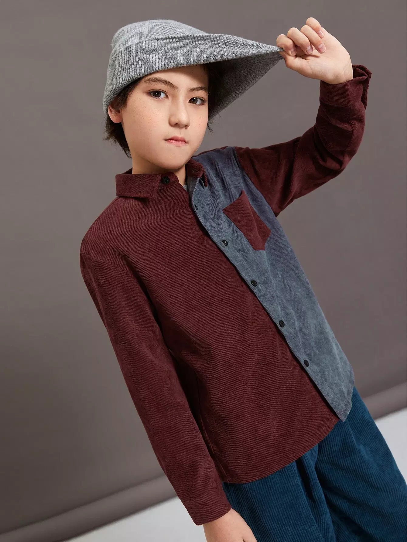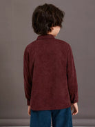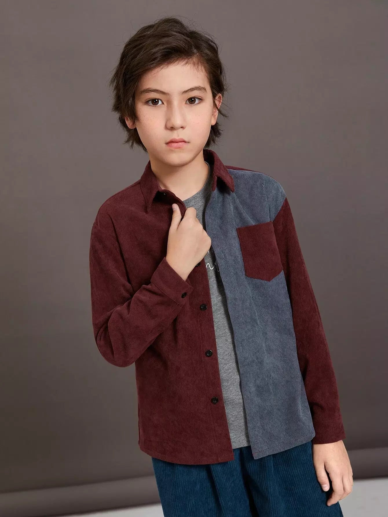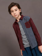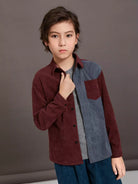 قميص من قماش مخملي بجيوب أمامية ثنائية اللون للأولاد