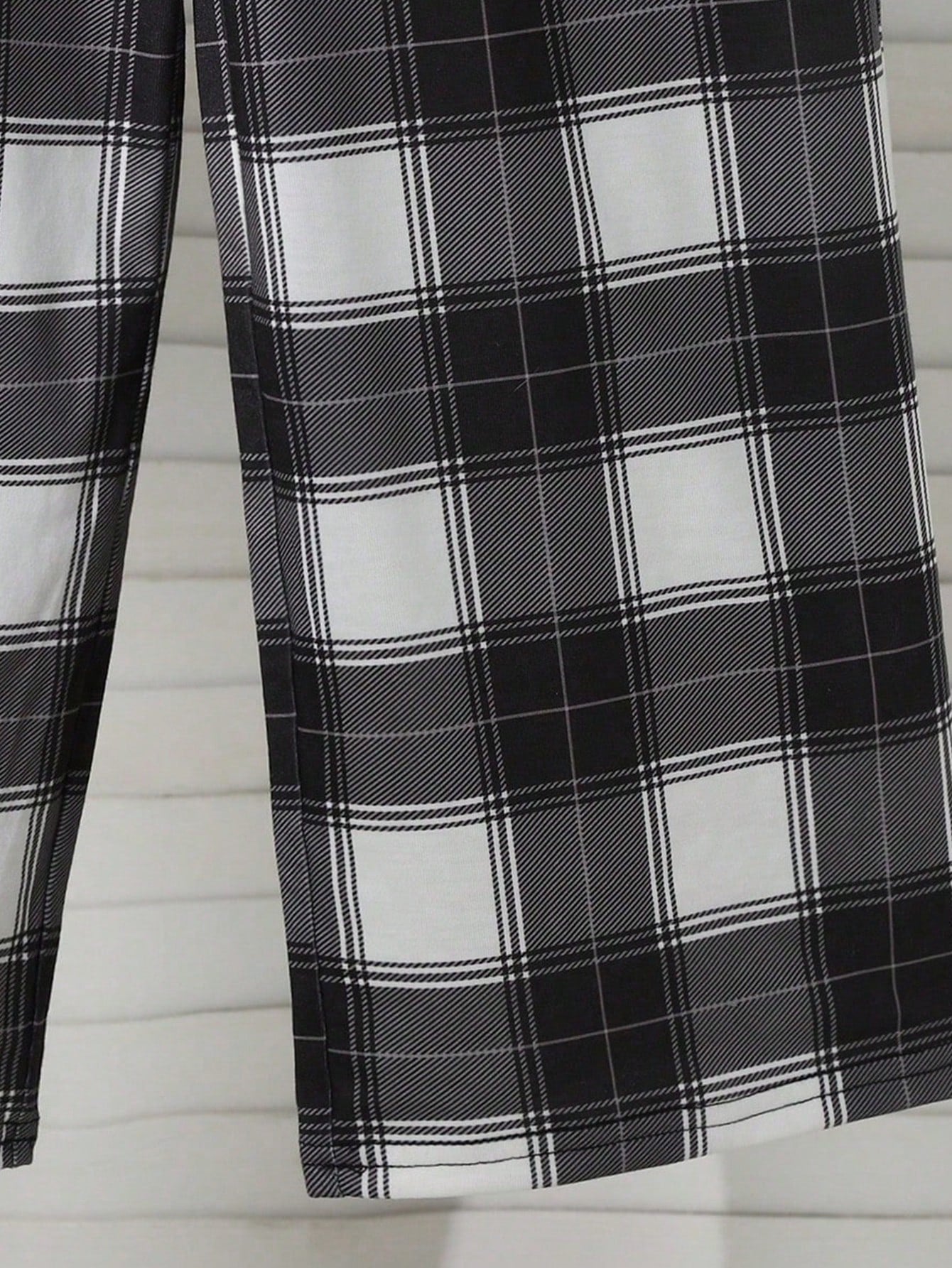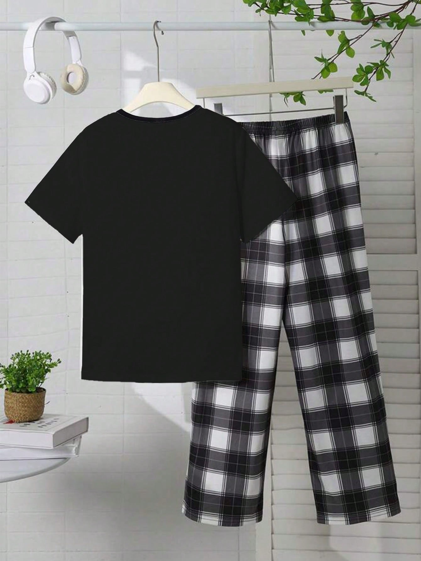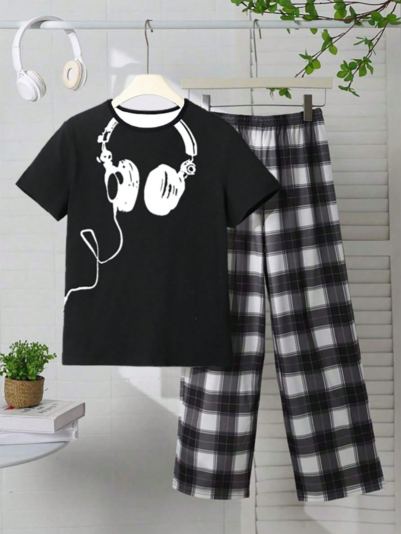 kids Tween Boys Headphone Print Knit Crew Neck Top And Plaid Pattern Pants 2Pcs Short Sleeve Casual Loungewear Set