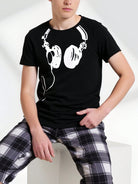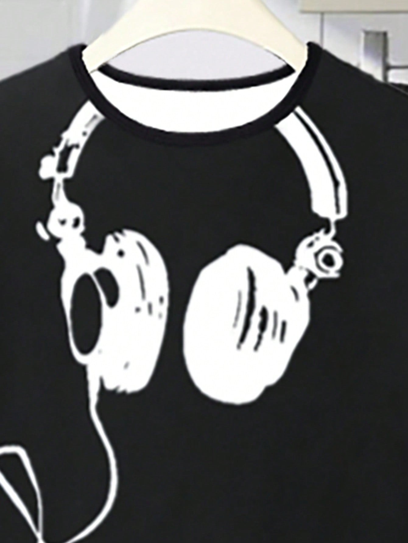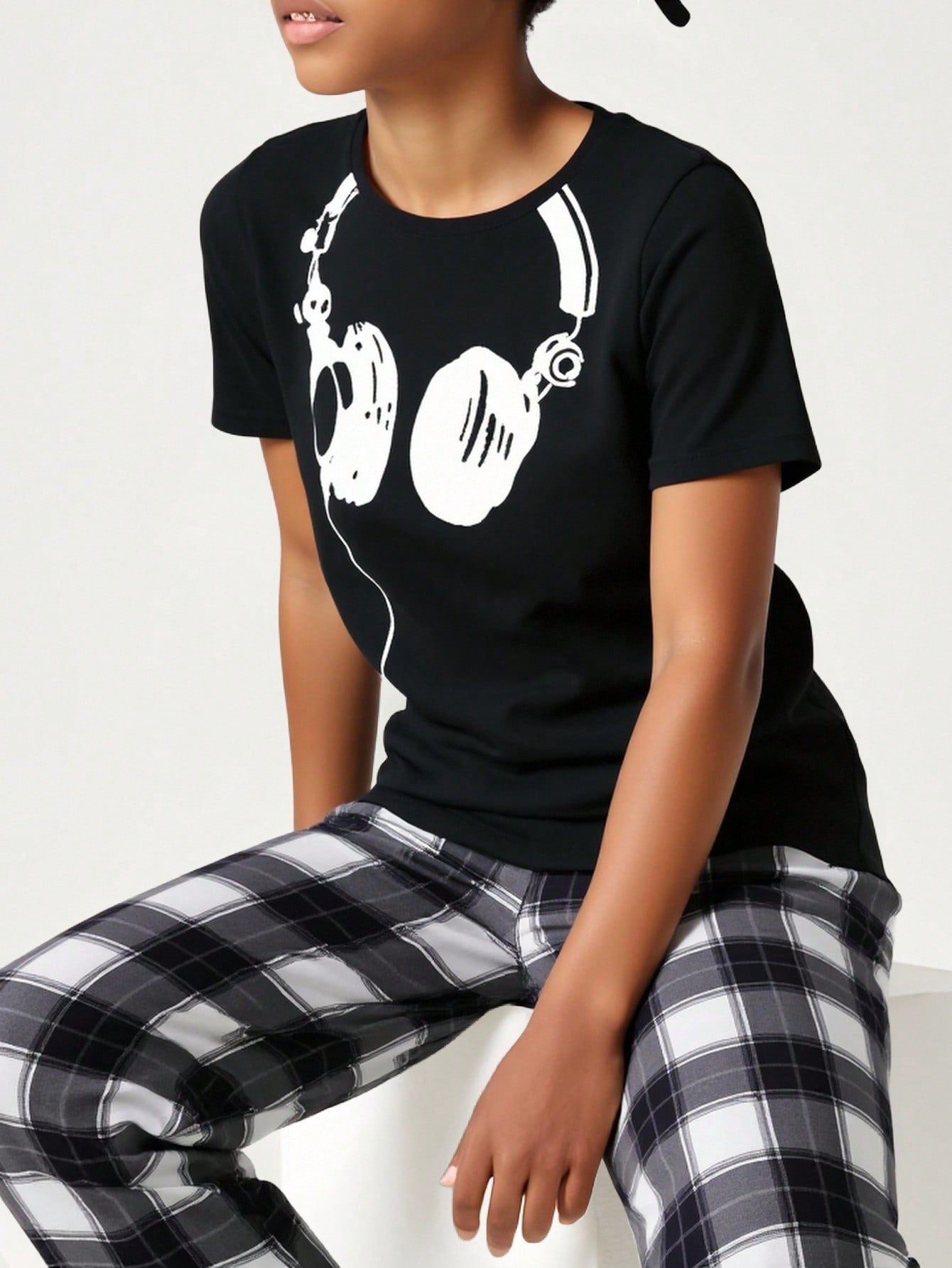 طقم ملابس نوم كاجوال بأكمام قصيرة من قطعتين، بلوزة محبوكة بياقة دائرية وطبعة سماعات رأس للأولاد من توين، وبنطلون بنقشة مربعات