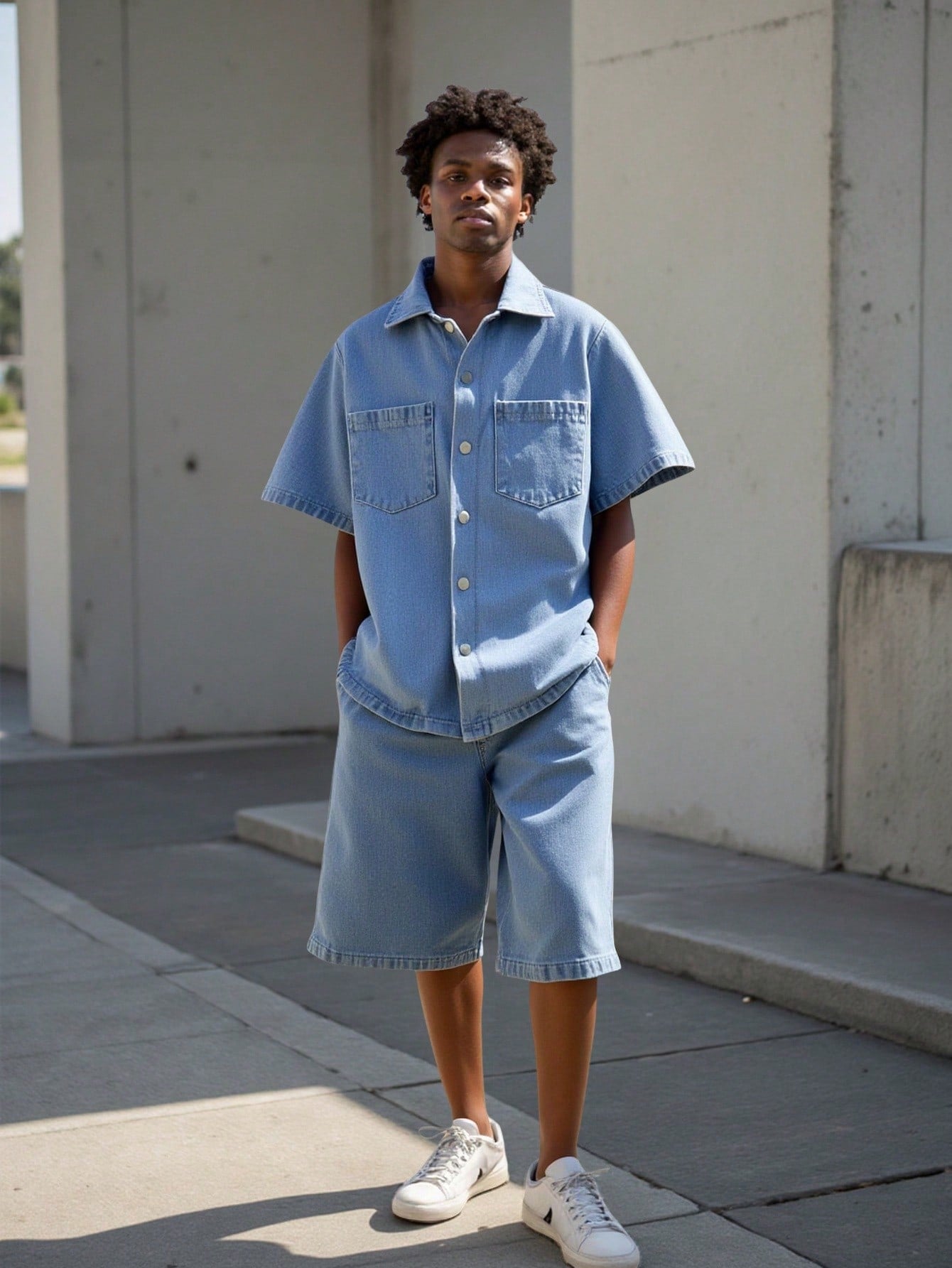 طقم من قطعتين للأولاد المراهقين، تيشيرت بولو أزرق فاتح من الدنيم الأصلي، مغسول بحمض، بياقة وأزرار أمامية وحزام مطاطي