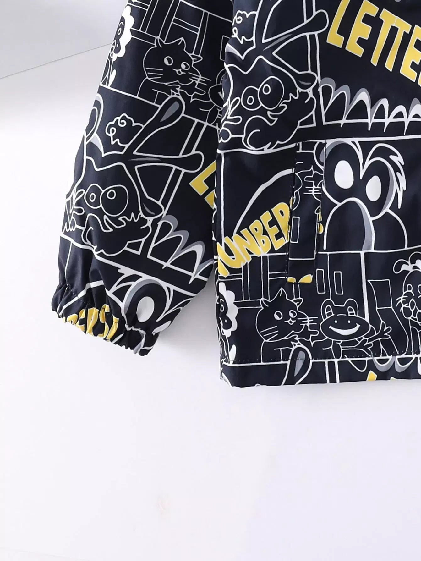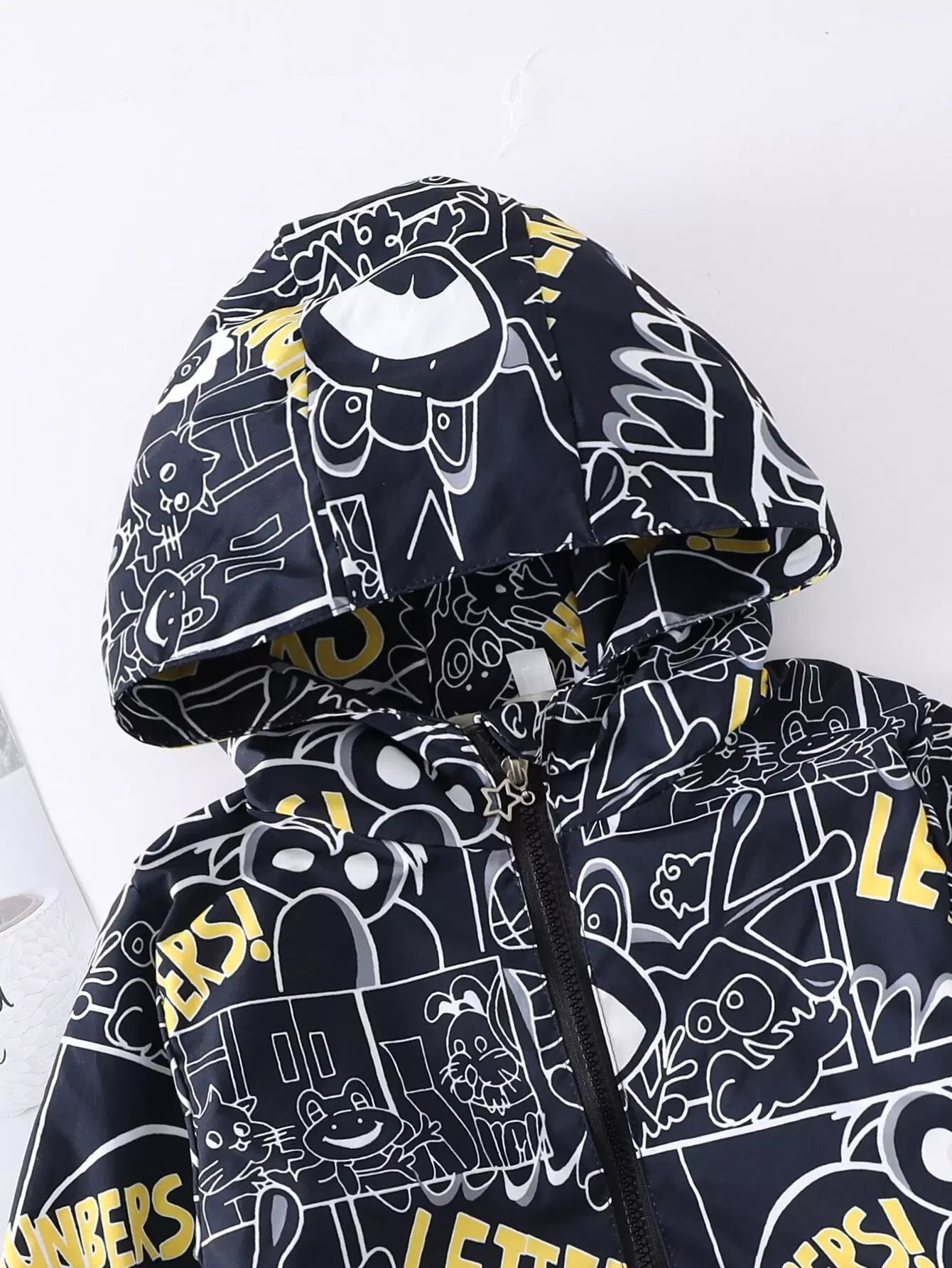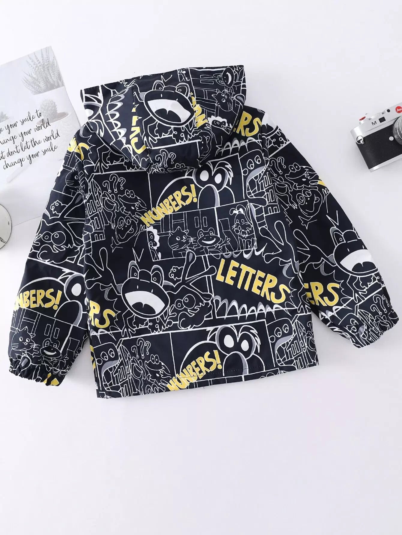 جاكيت بقبعة بغطاء للرسم الهزلي للأولاد مطبوع عليه سحاب بغطاء رأس