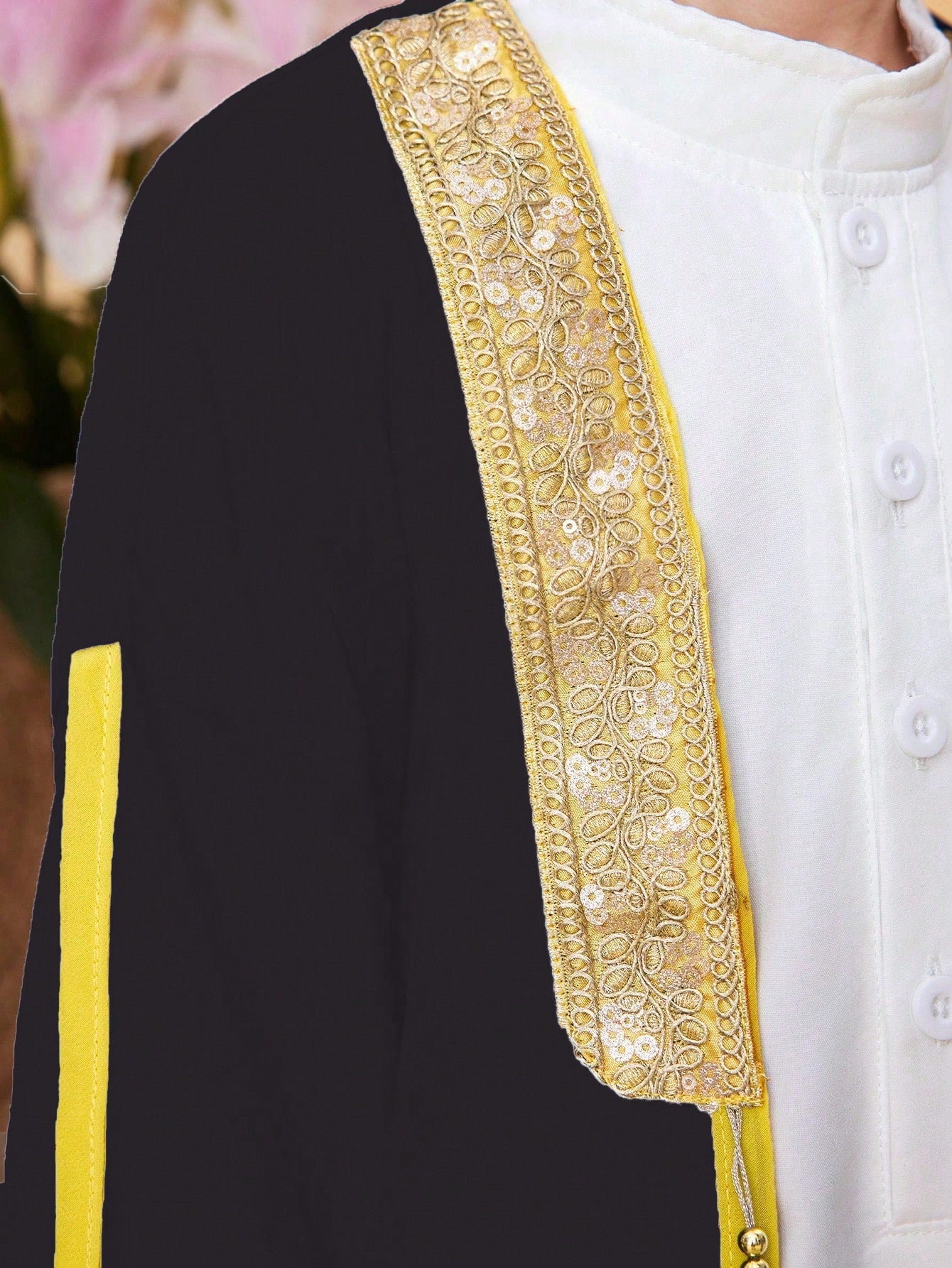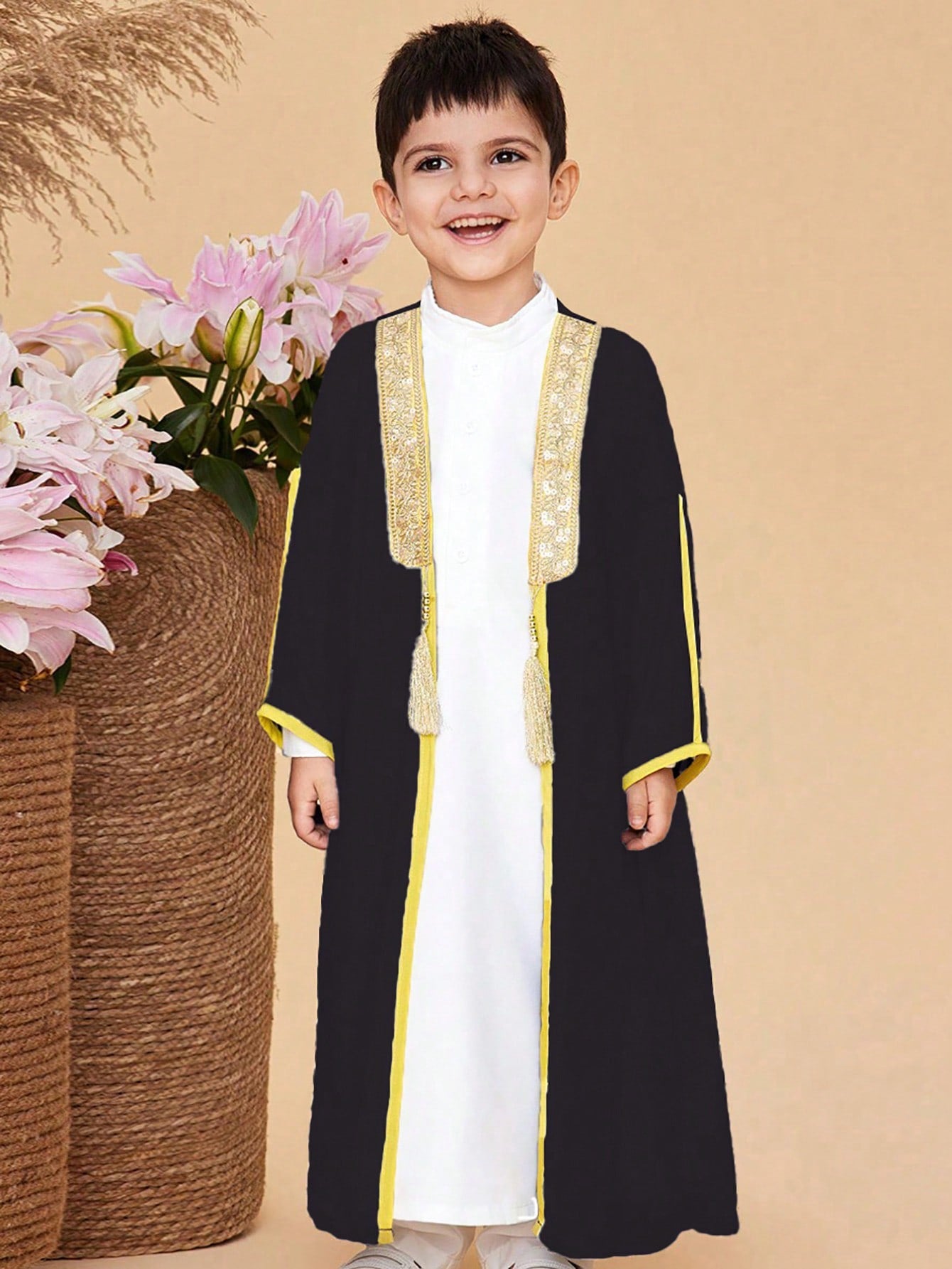 طقم مكون من قطعتين للأولاد الصغار: رداء بأكمام طويلة وقميص طويل، مصنوع من نسيج متباين الألوان.