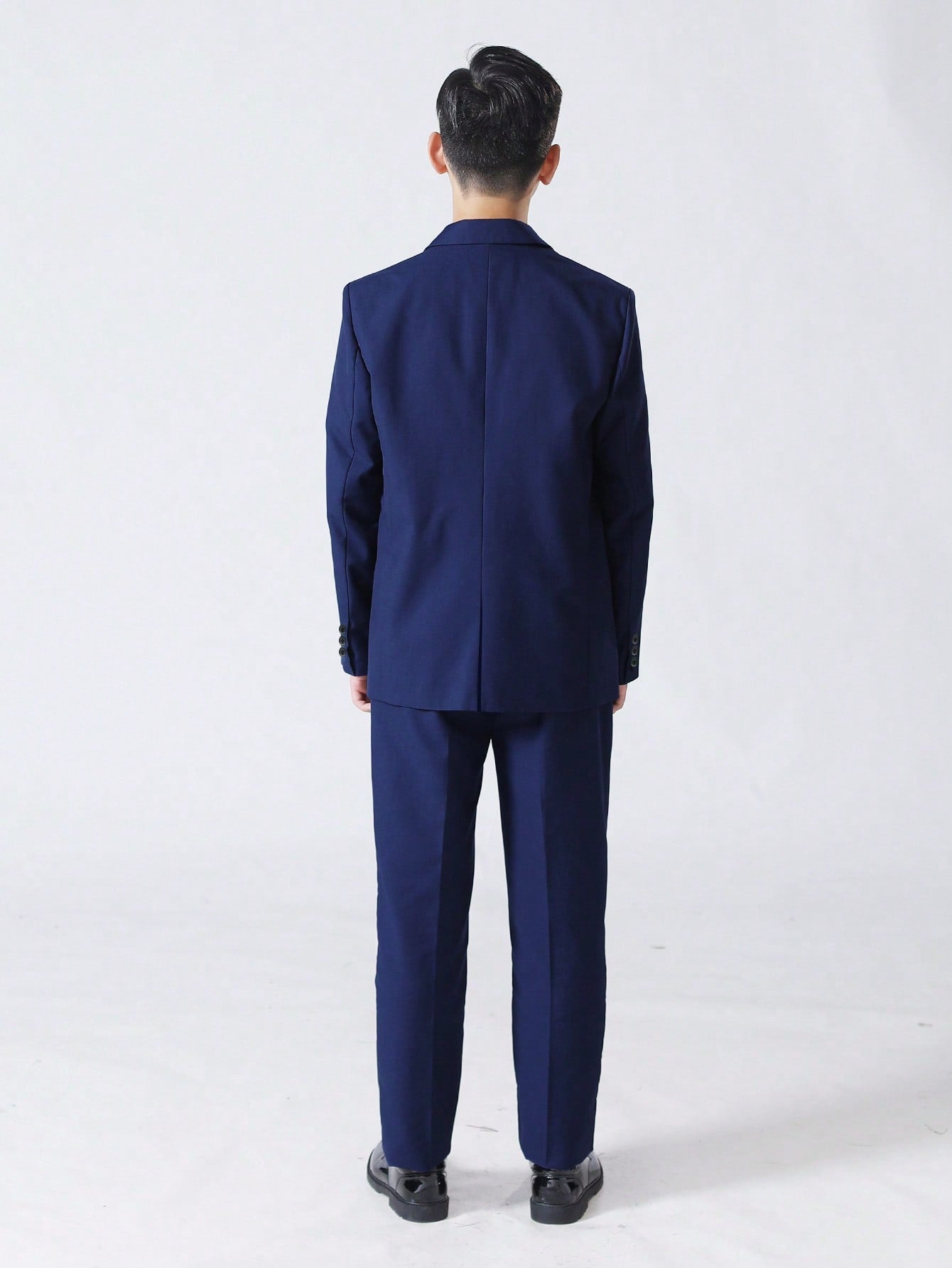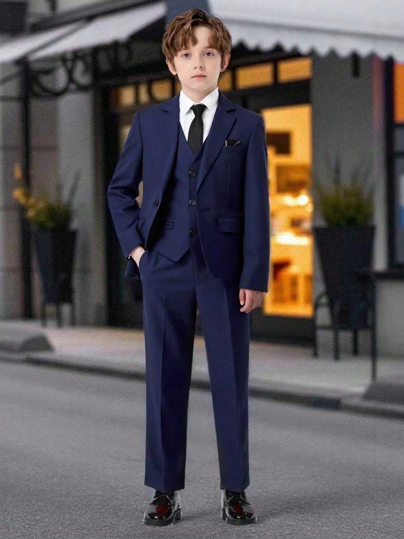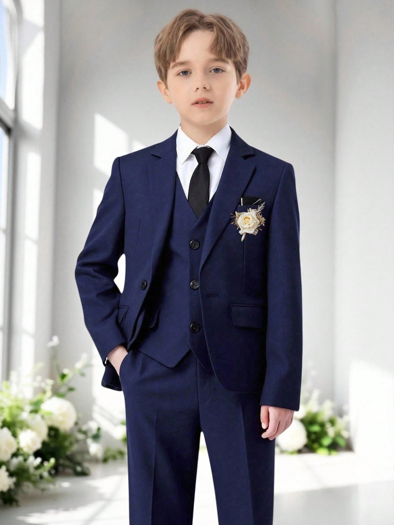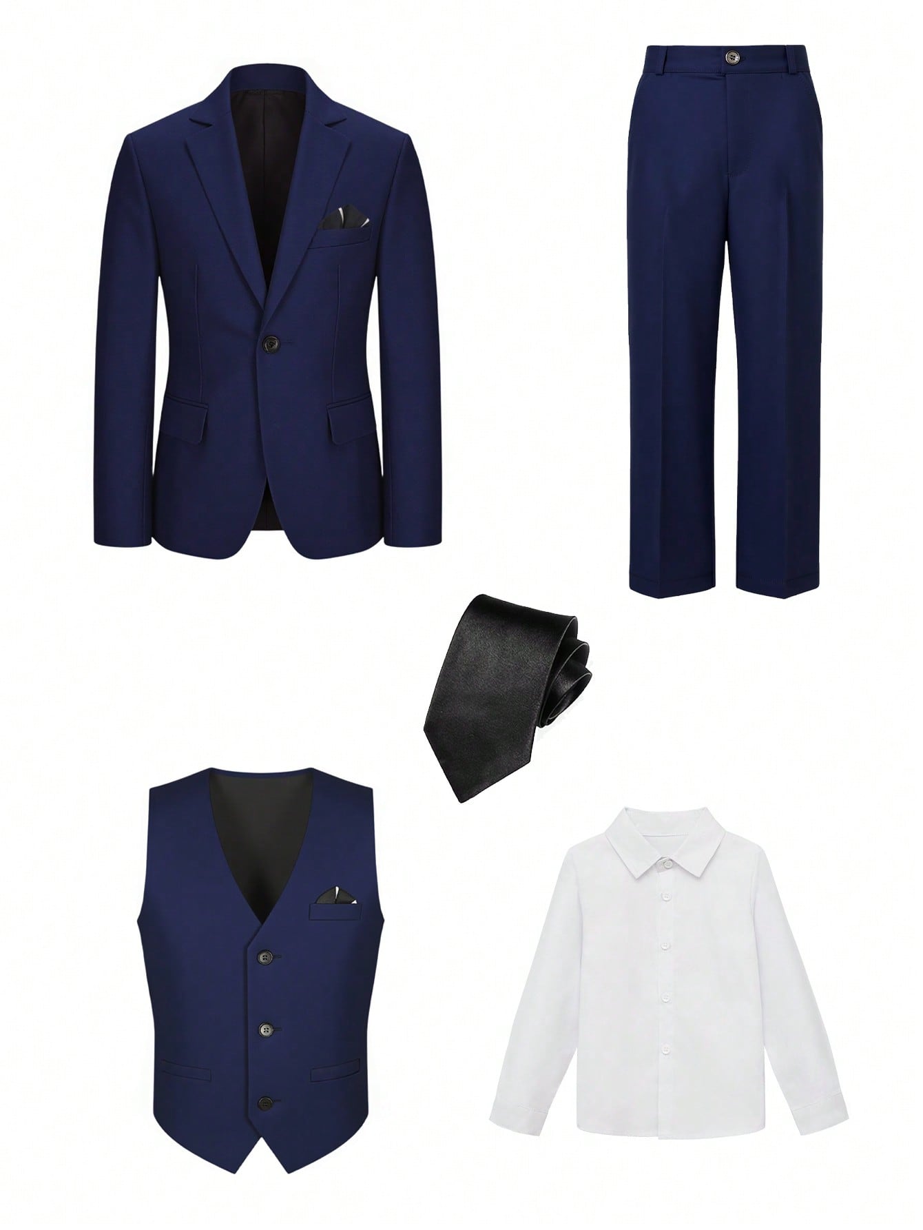 طقم بدلة للأولاد من 5 قطع - سترة بياقة مدببة + صدرية بصف أزرار واحد + بنطال بخصر نصف مطاطي + قميص أبيض سادة + ربطة عنق