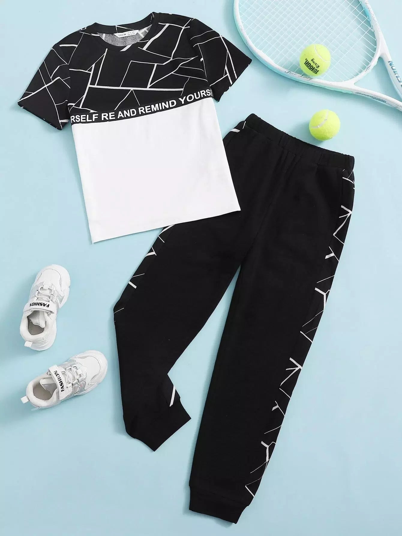 طقم تي شيرت بطبعة شعار جغرافية وبنطلون رياضي مخطط جانبي للأولاد