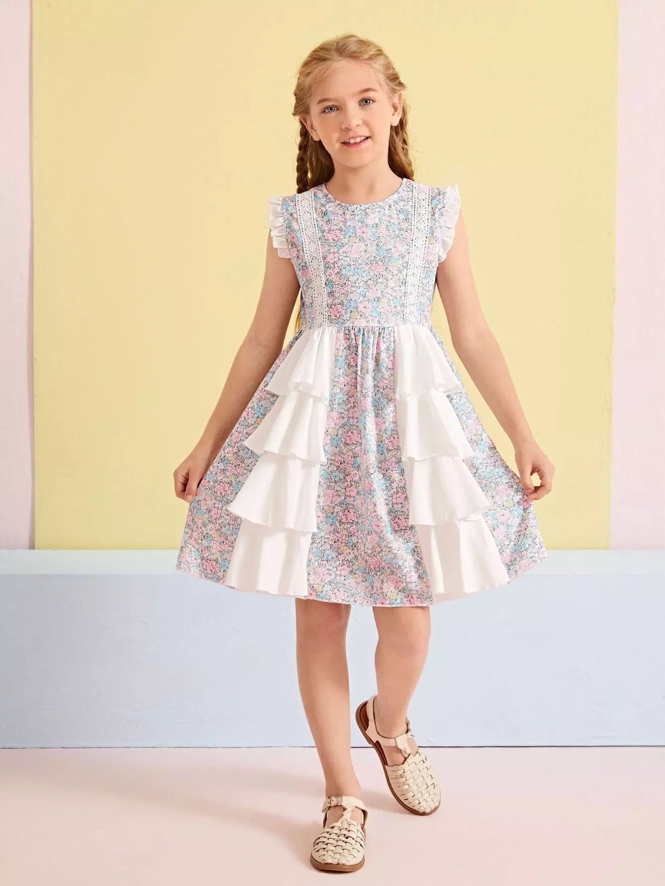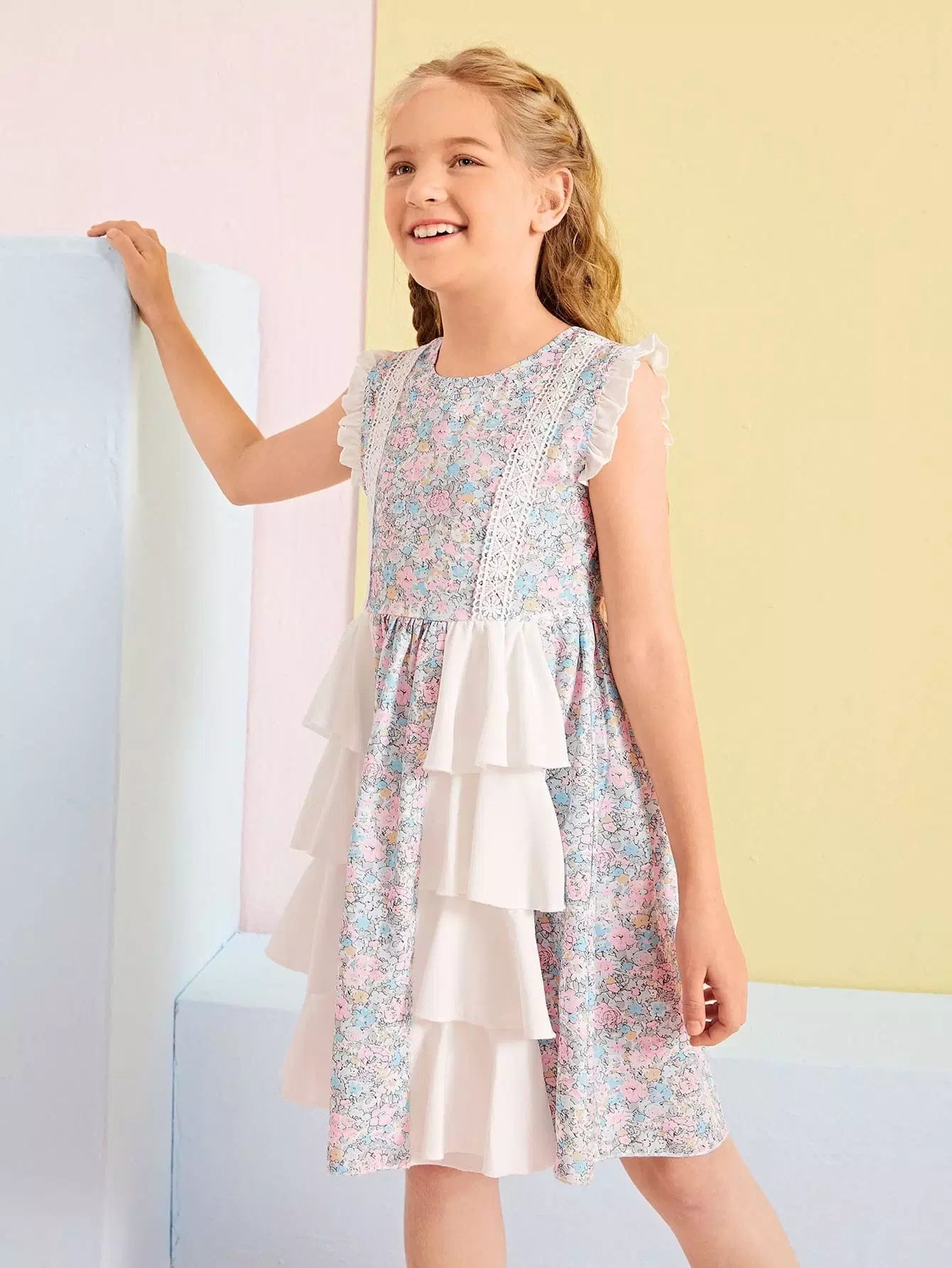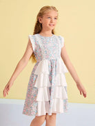 الأطفال - فستان شبكي متباين بحاشية ذات طبقات مكشكشة مزين بالزهور للفتيات