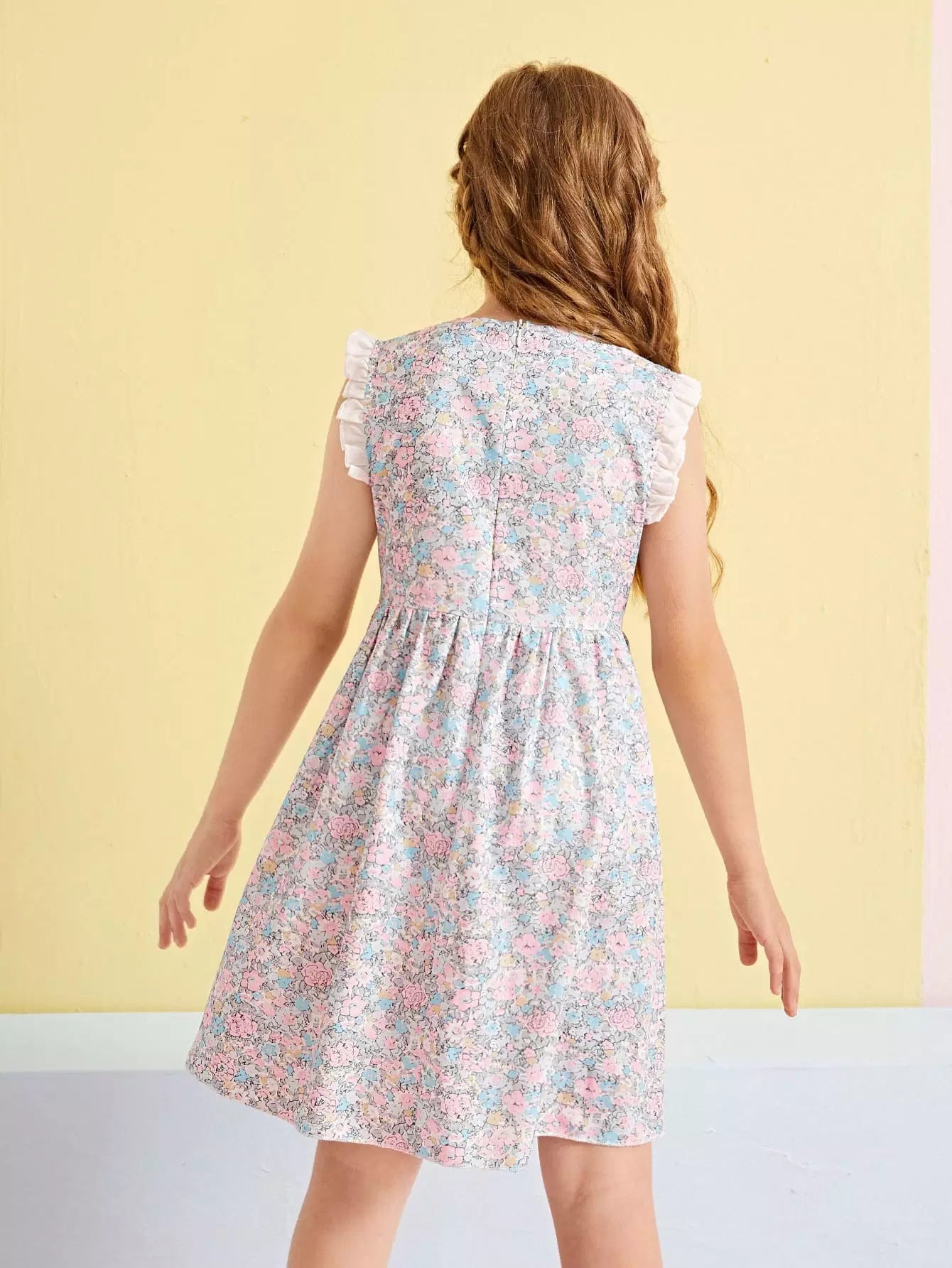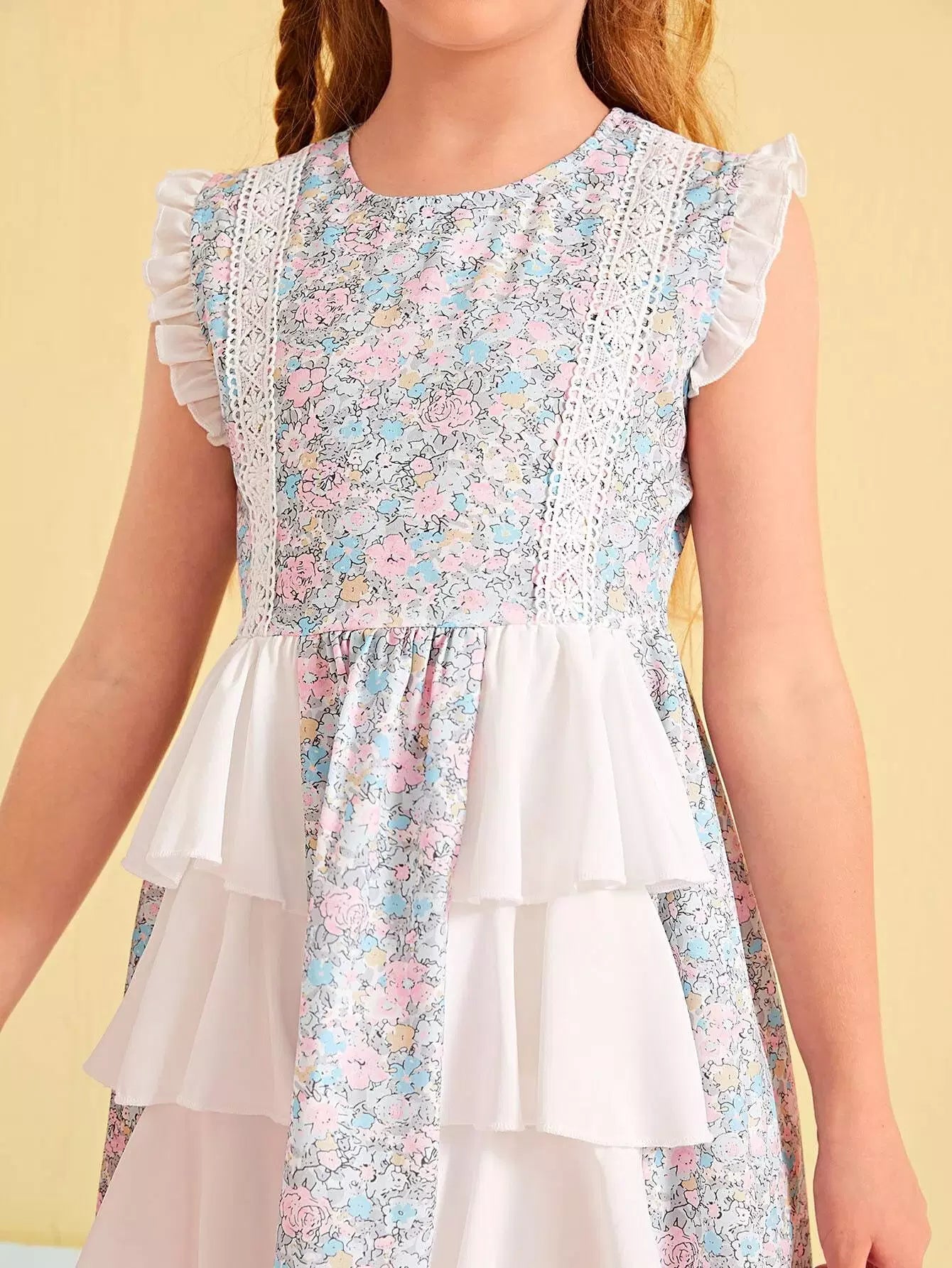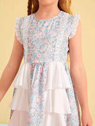 فستان بناتي من القماش الشبكي المتباين ذو الحواف المكشكشة والمزخرف بالزهور