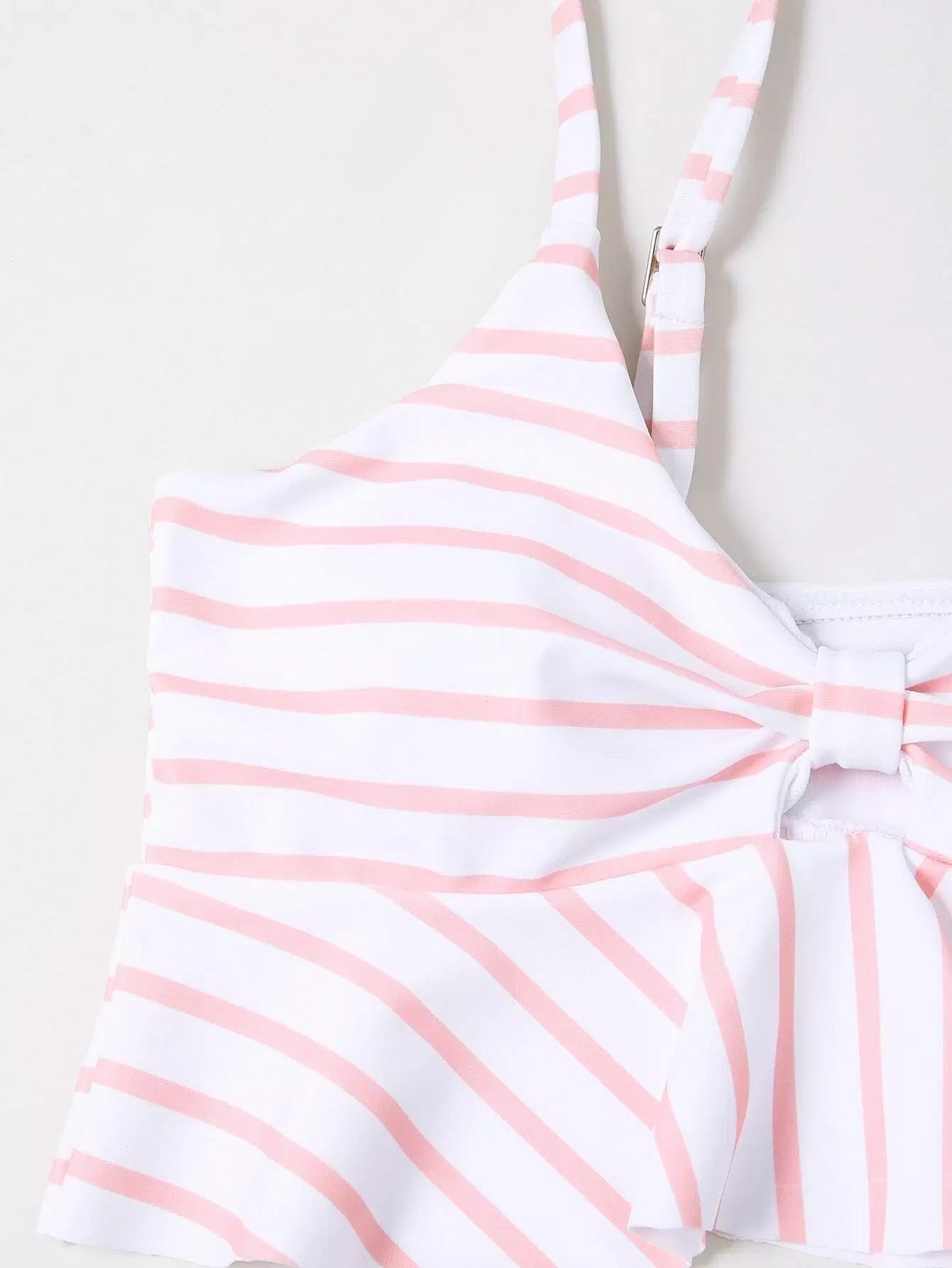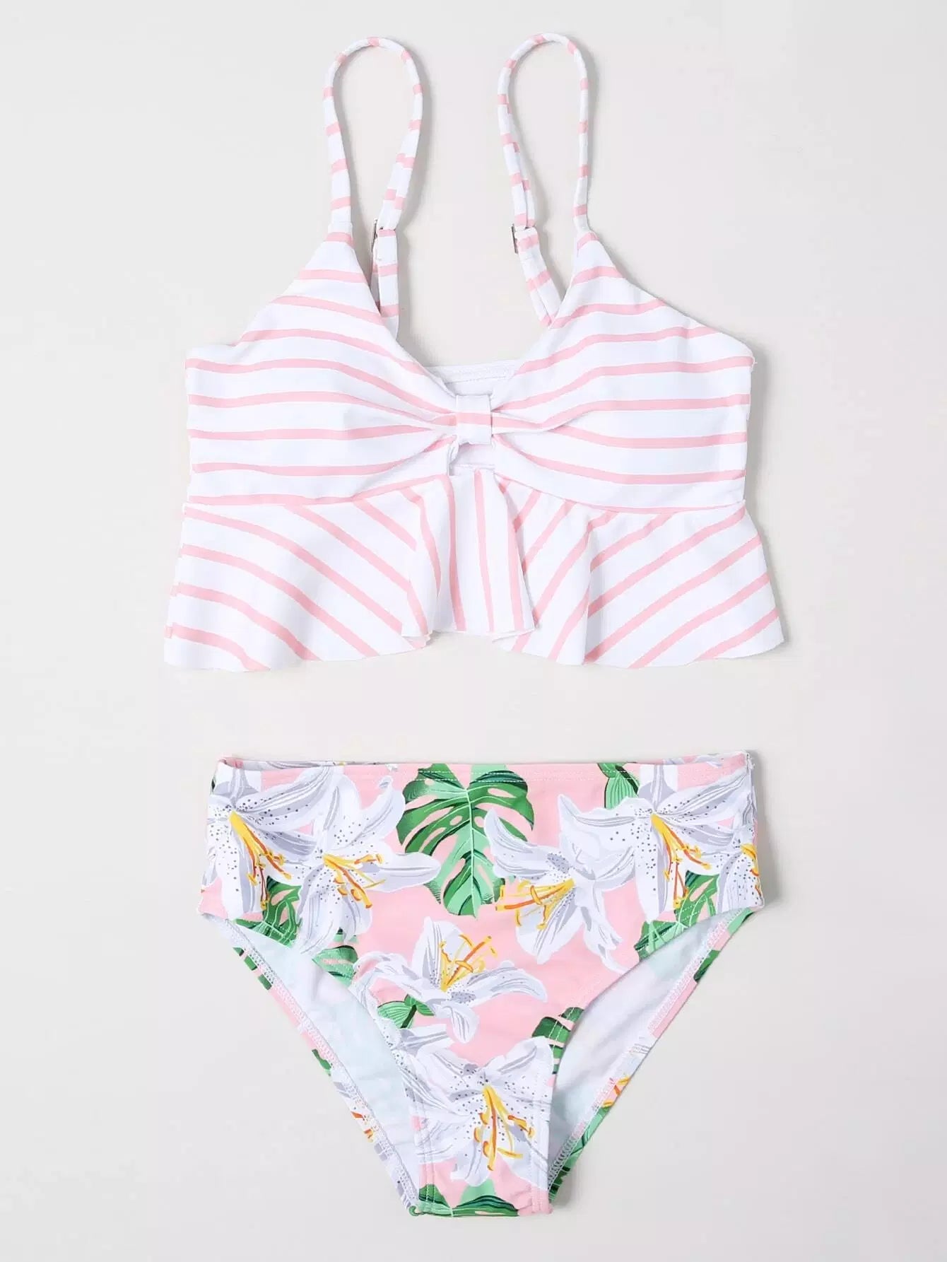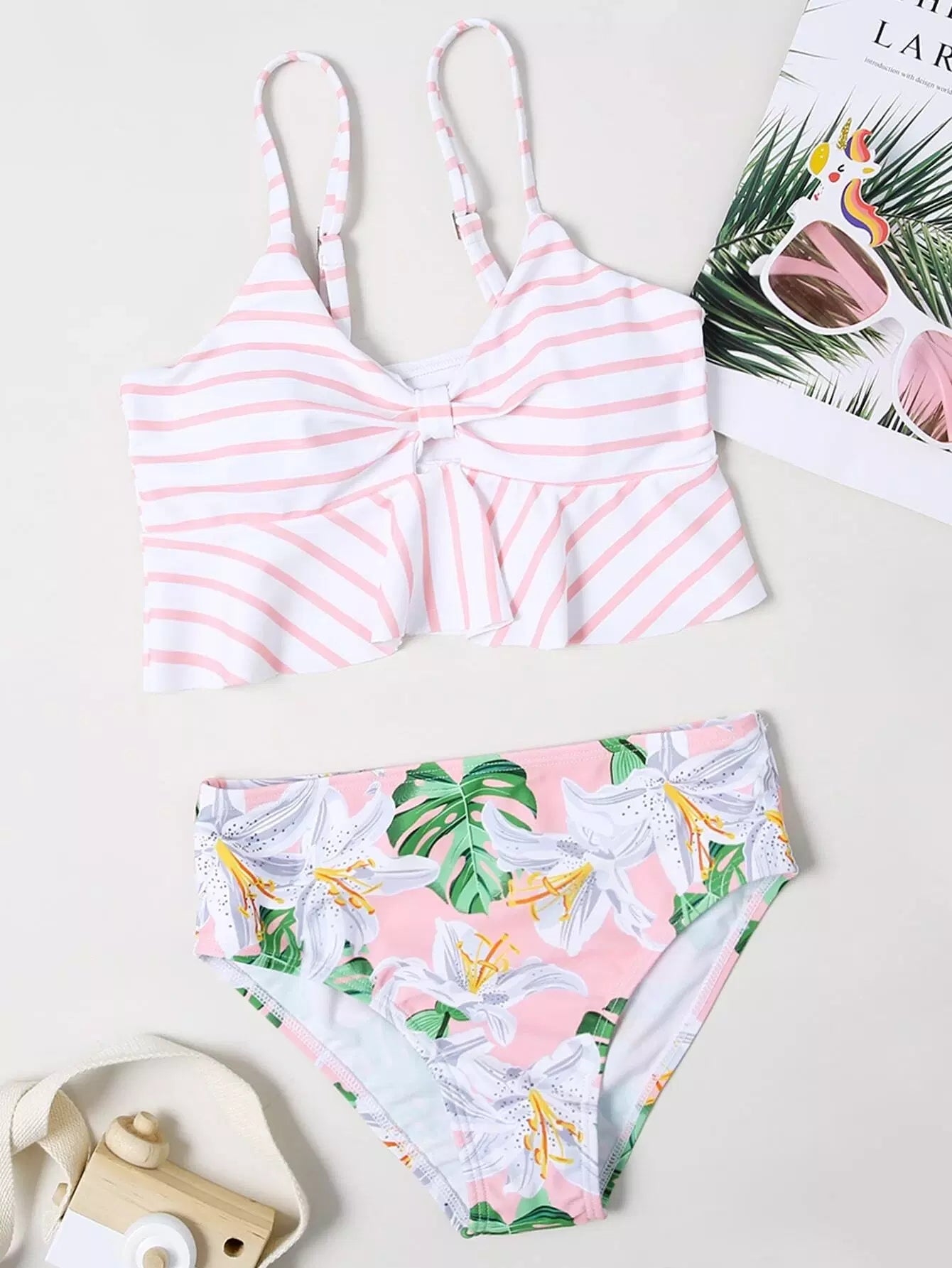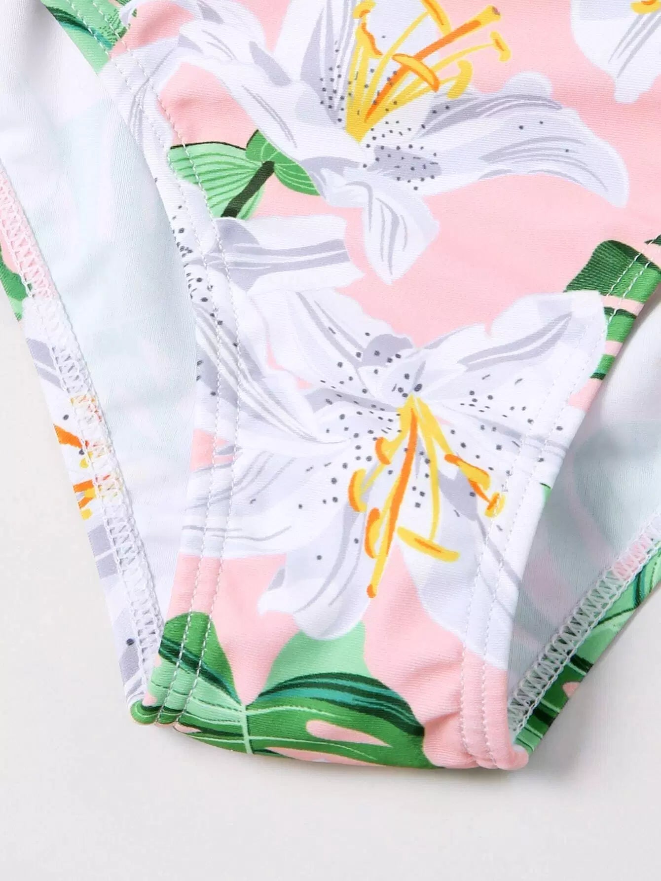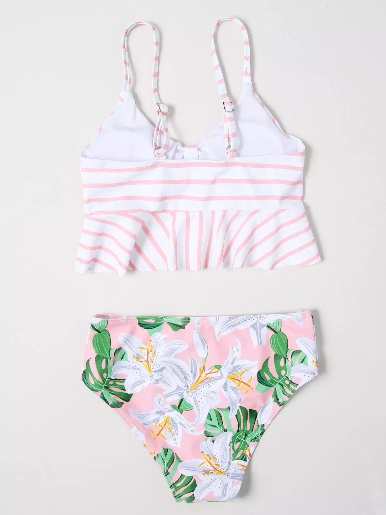 ملابس سباحة بيكيني بكيني بناتي مزين بالزهور والكشكشة