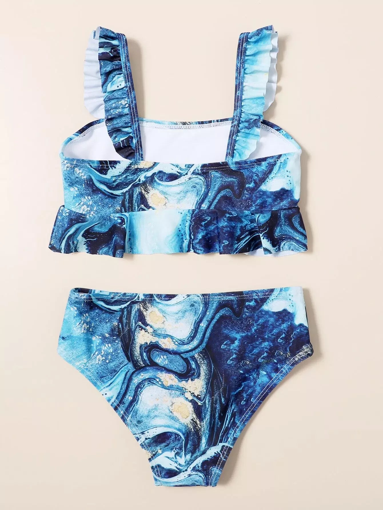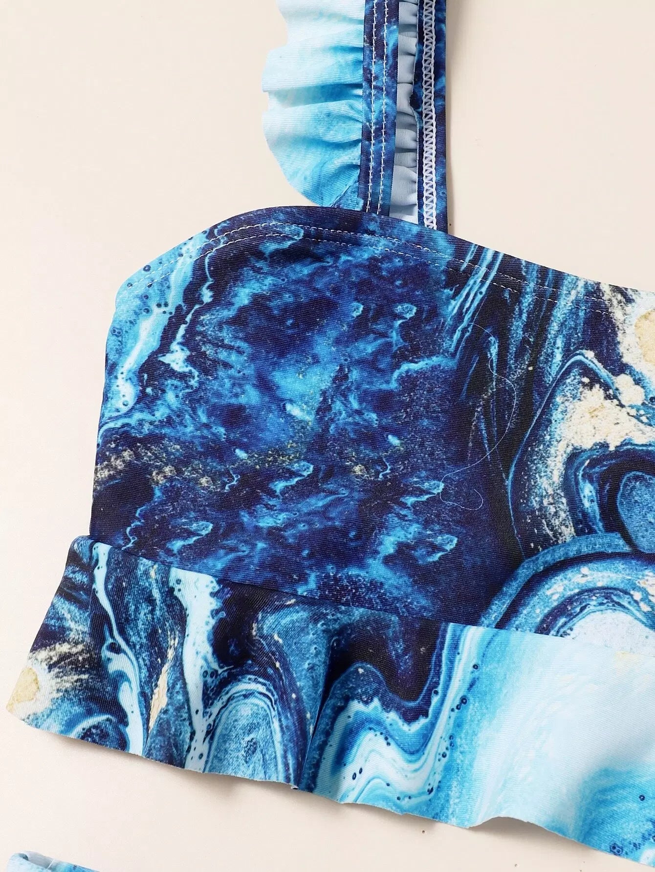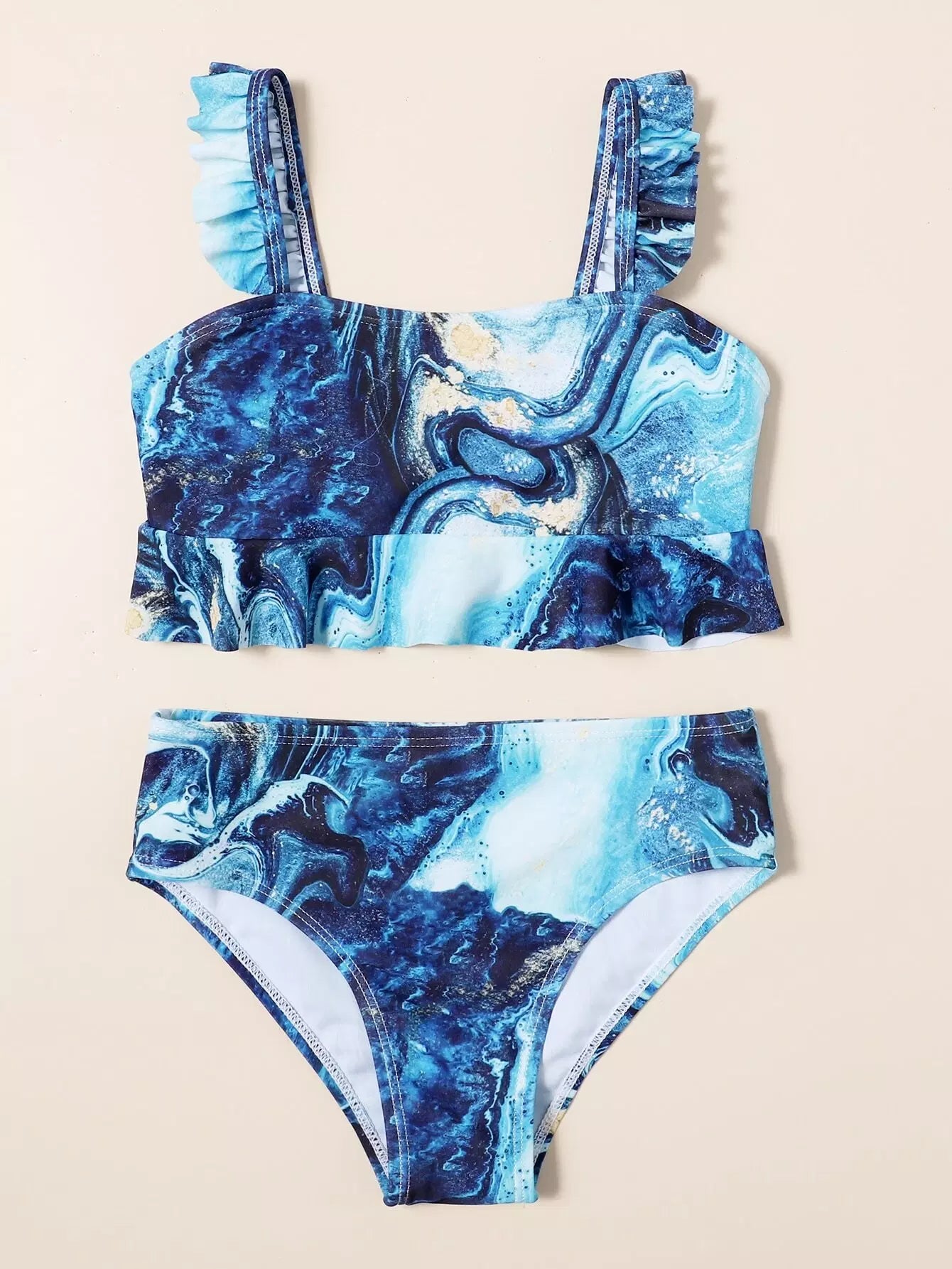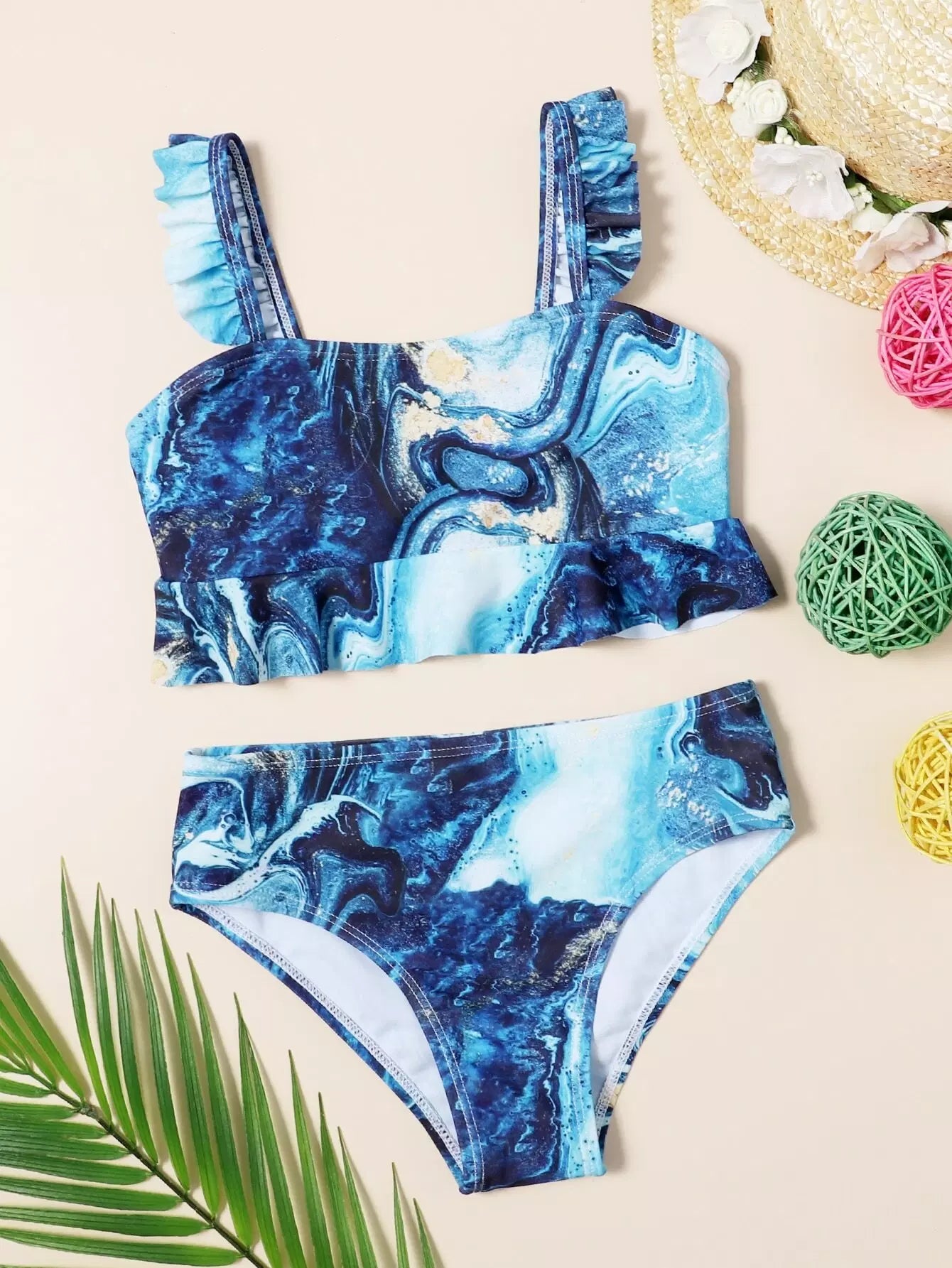ملابس سباحة بيكيني بناتي بطبعة رخام مكشكشة للبنات