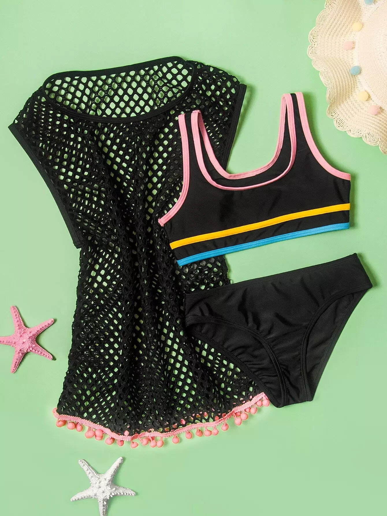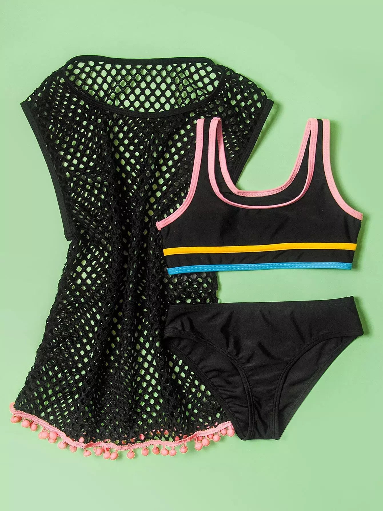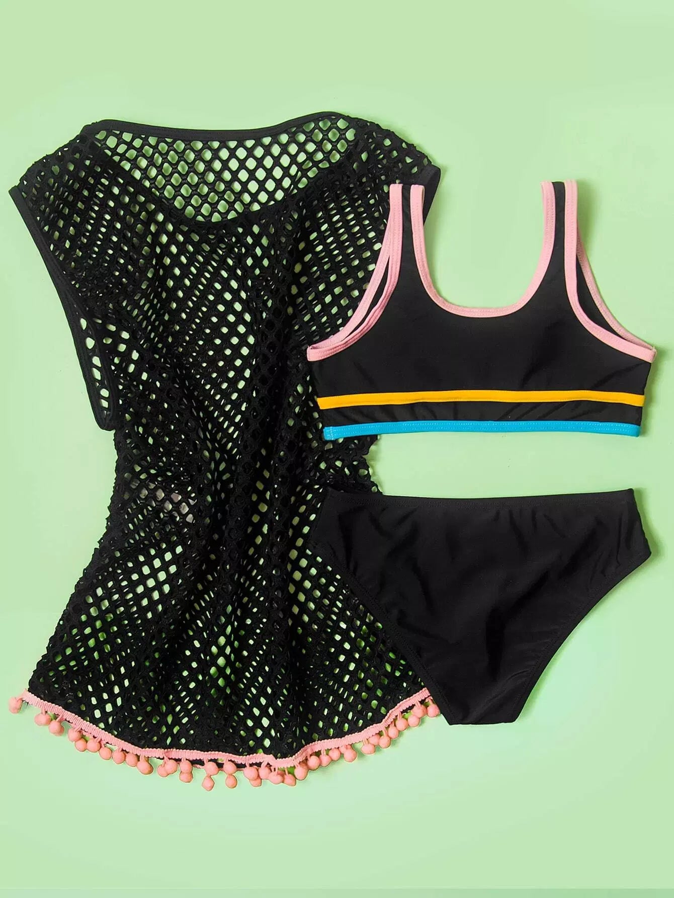 3 عبوات ملابس سباحة بيكيني للبنات وغطاء سباحة بشبكة صيد السمك
