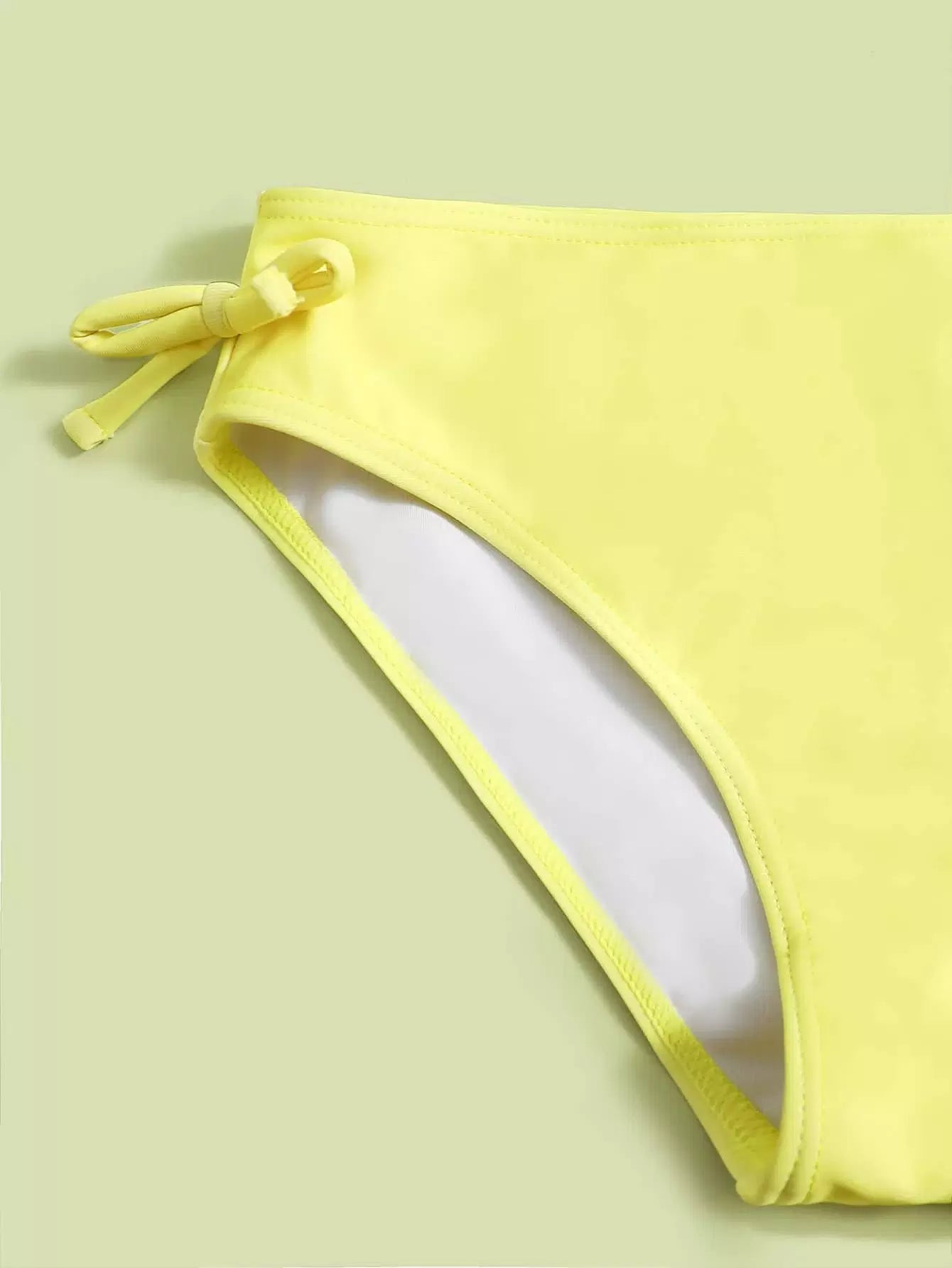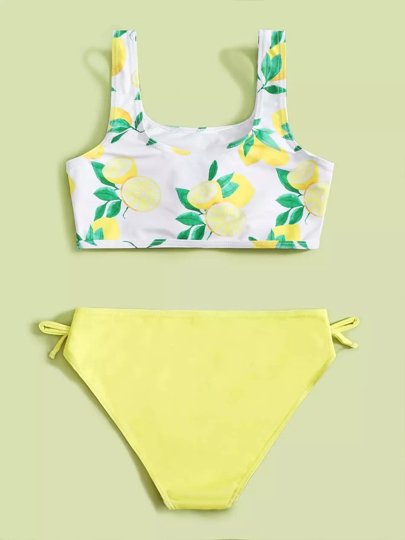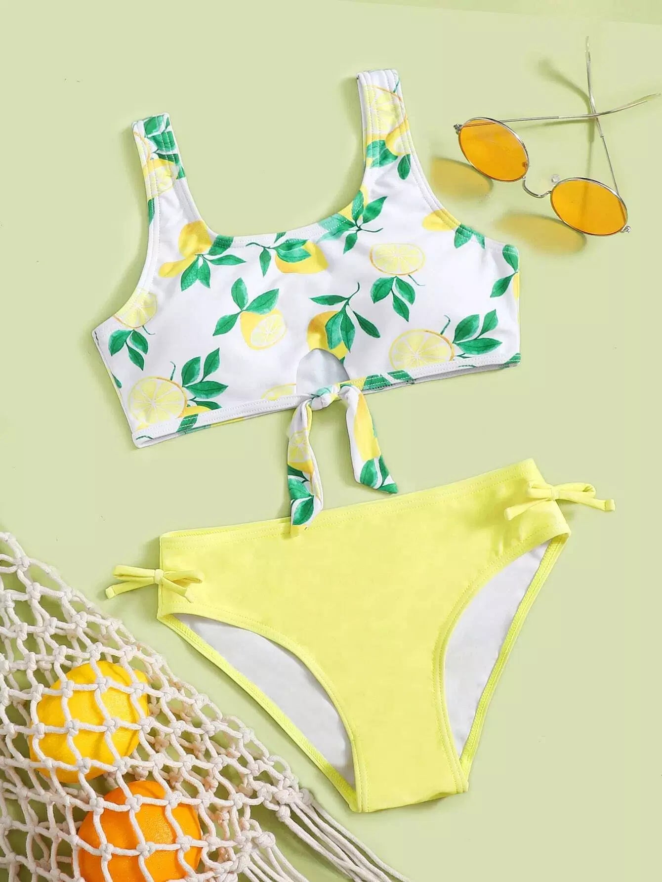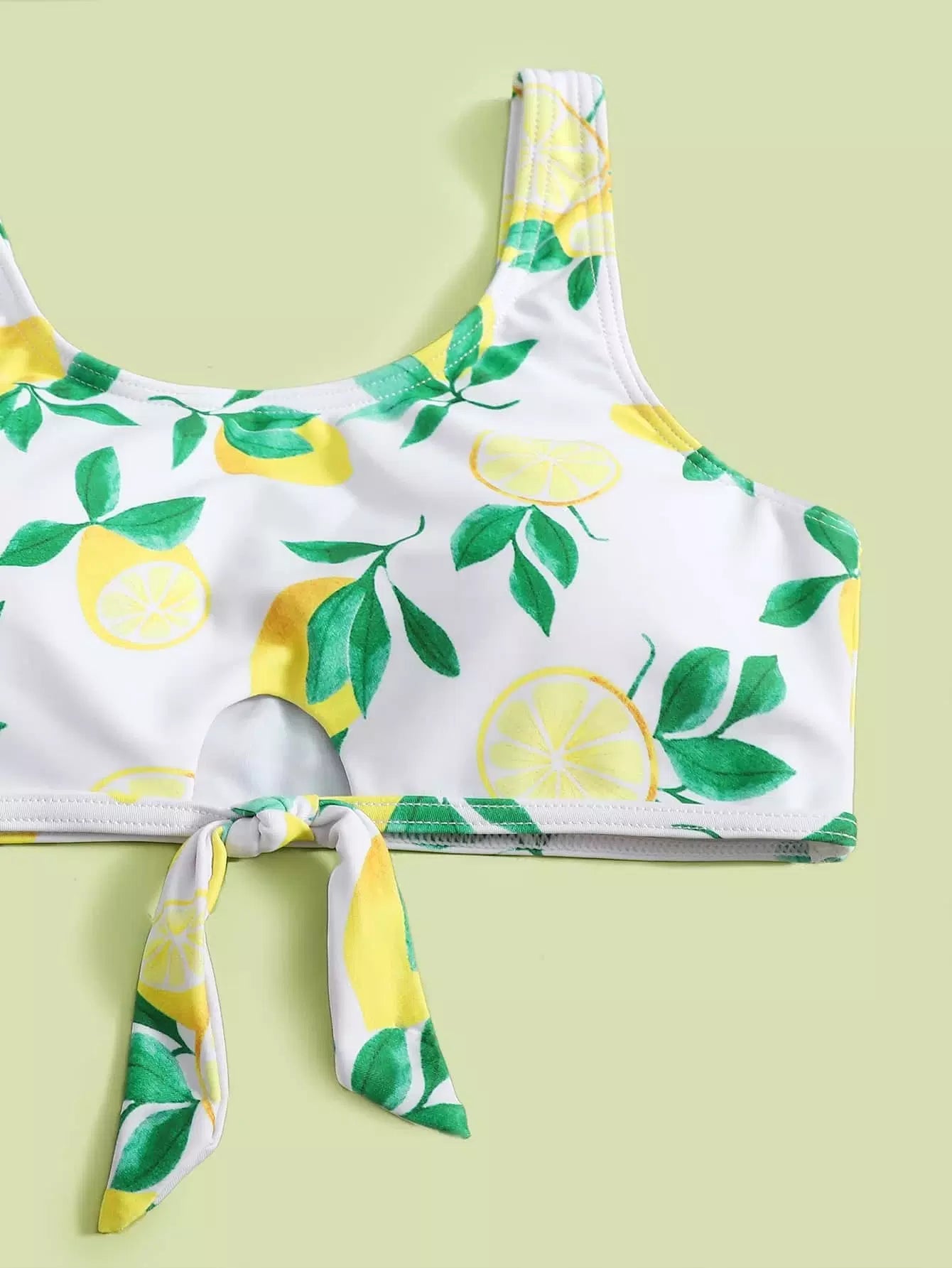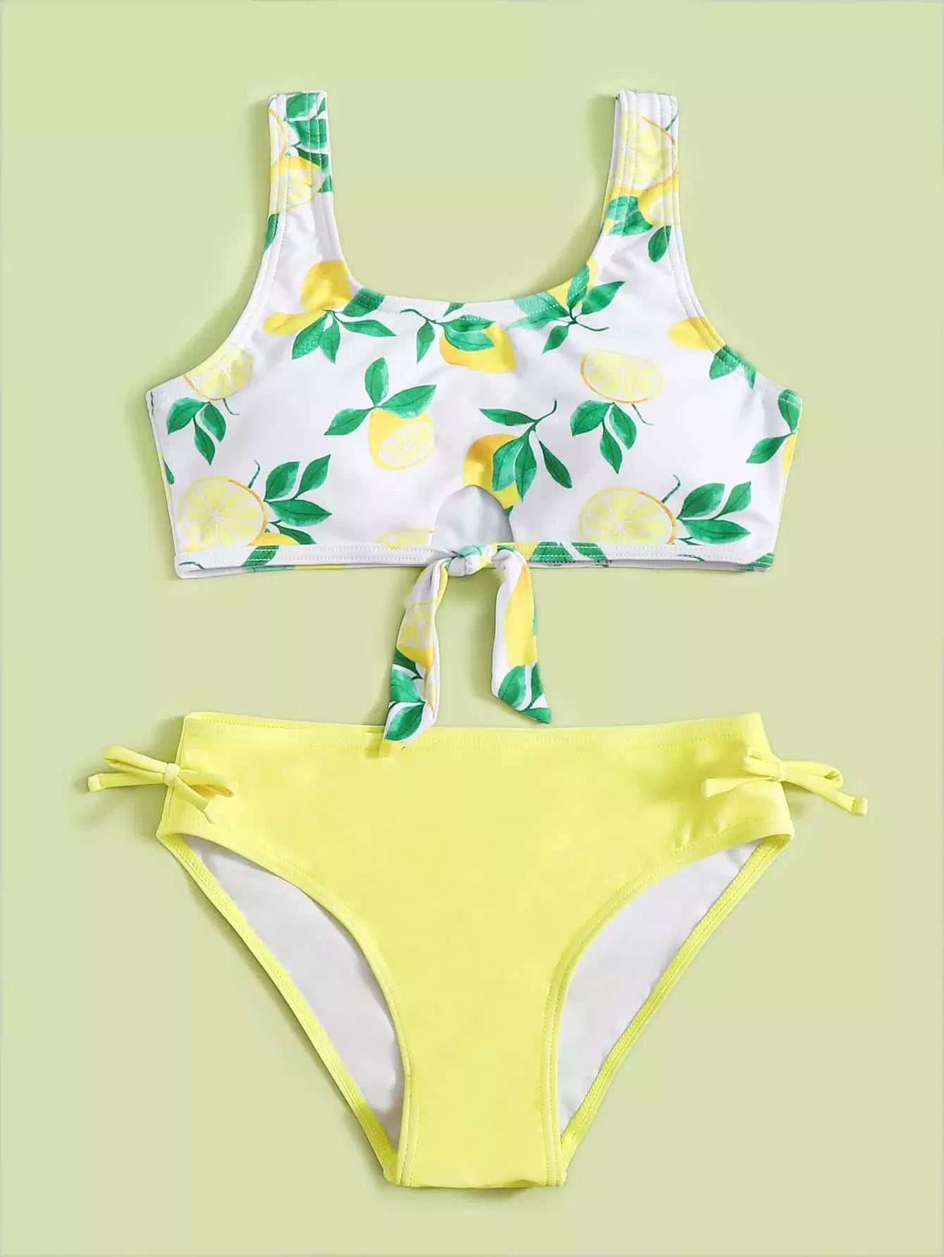 ملابس سباحة بيكيني بناتي بطبعة ليمون بحافة عقدة ليمون
