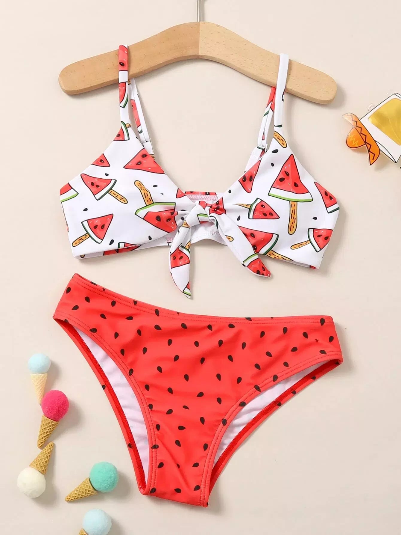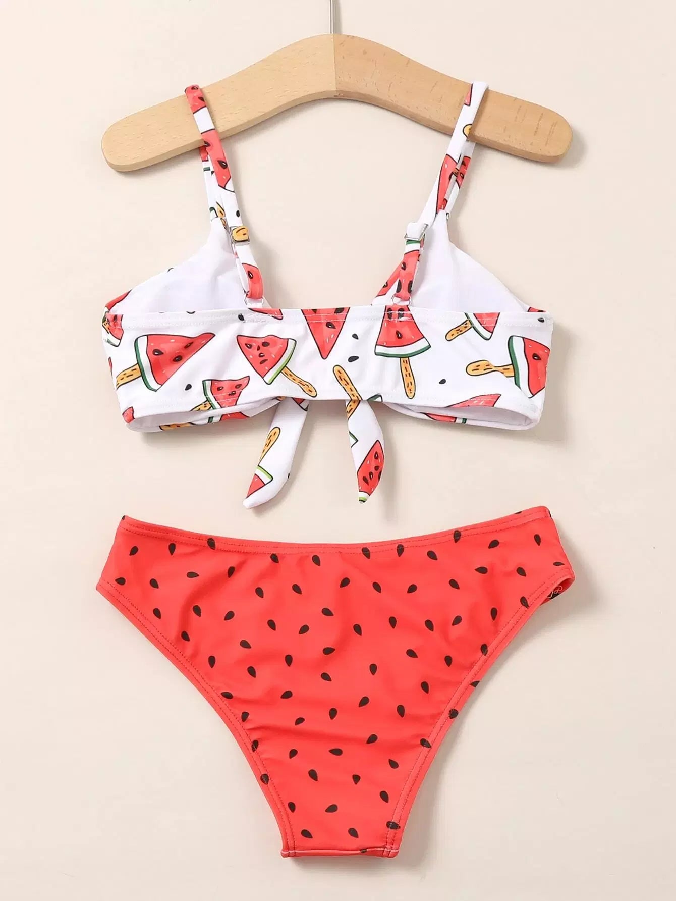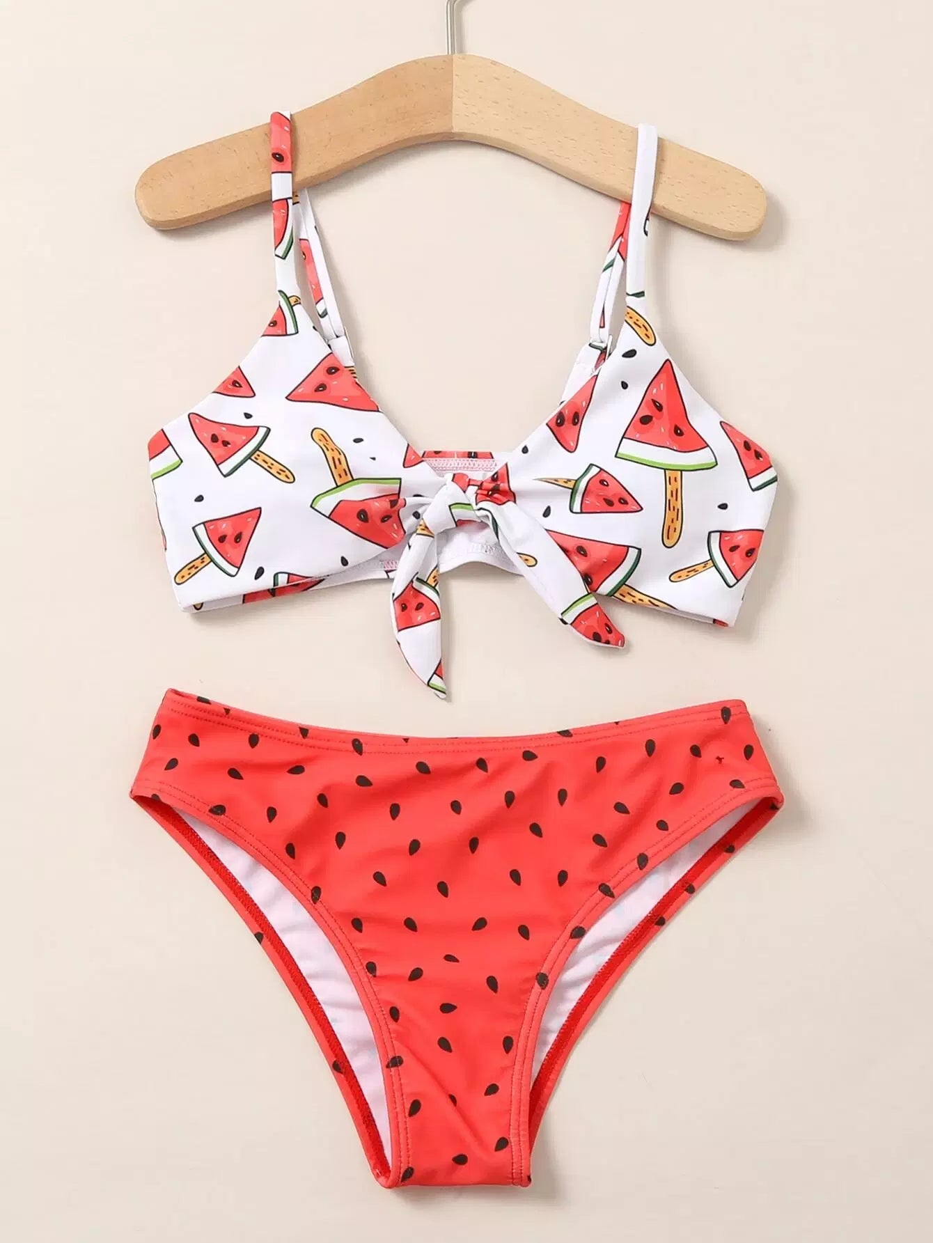 مايوه سباحة بيكيني للبنات بطبعة بطيخة بعقدة من الأمام