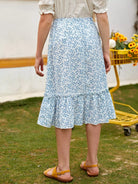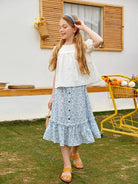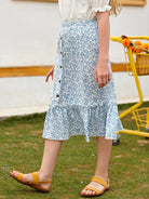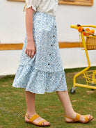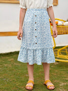 تنورة بناتية مزينة بنقشة الزهور مع أزرار أمامية وحاشية مكشكشة