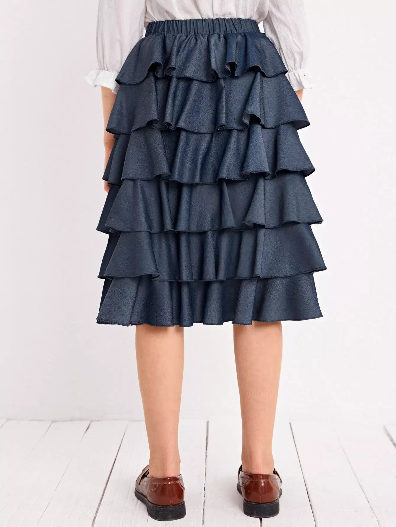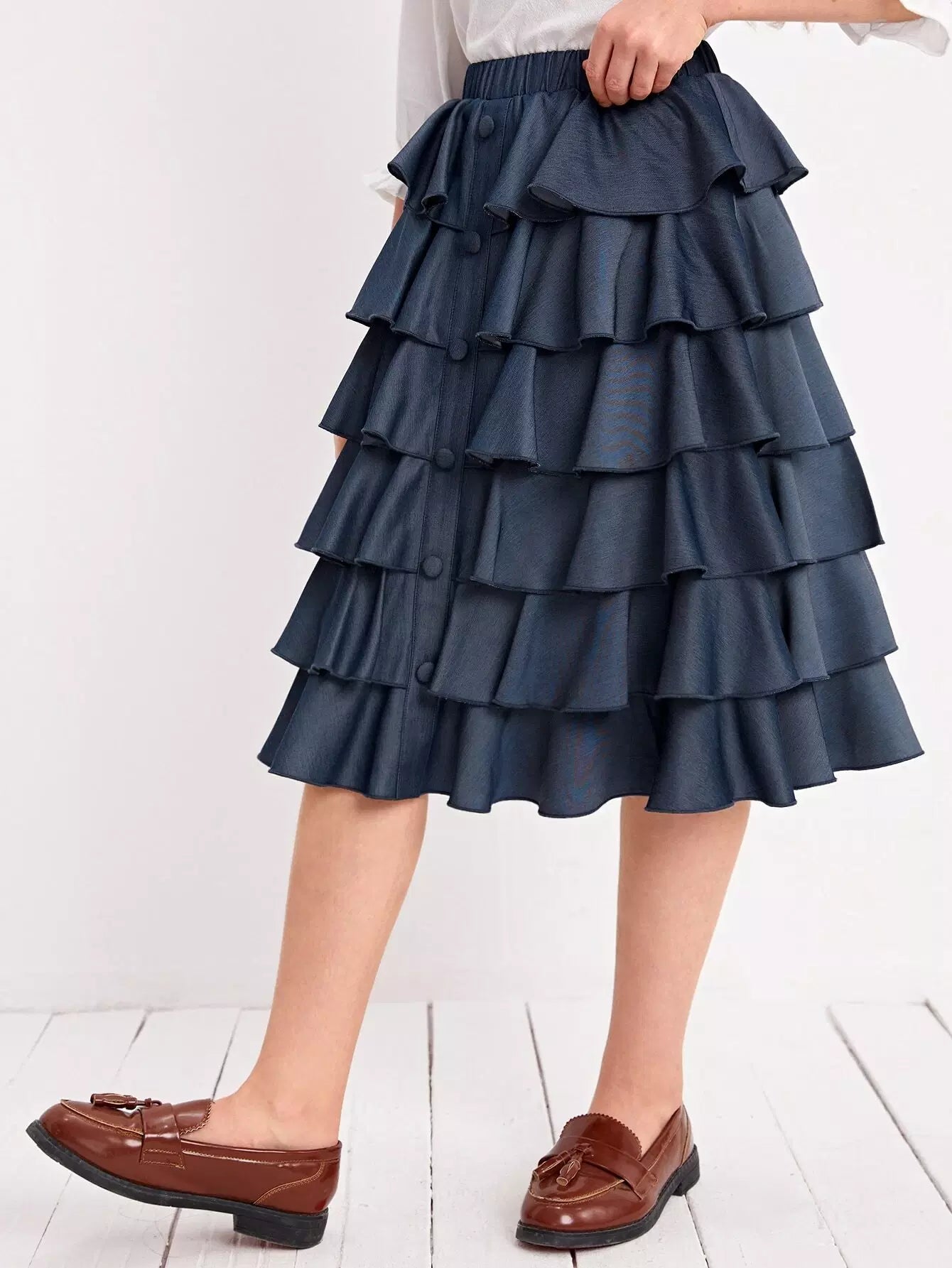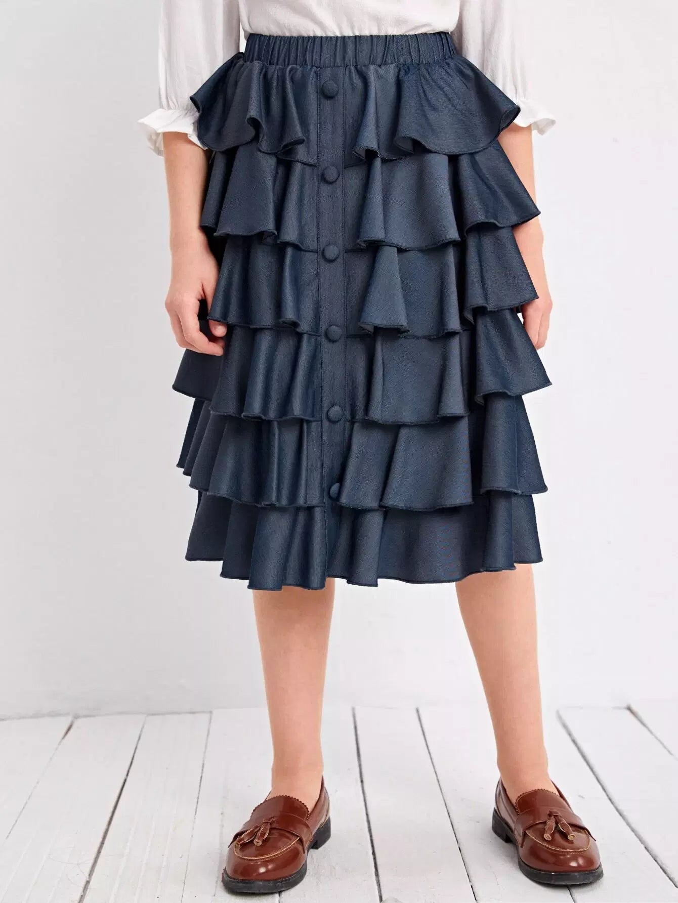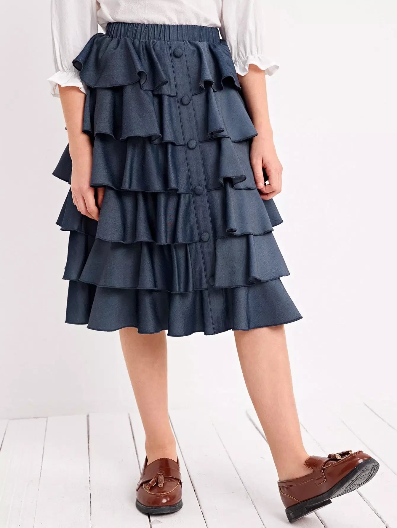 تنورة بناتية ذات صدر واحد وطبقات أمامية وحواف مكشكشة