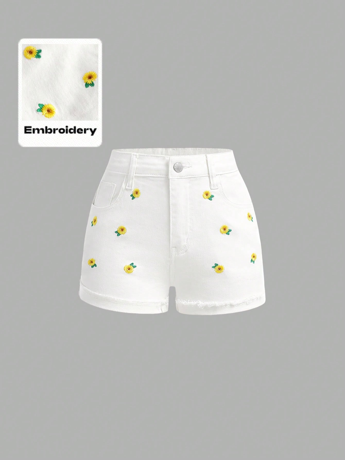 شورت جينز أبيض قصير مطرز بنقشة زهور الأقحوان الصيفية للفتيات المراهقات، ذو حافة مطوية، سهل الارتداء