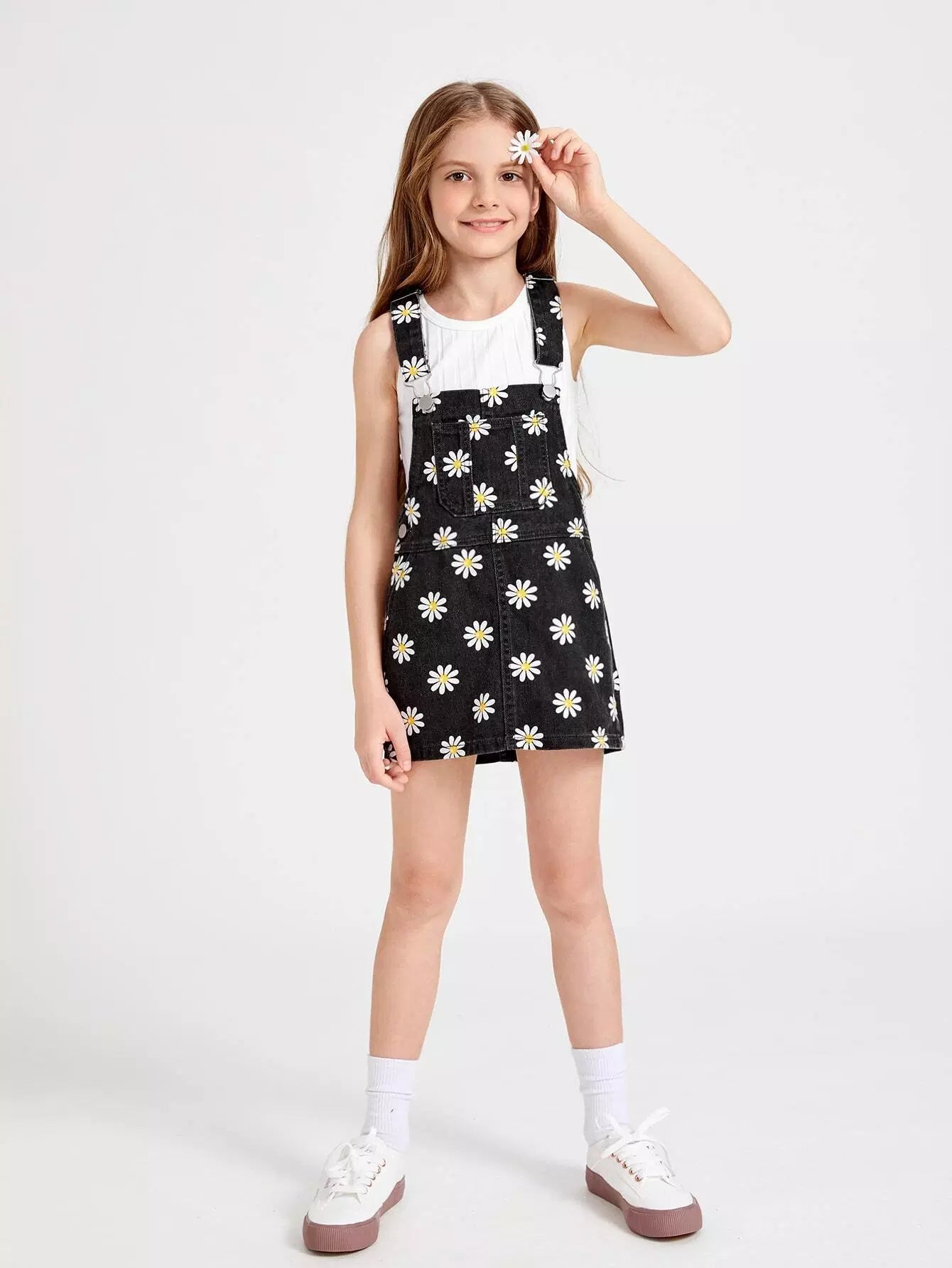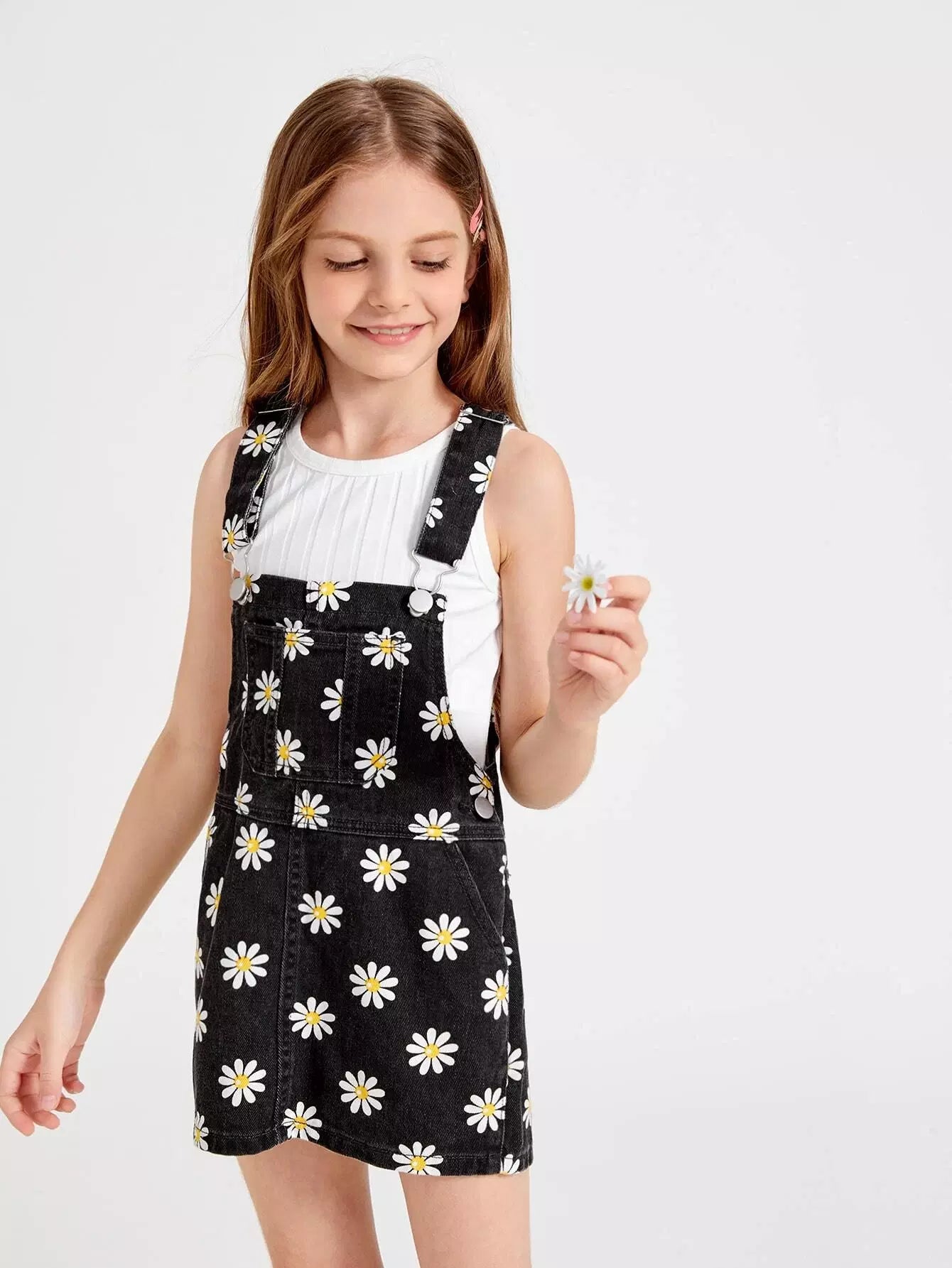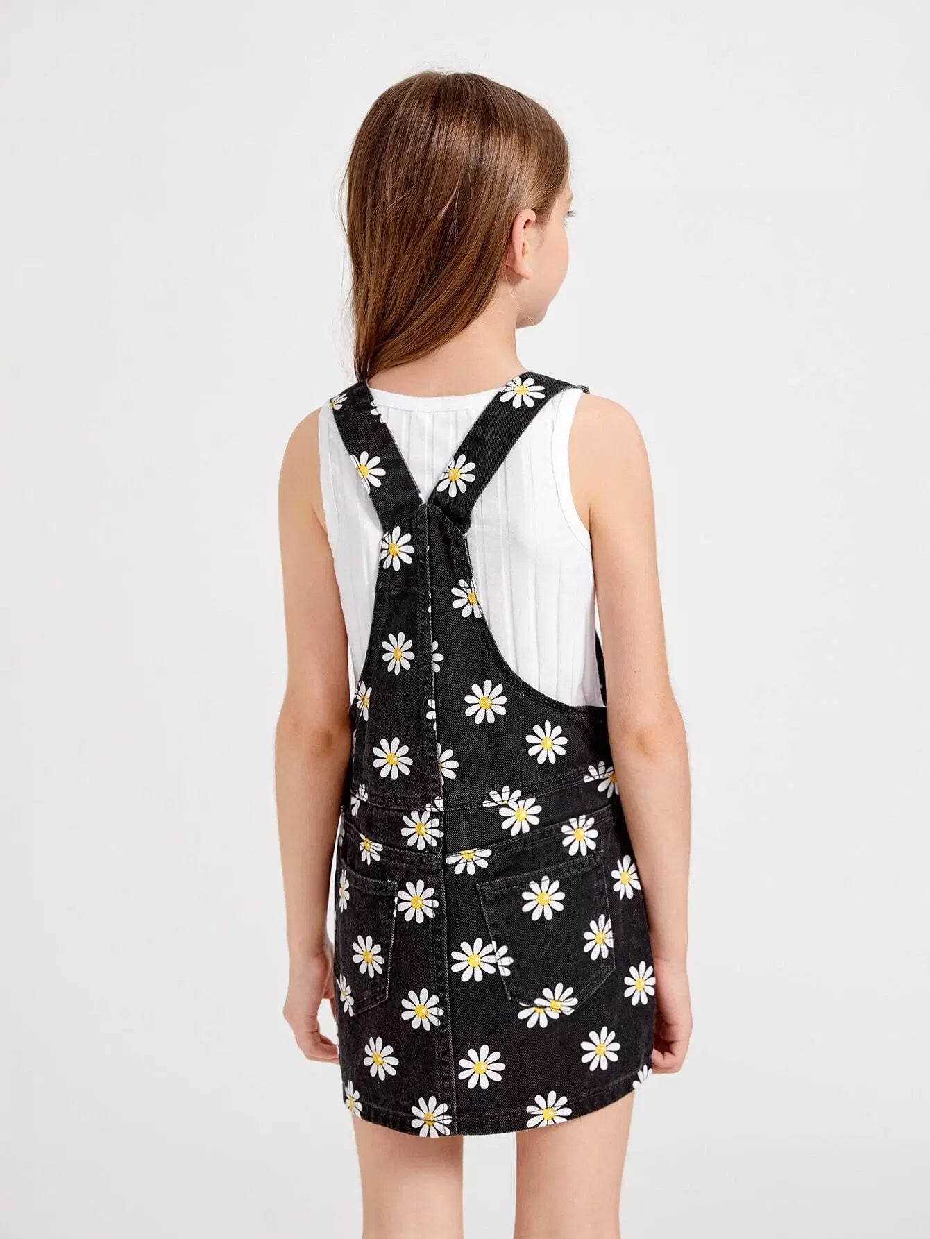 فستان جينز بطبعة زهور مع جيب أمامي للفتيات