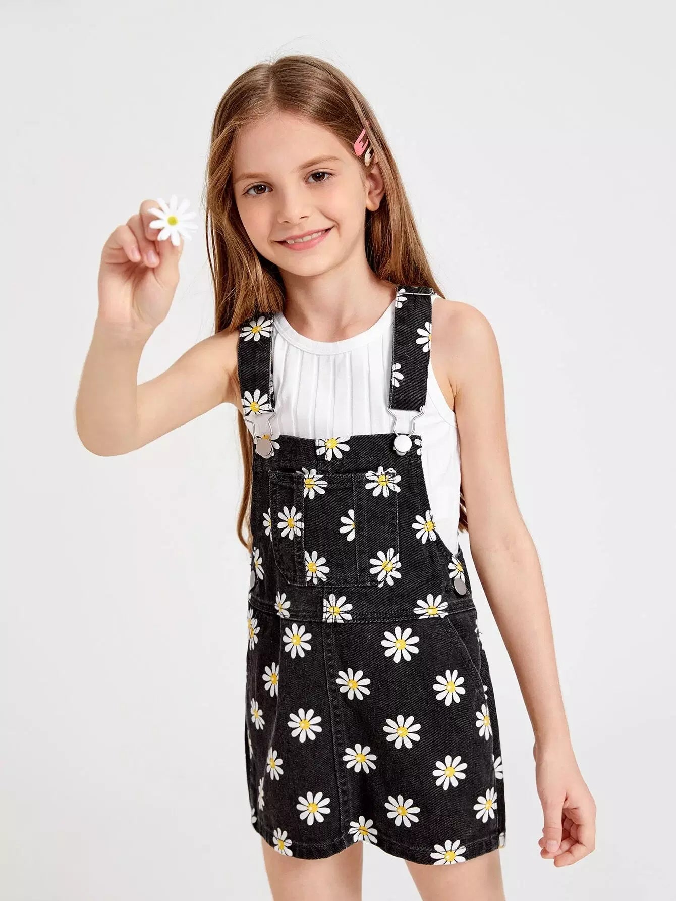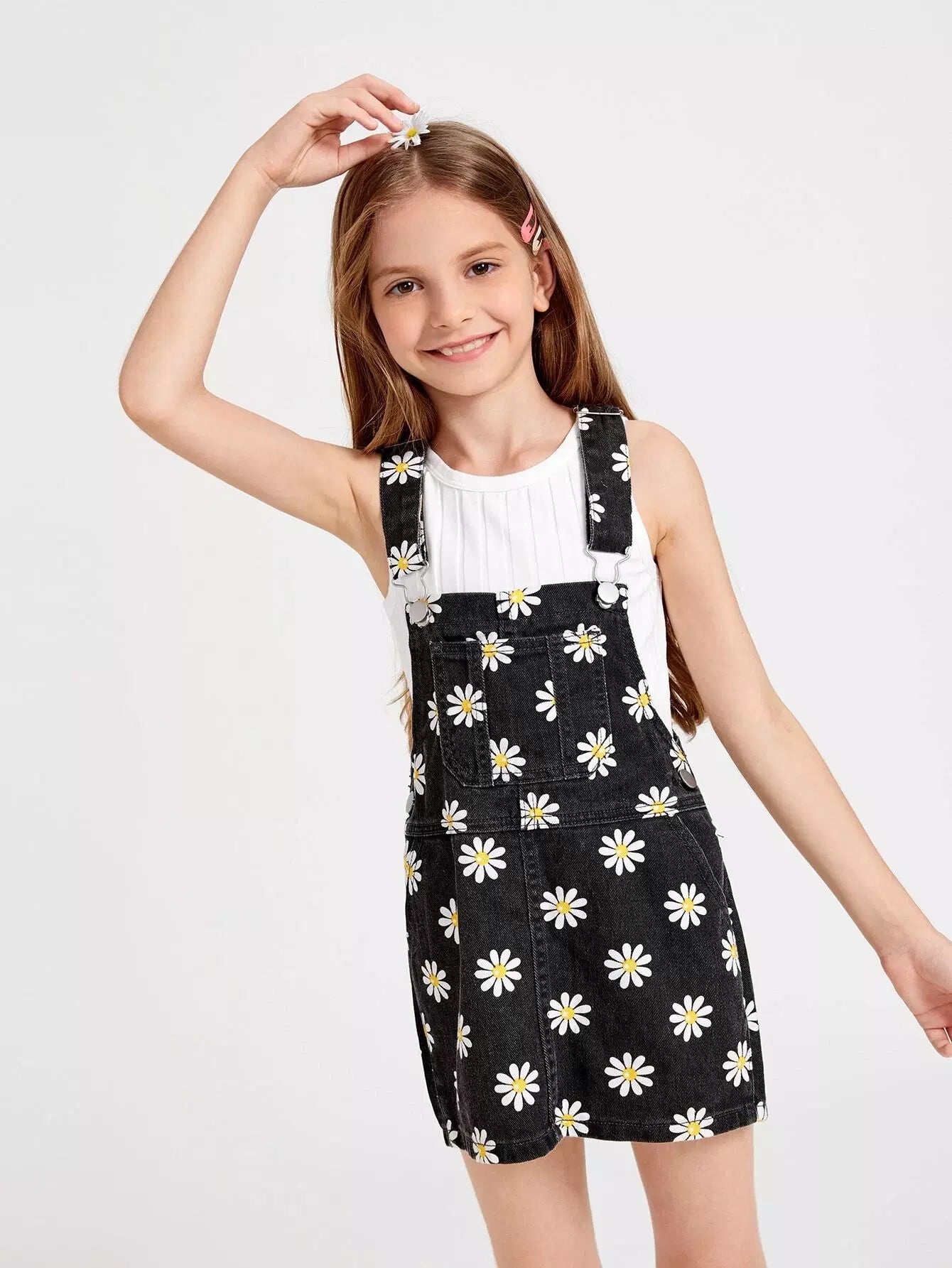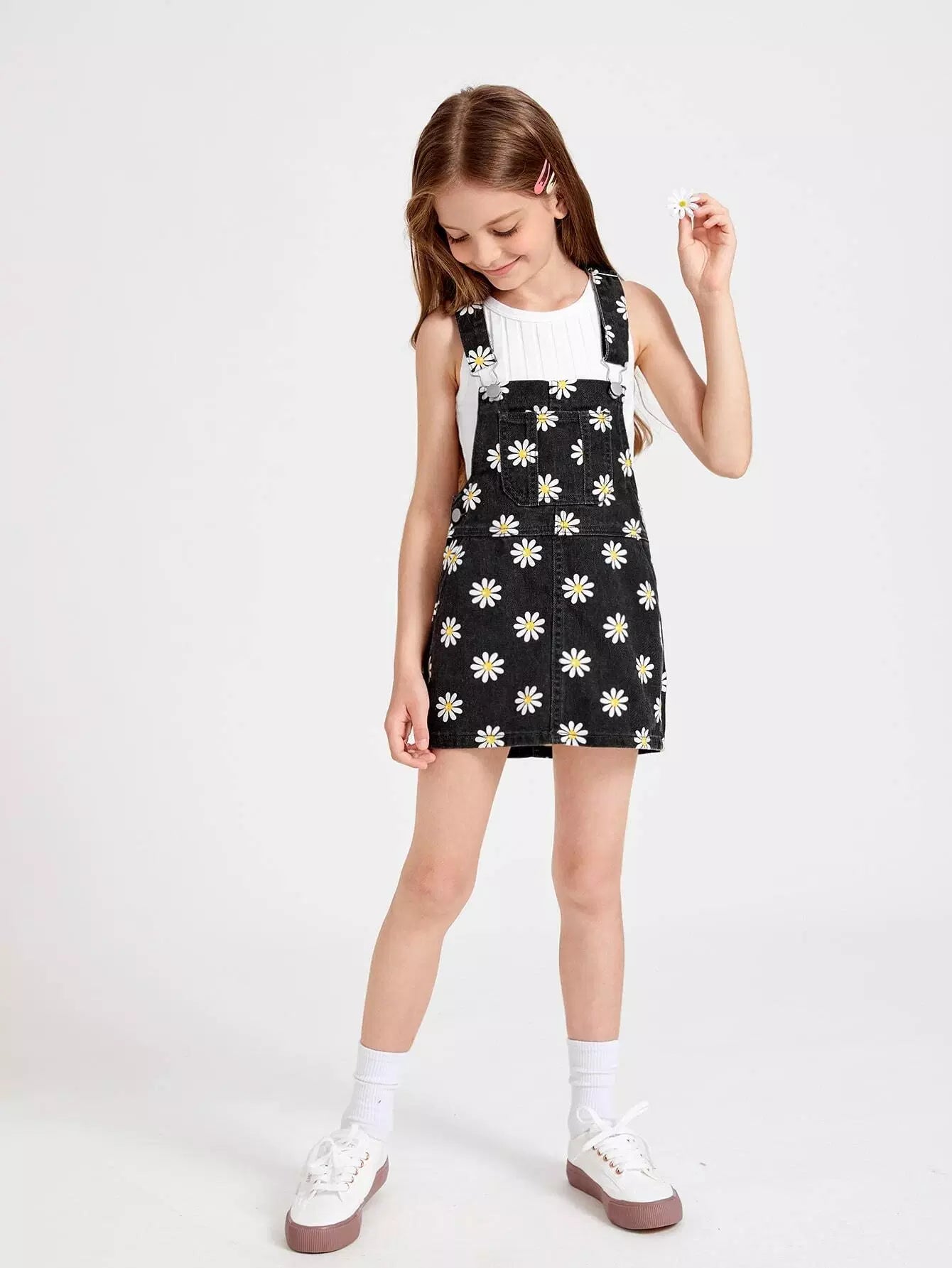 فستان جينز بطبعة زهور مع جيب أمامي للفتيات