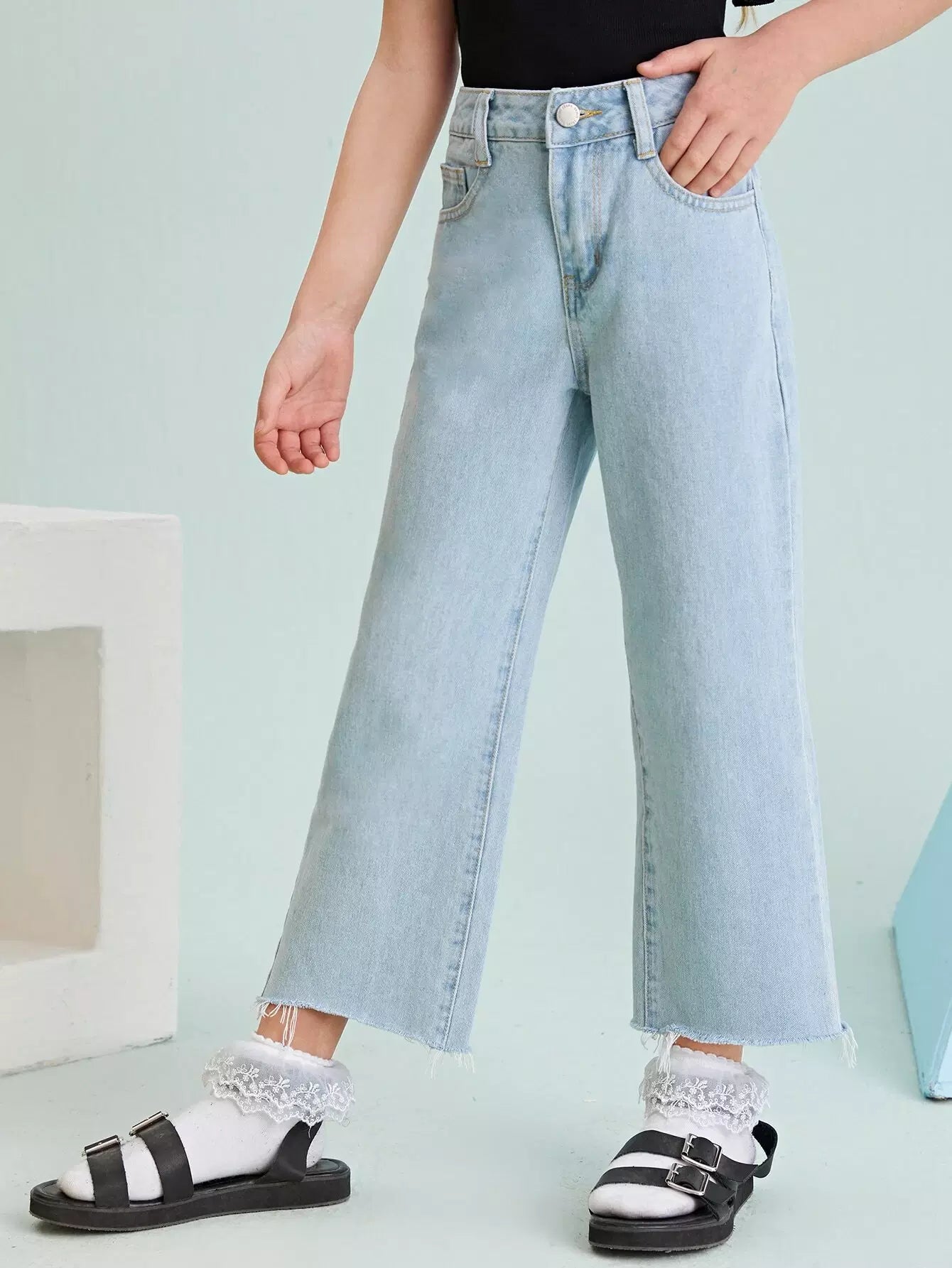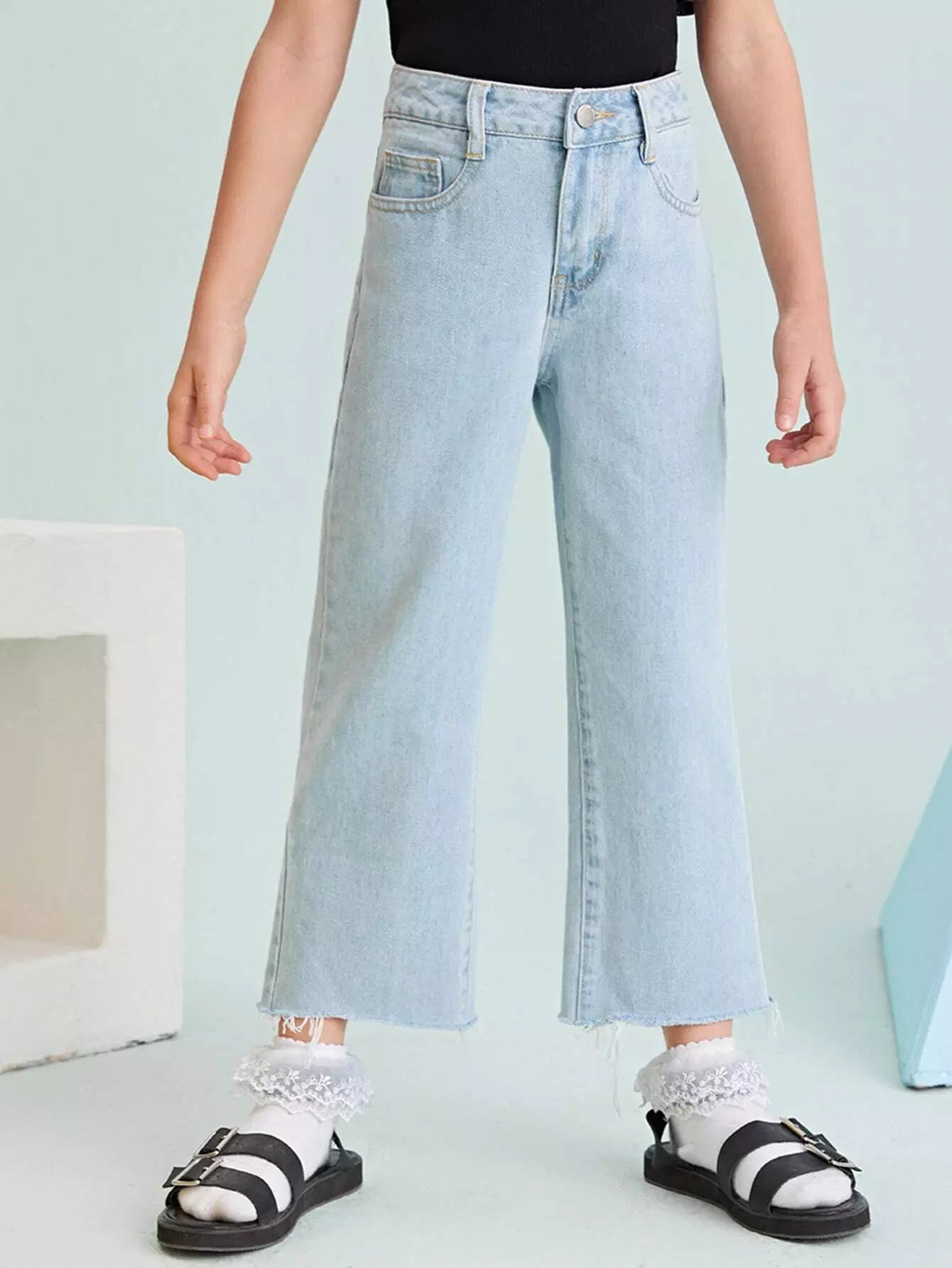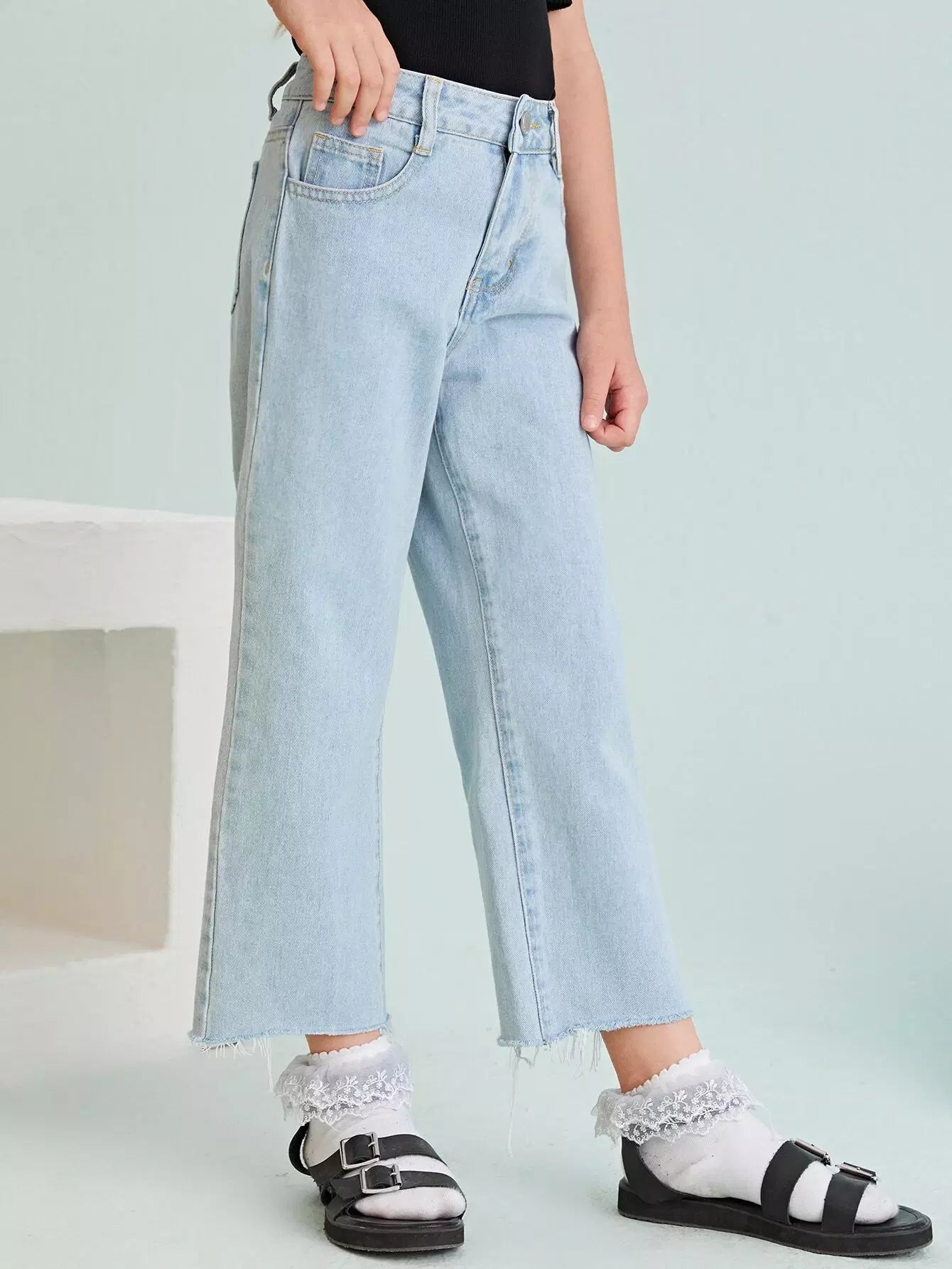 بنطلون جينز بناتي بخصر مرتفع وحافة خام