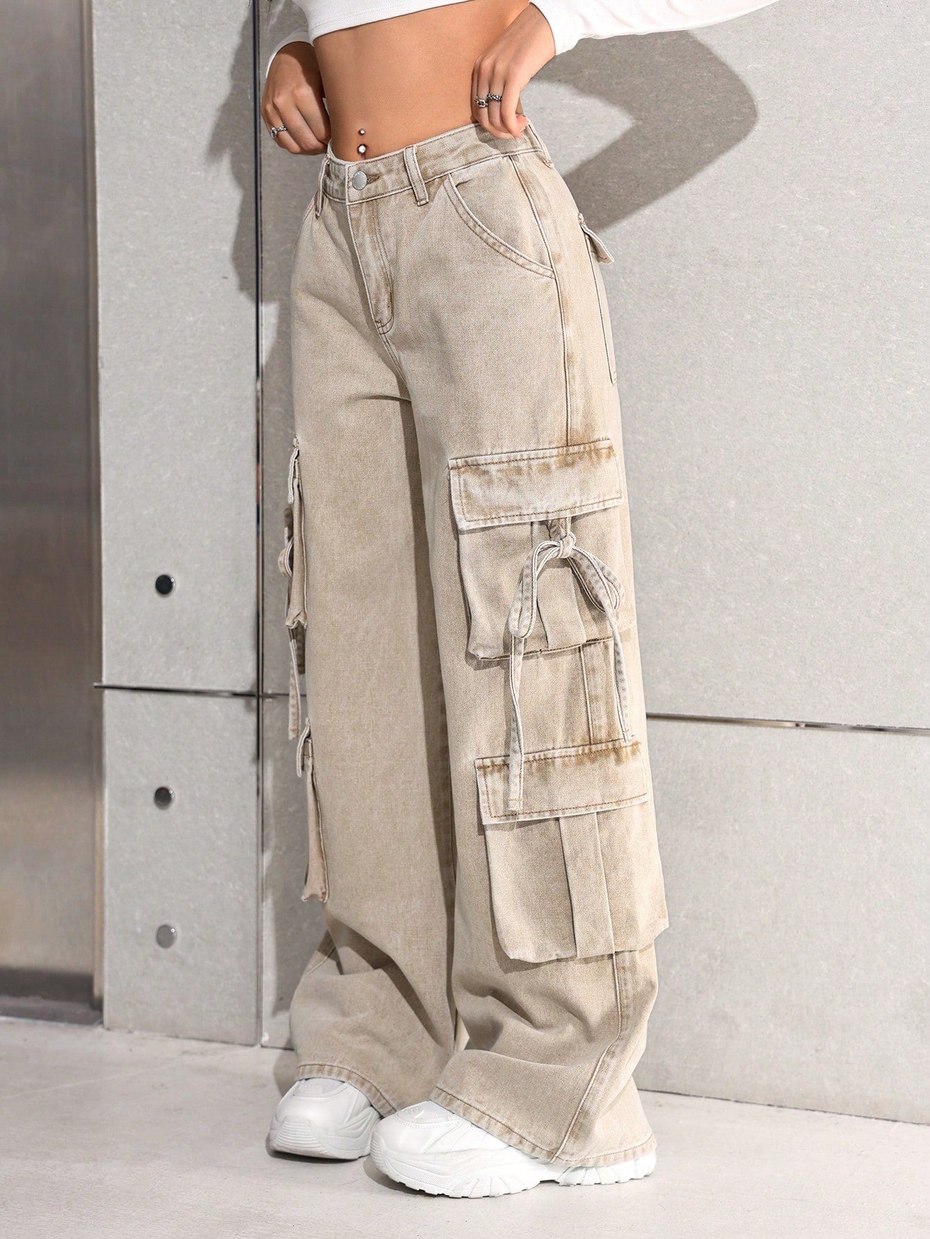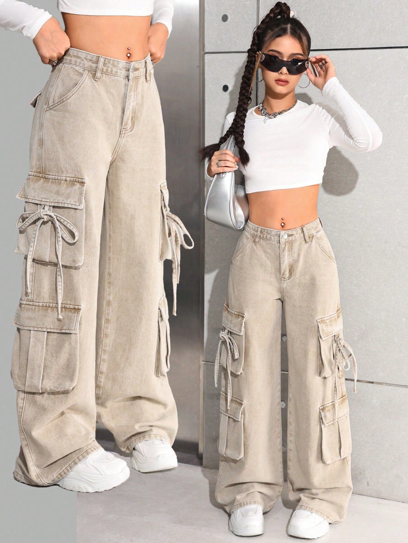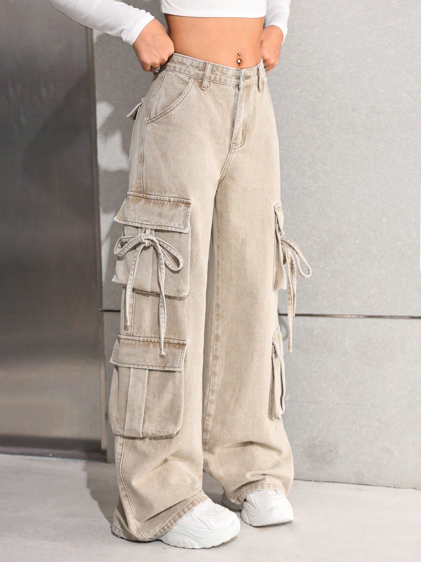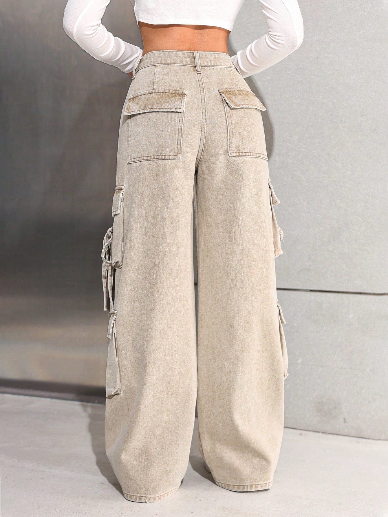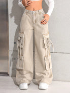 بنطلون جينز كارغو واسع الساقين بخصر عالٍ، بتصميم عصري مناسب للفتيات المراهقات، مستوحى من موضة الألفية الجديدة، مع جيوب عملية.