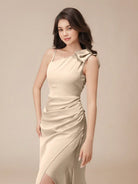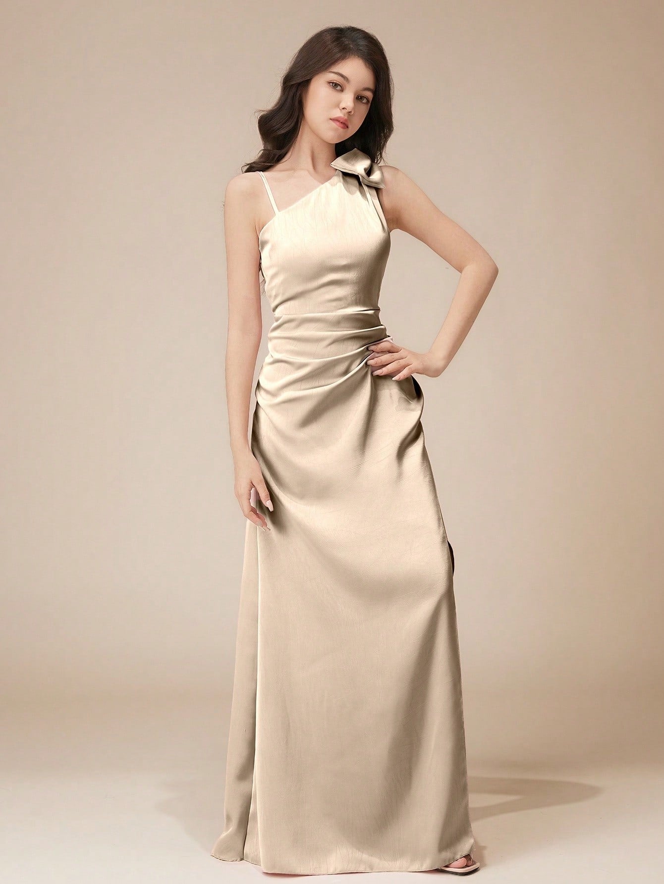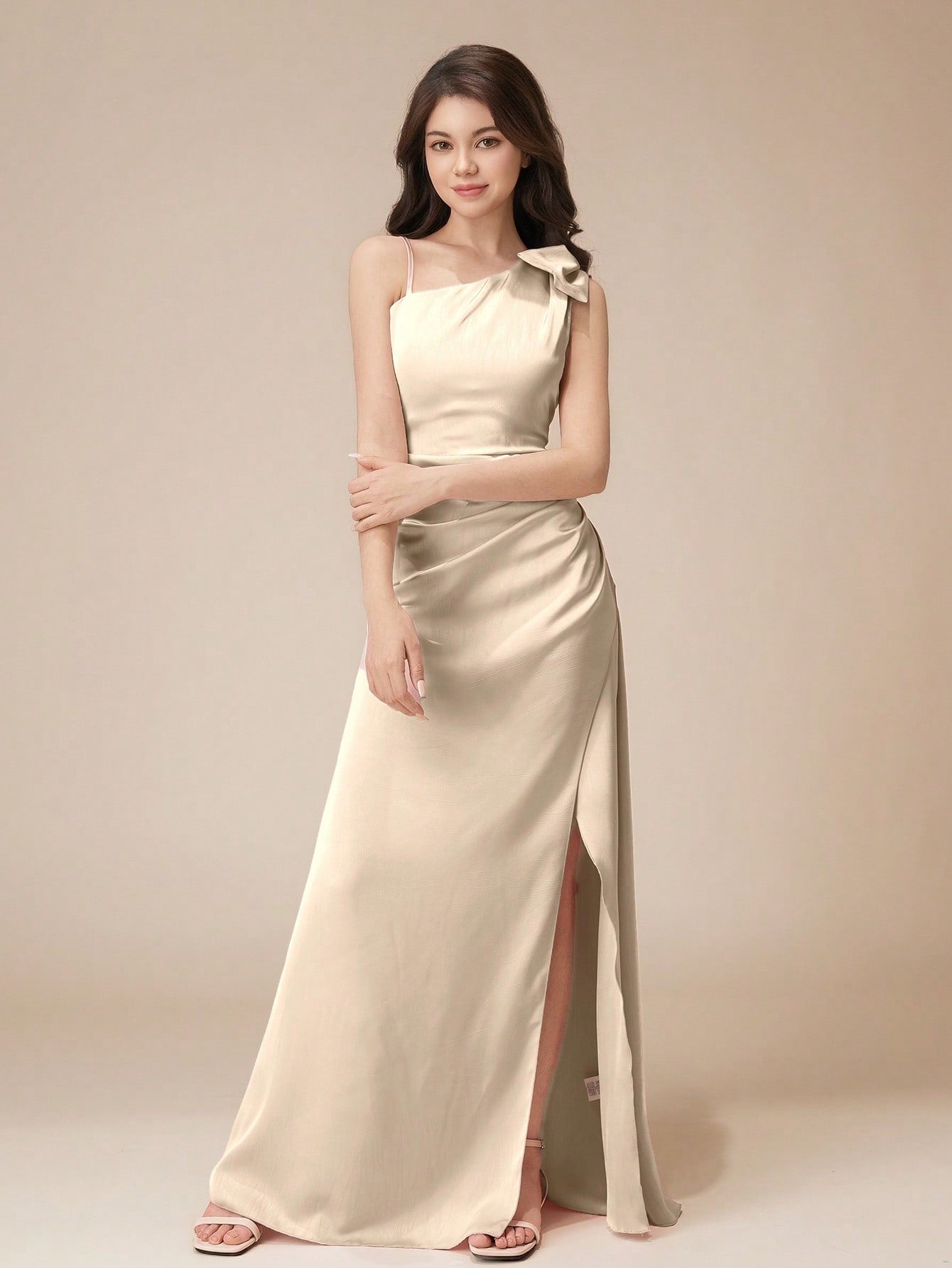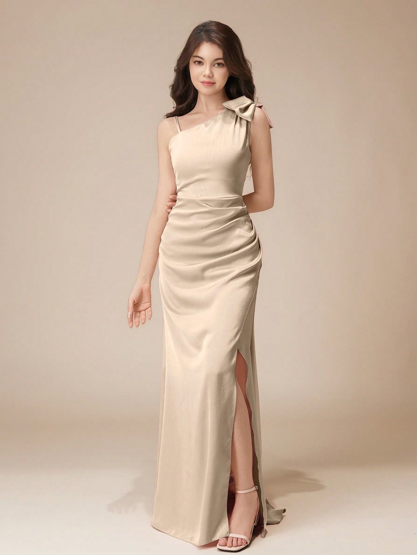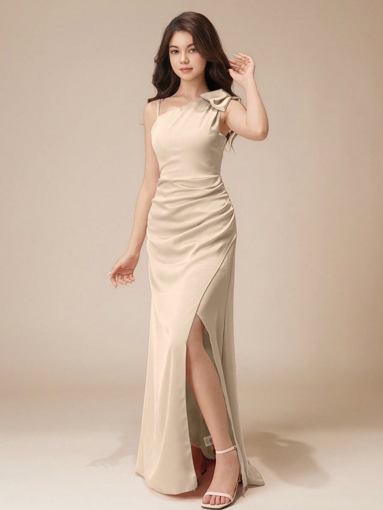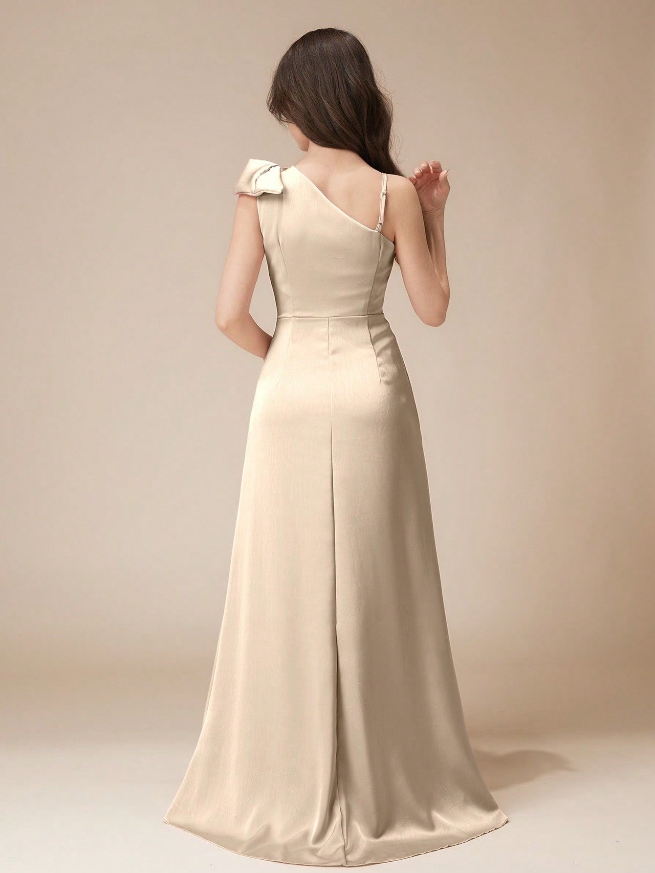 Bridesmaid High-Quality Sense Teen Girl One Shoulder Bow Pleated Split Dress, Suitable For Weddings,