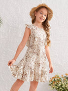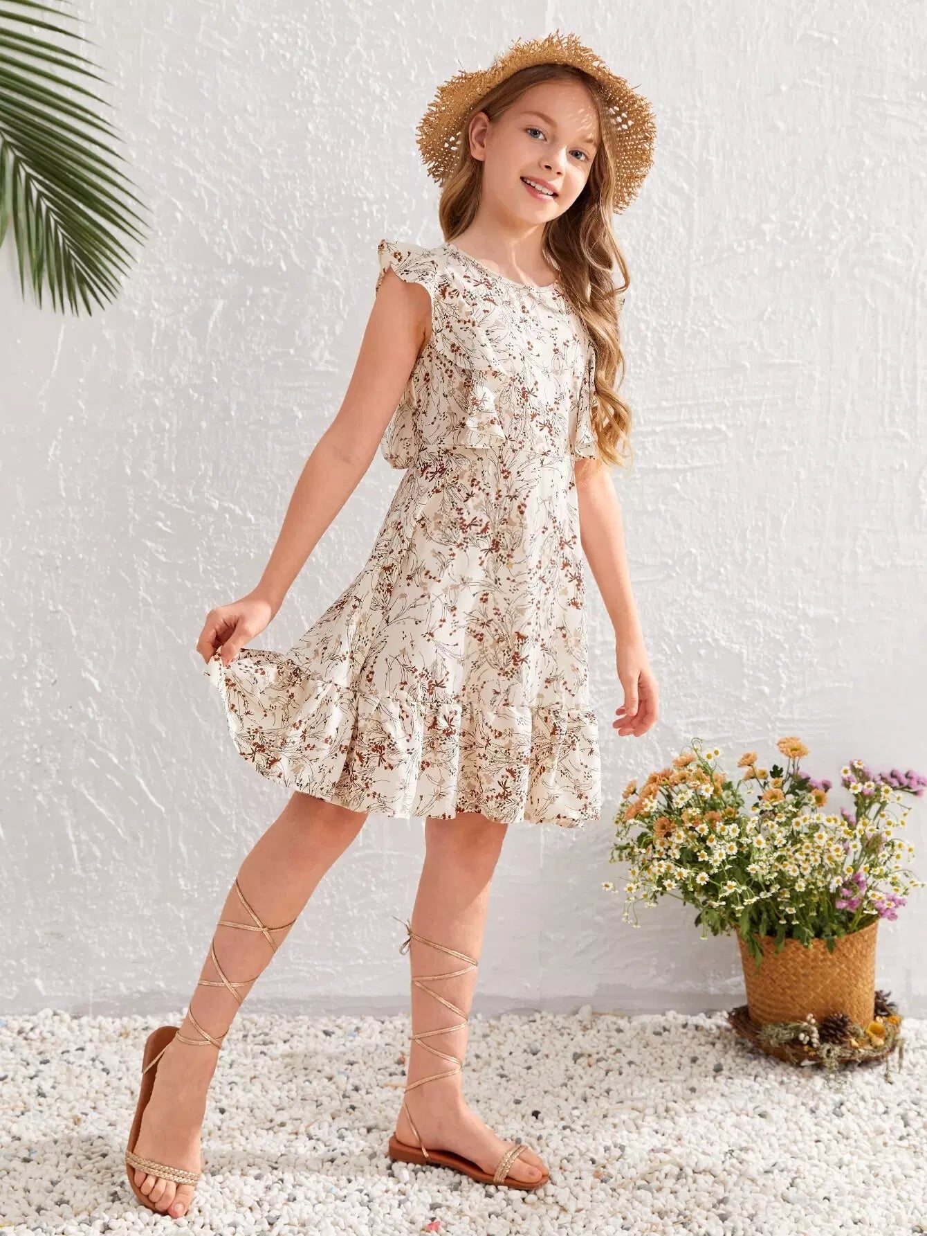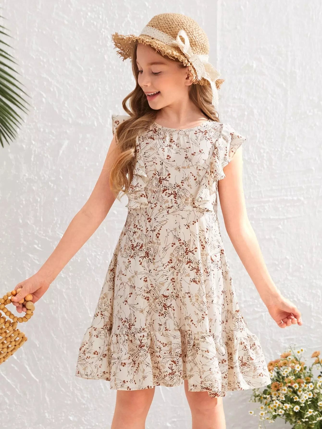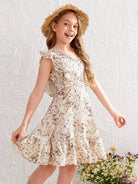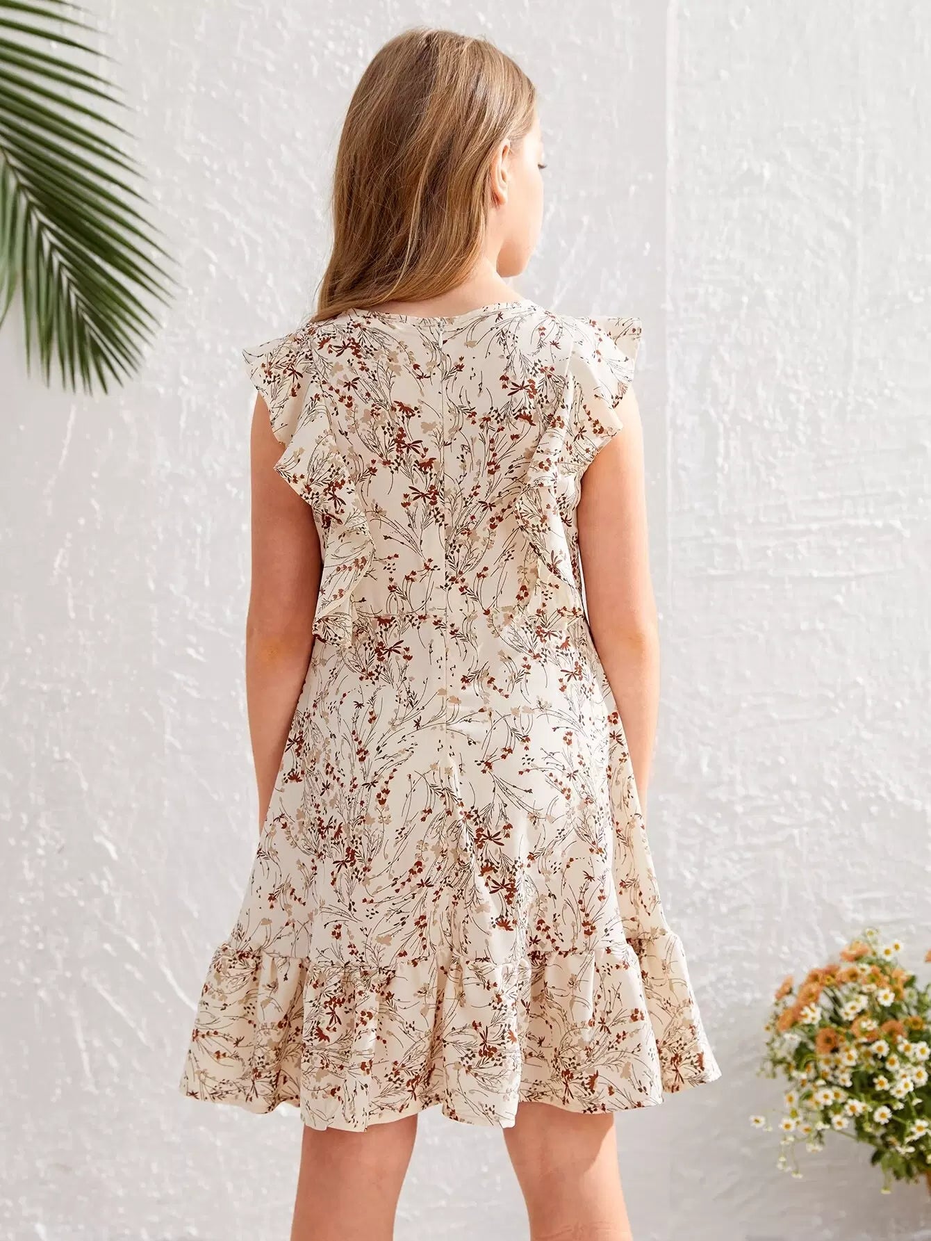 فستان بناتي بطبعات نباتات كاملة مع حافة مكشكشة