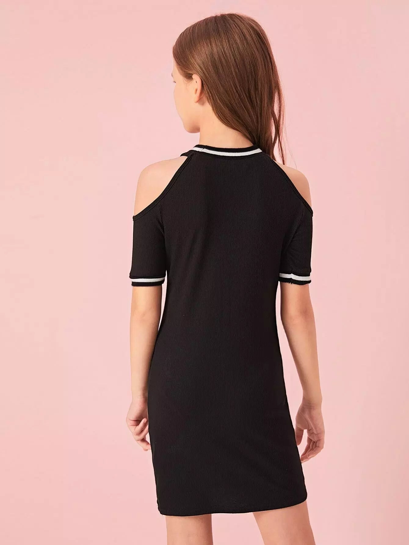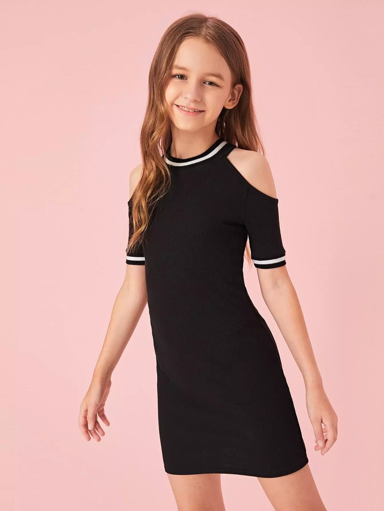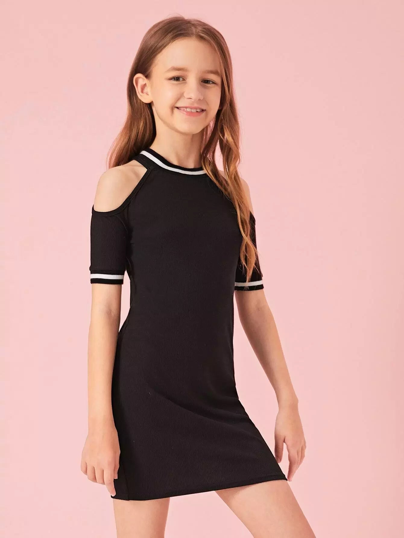 فستان بناتي مكشوف الكتفين بخطوط متباينة