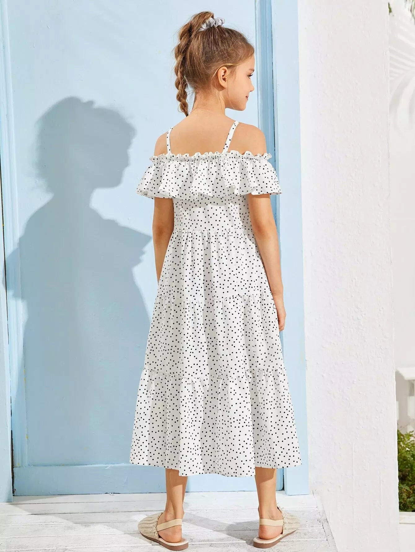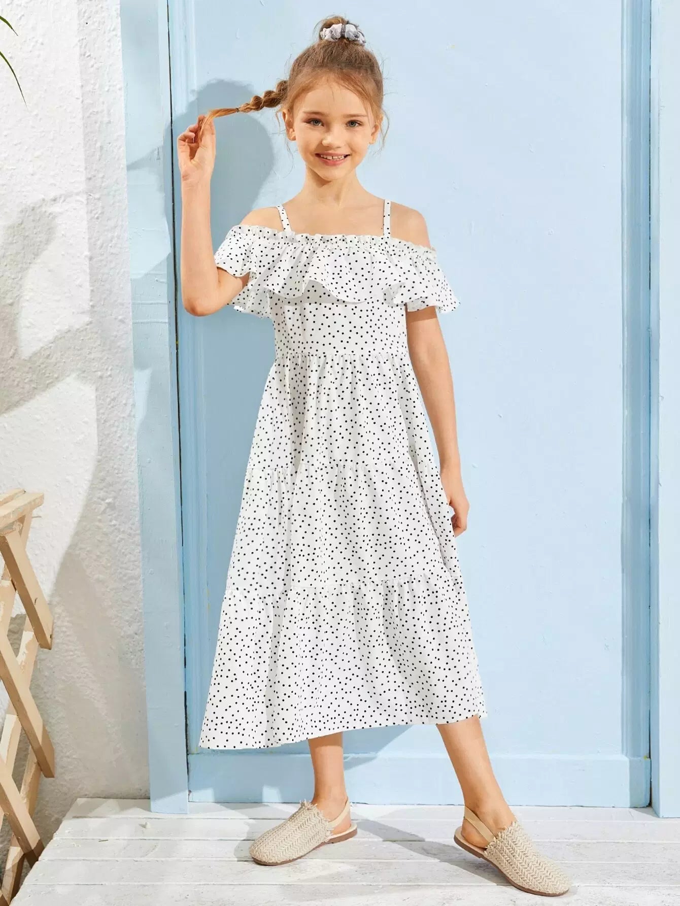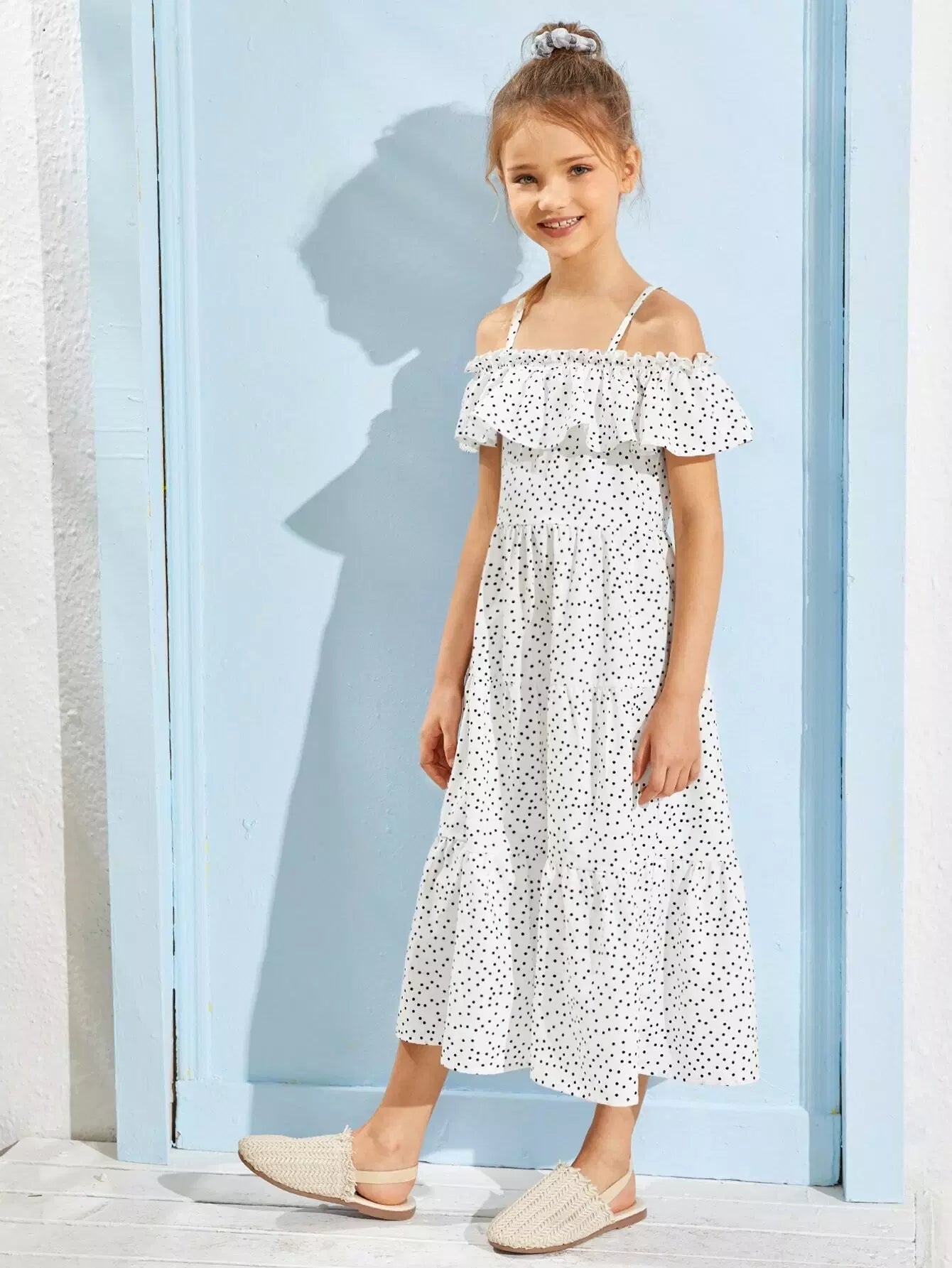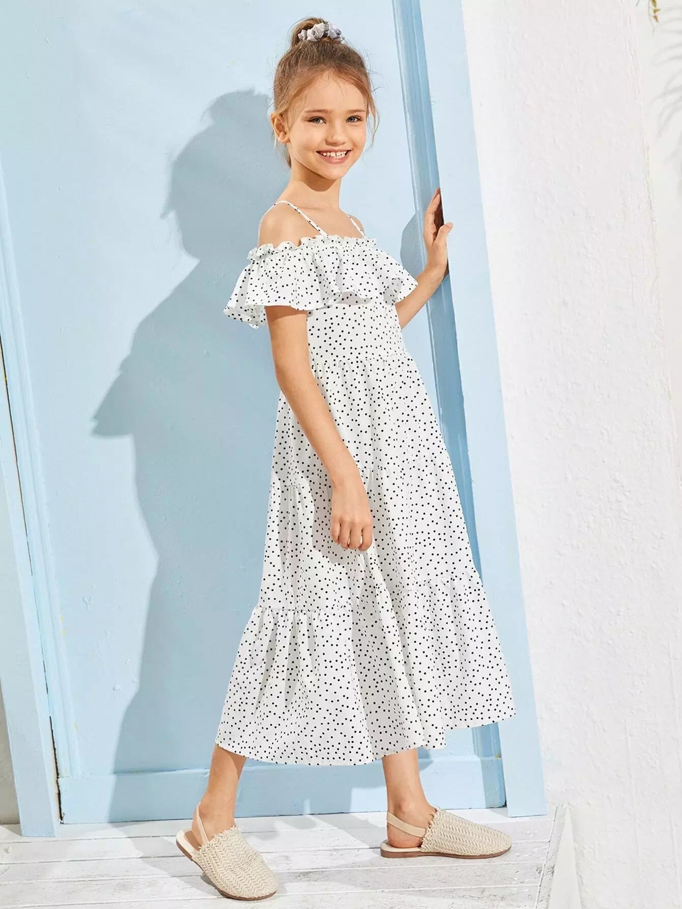 فستان بناتي منقط بقصّة مكشوفة الكتفين